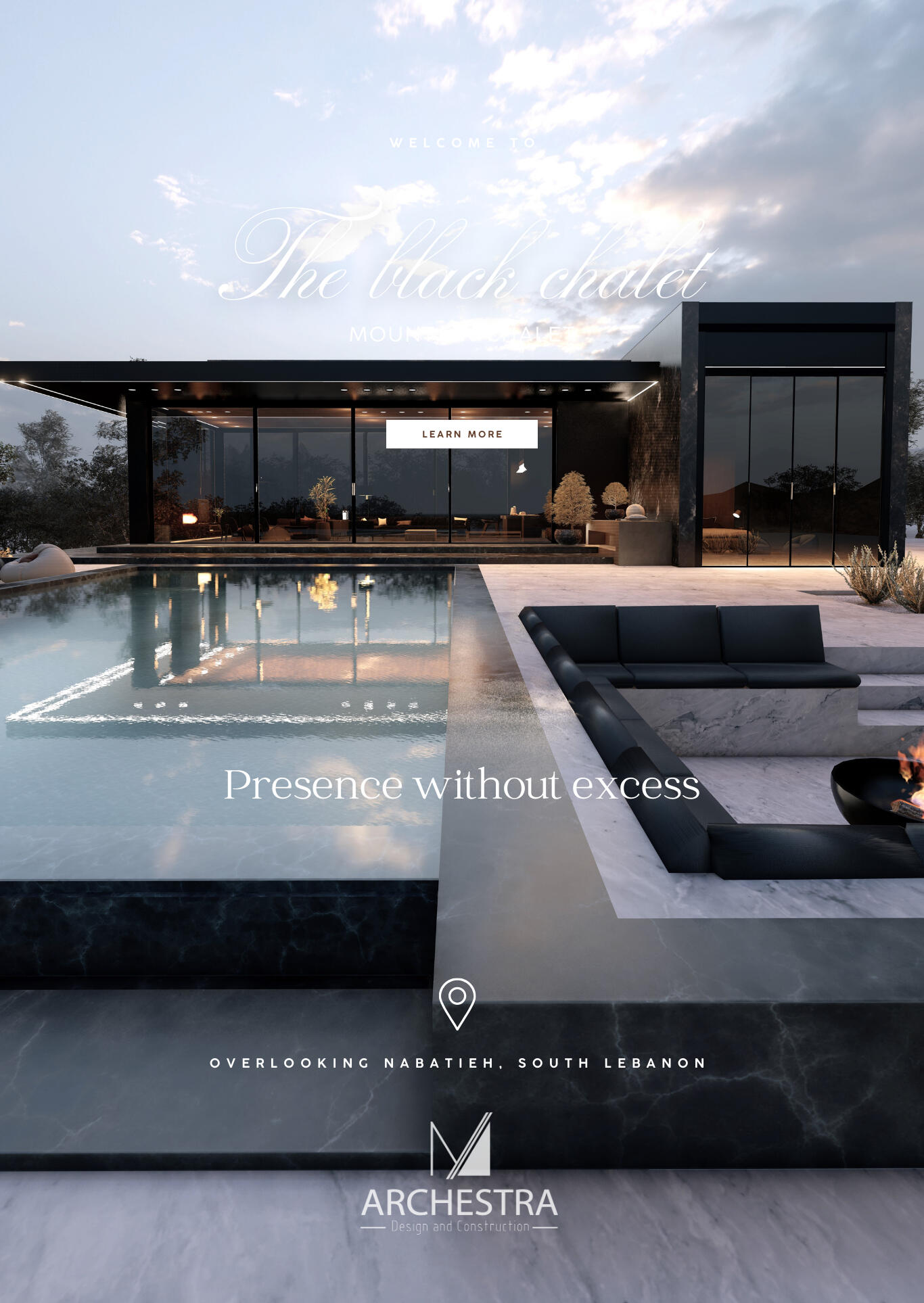 A minimalist modern black chalet defined by clean geometry and a bold monochromatic façade that contrasts elegantly with its natural surroundings. Expansive glass openings frame panoramic mountain views while overlooking a serene pool that reflects both sky and landscape. The design balances simplicity and warmth, creating a refined retreat immersed in nature.