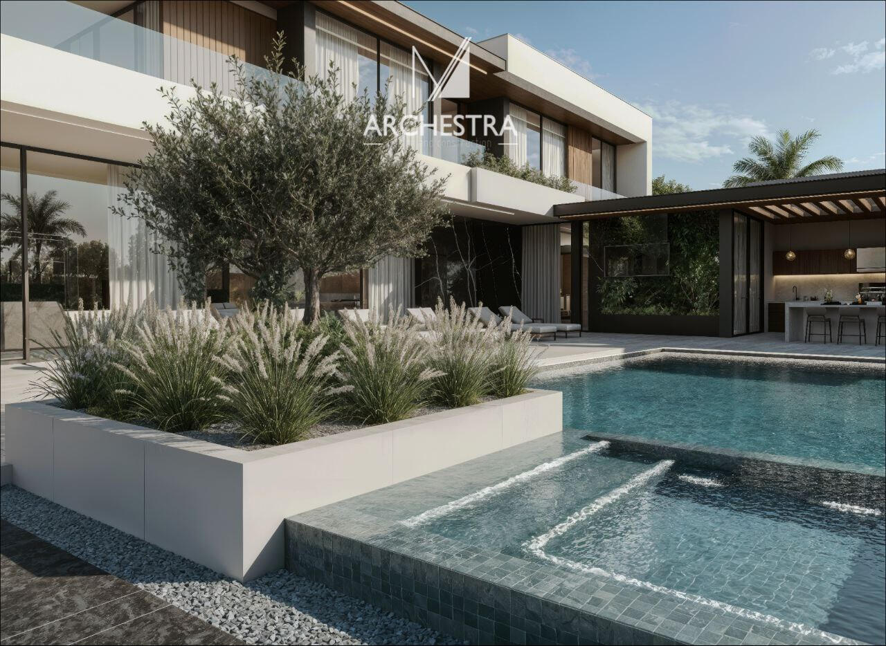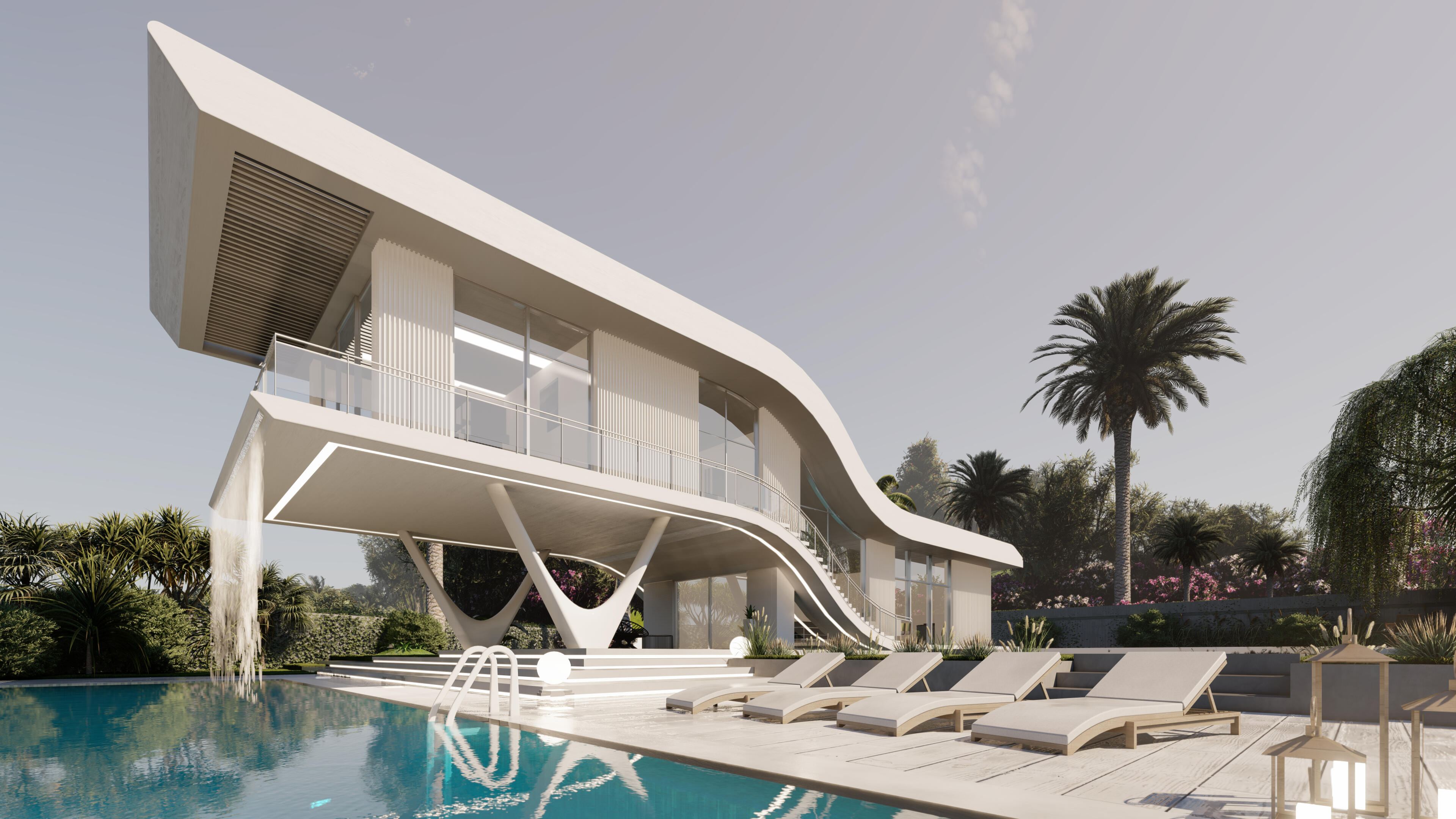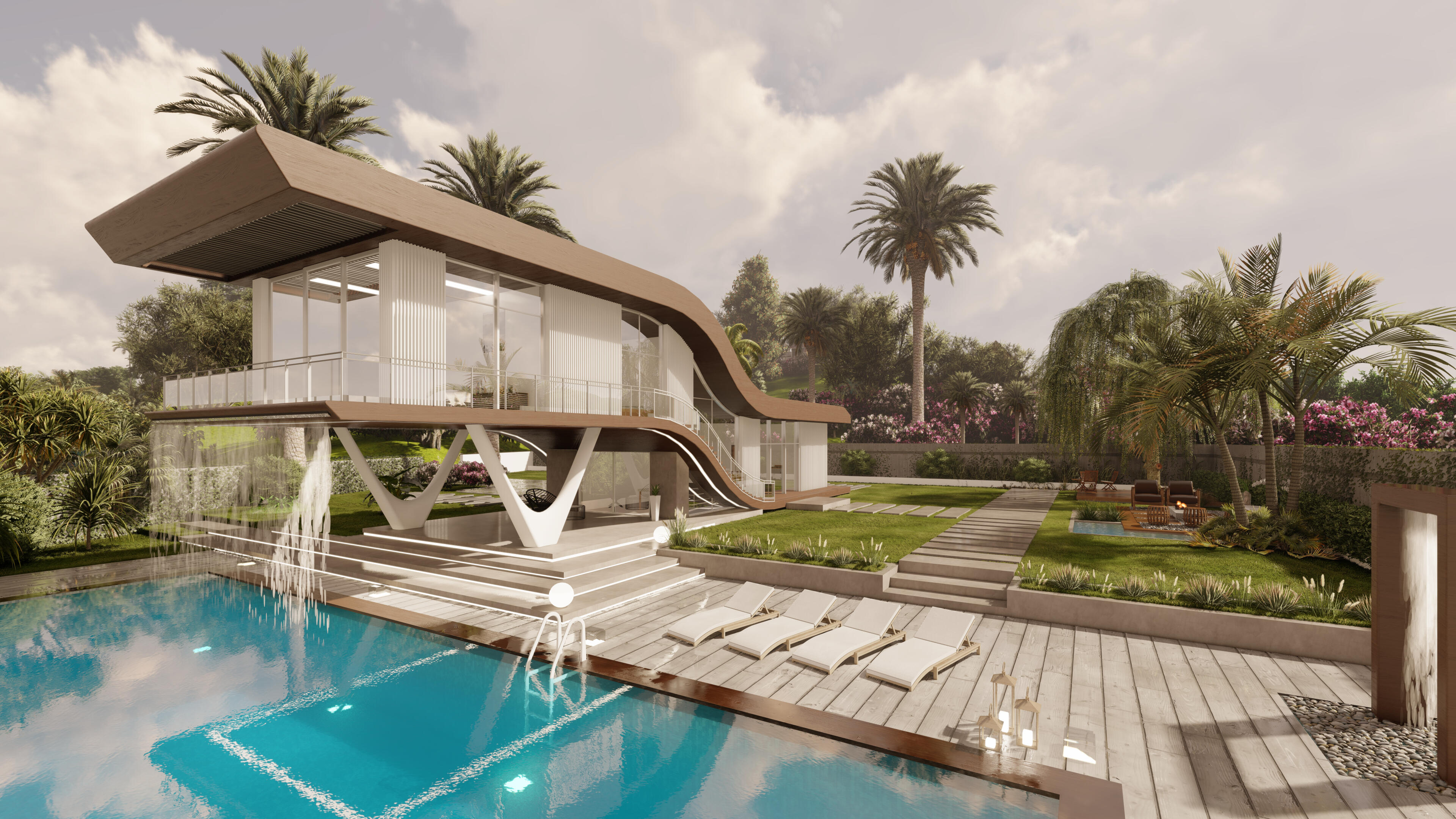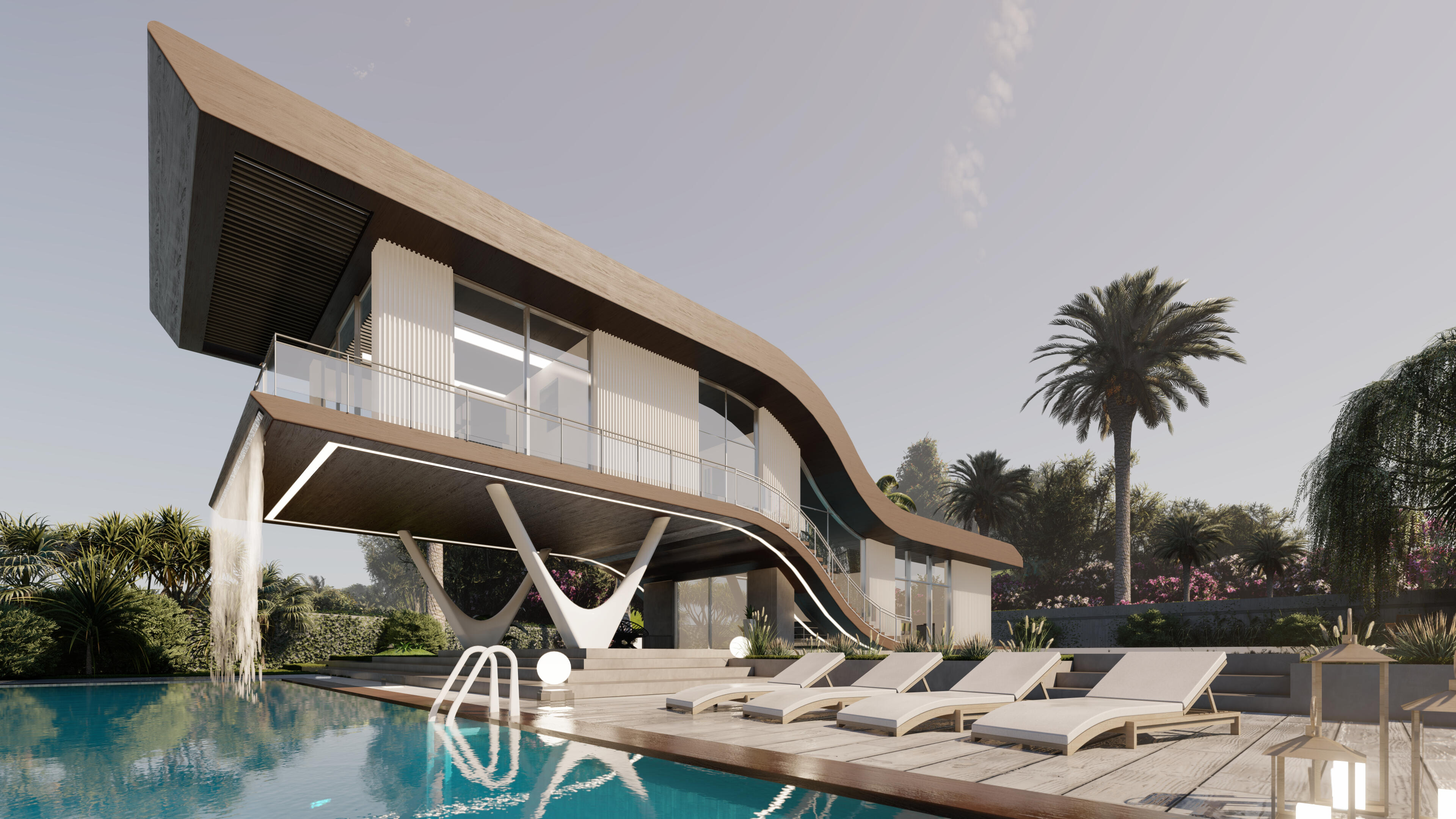 A modern L-shaped villa designed to embrace the pool as its central focal point, creating a seamless connection between indoor and outdoor living. Expansive glazing frames uninterrupted pool views, while the intersecting volumes provide privacy and spatial depth. A striking waterfall cascades from the first-floor slab into the pool below, adding movement, sound, and a refined architectural statement to the composition.
