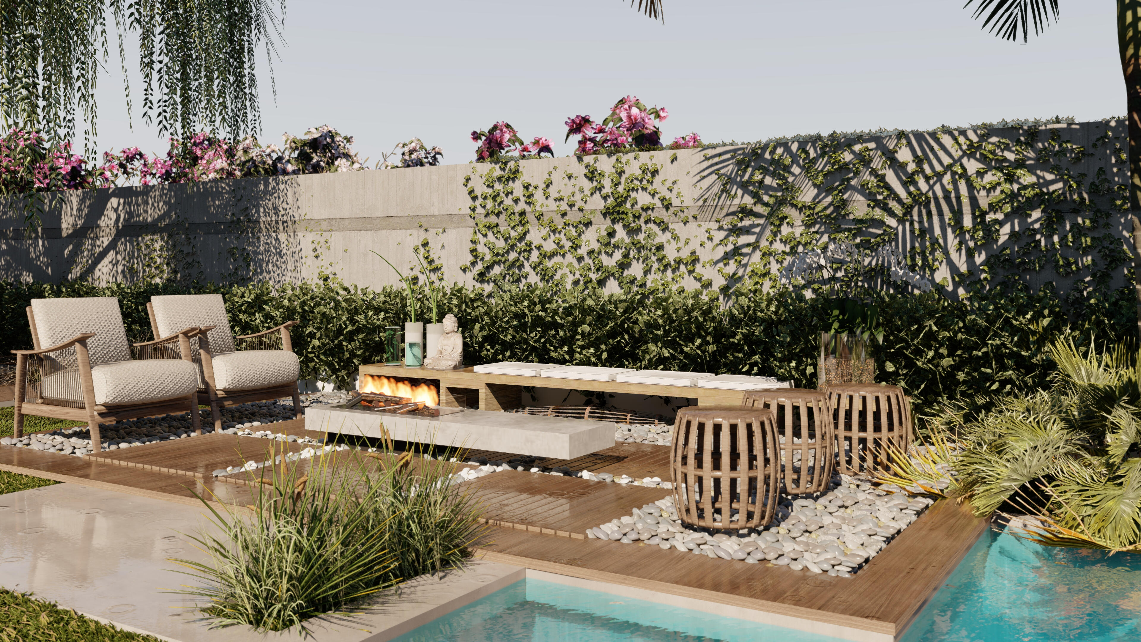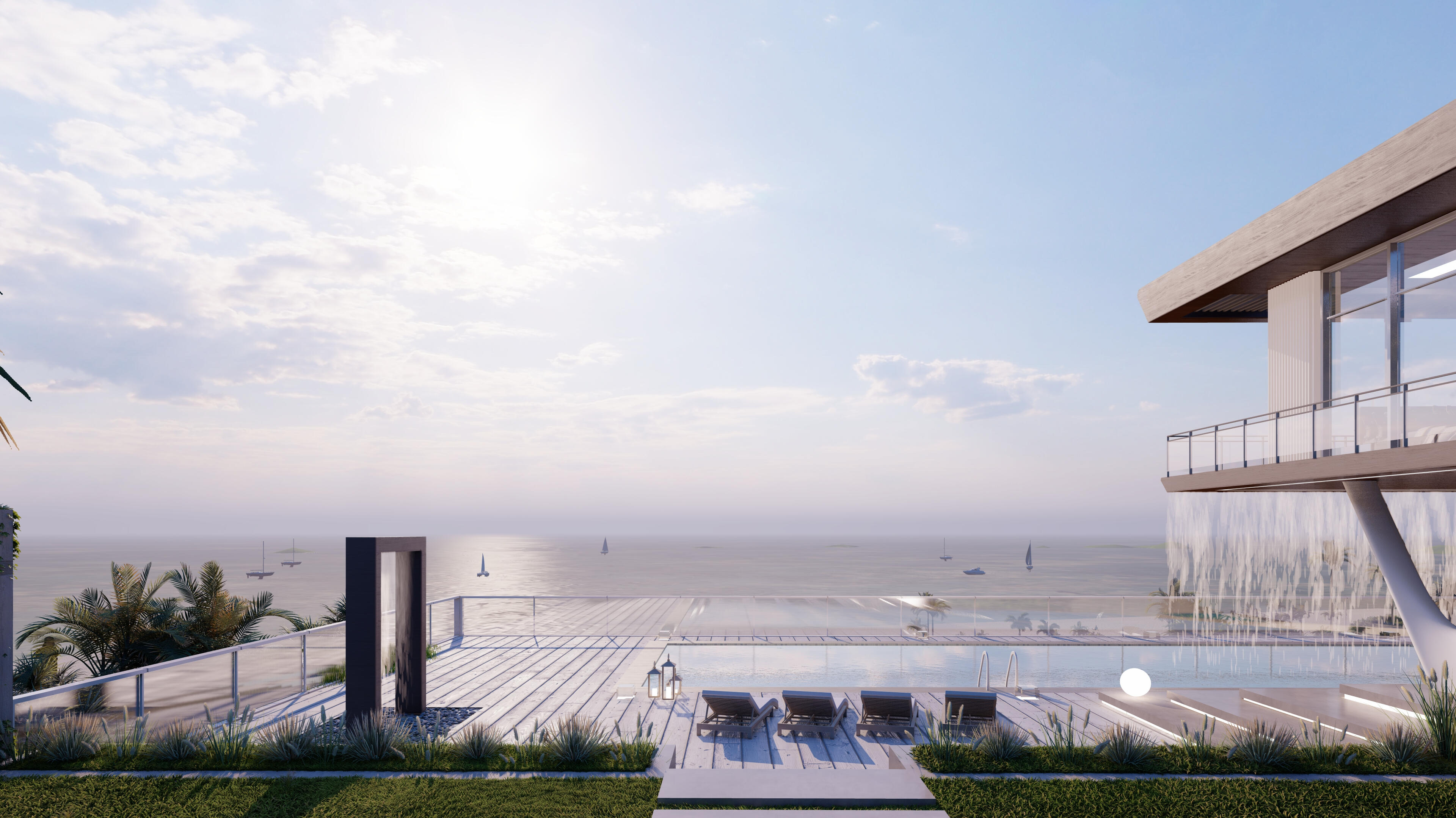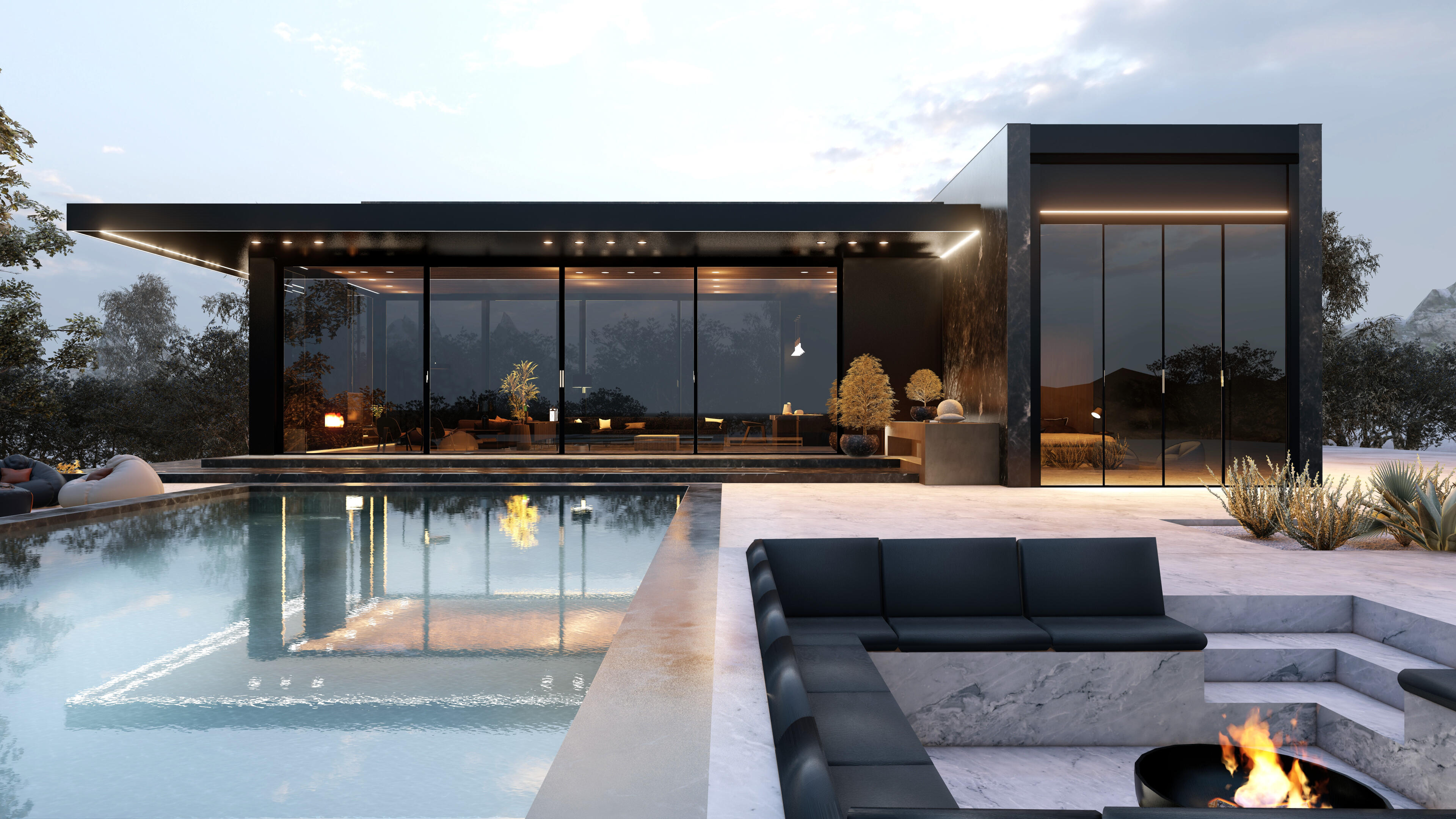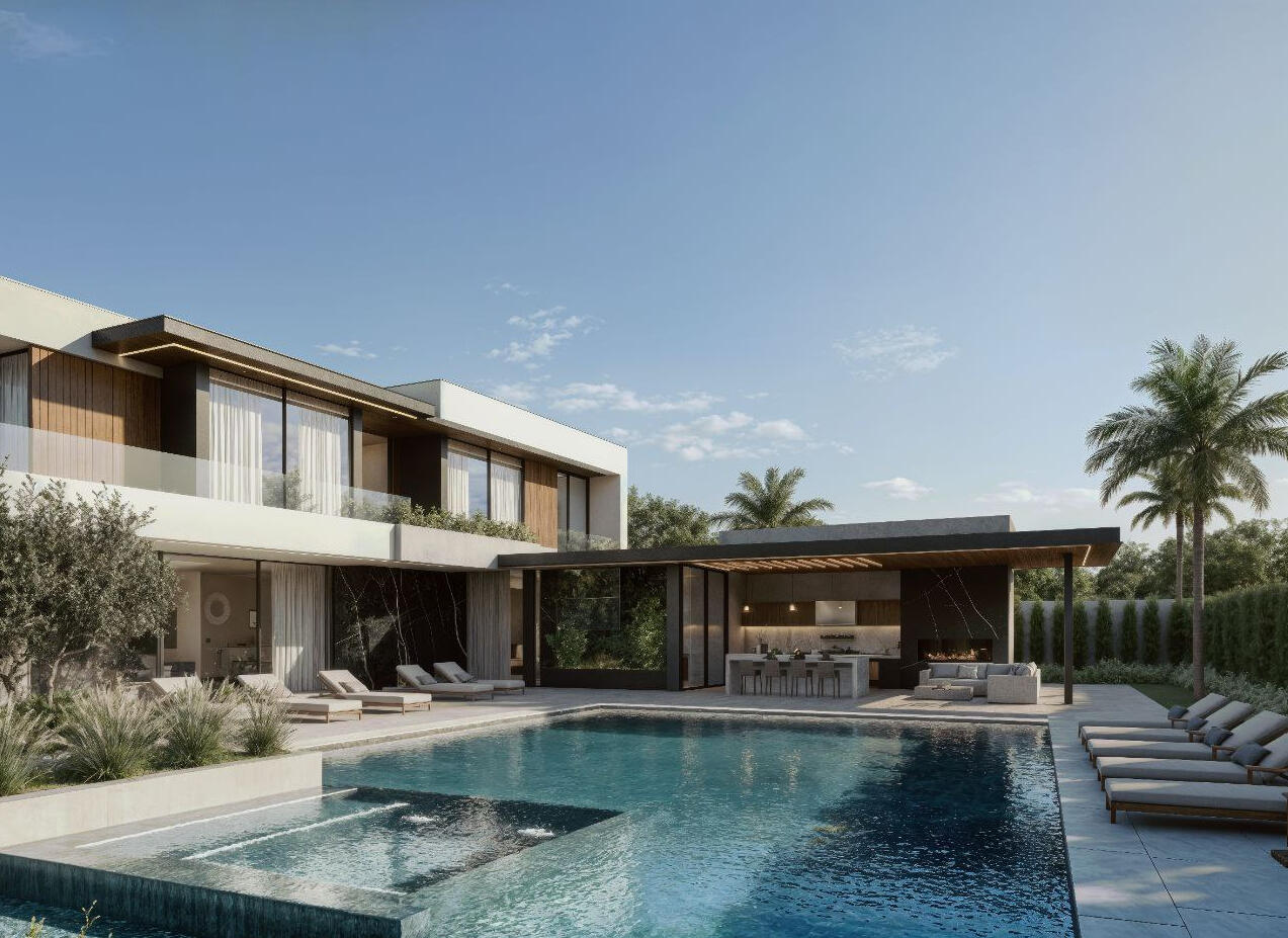 A modern L-shaped villa designed to embrace the pool as its central focal point, creating a seamless connection between indoor and outdoor living. Expansive glazing frames uninterrupted pool views, while the intersecting volumes provide privacy and spatial depth. A striking waterfall cascades from the first-floor slab into the pool below, adding movement, sound, and a refined architectural statement to the composition.