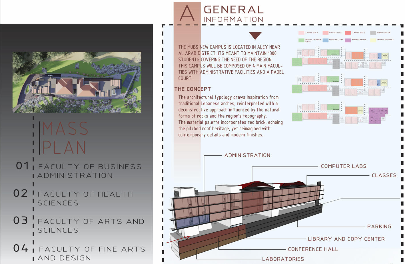 MUBS architectural typology draws inspiration from traditional Lebanese arches, reinterpreted with deconstructive approach influenced by the natural form of rocks and the region's topography. The material palette incorporate red brick, echoing the pitched roof heritage, yet reimagined with contemporary details and modern finishes.
