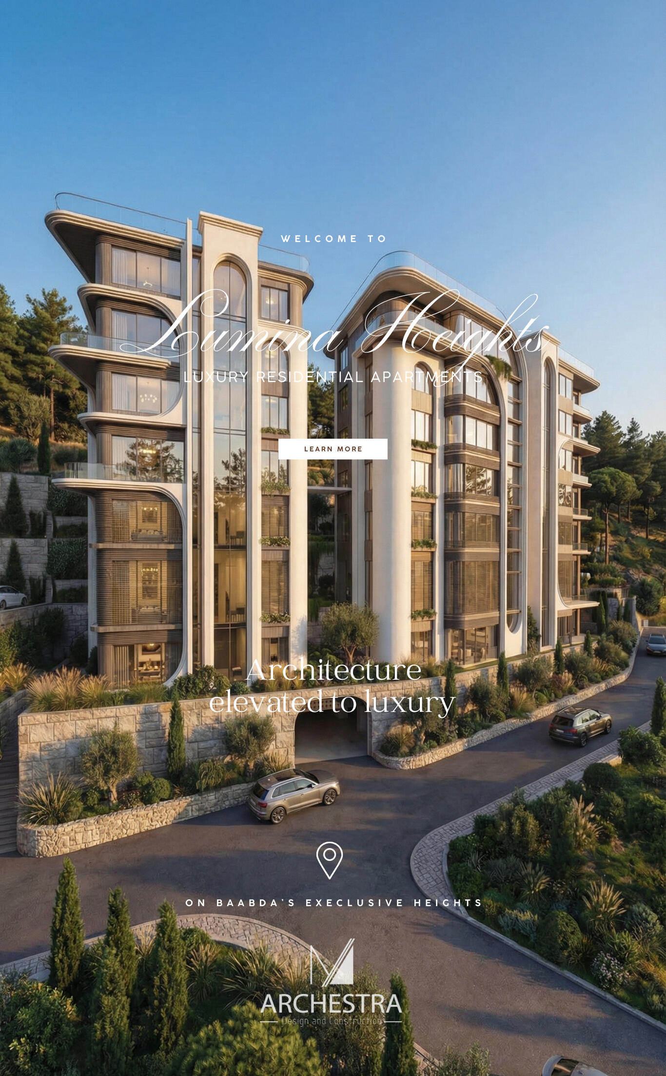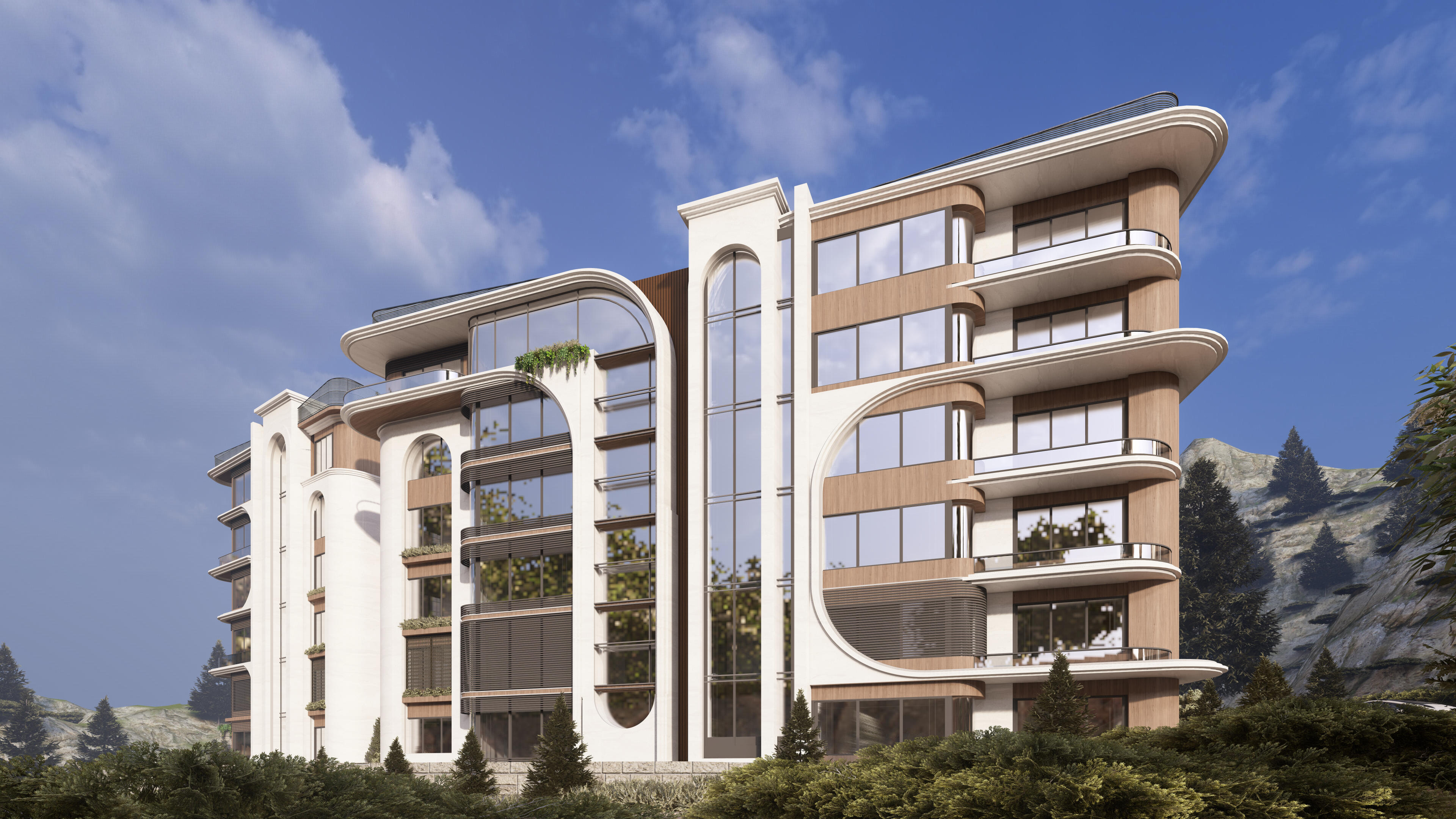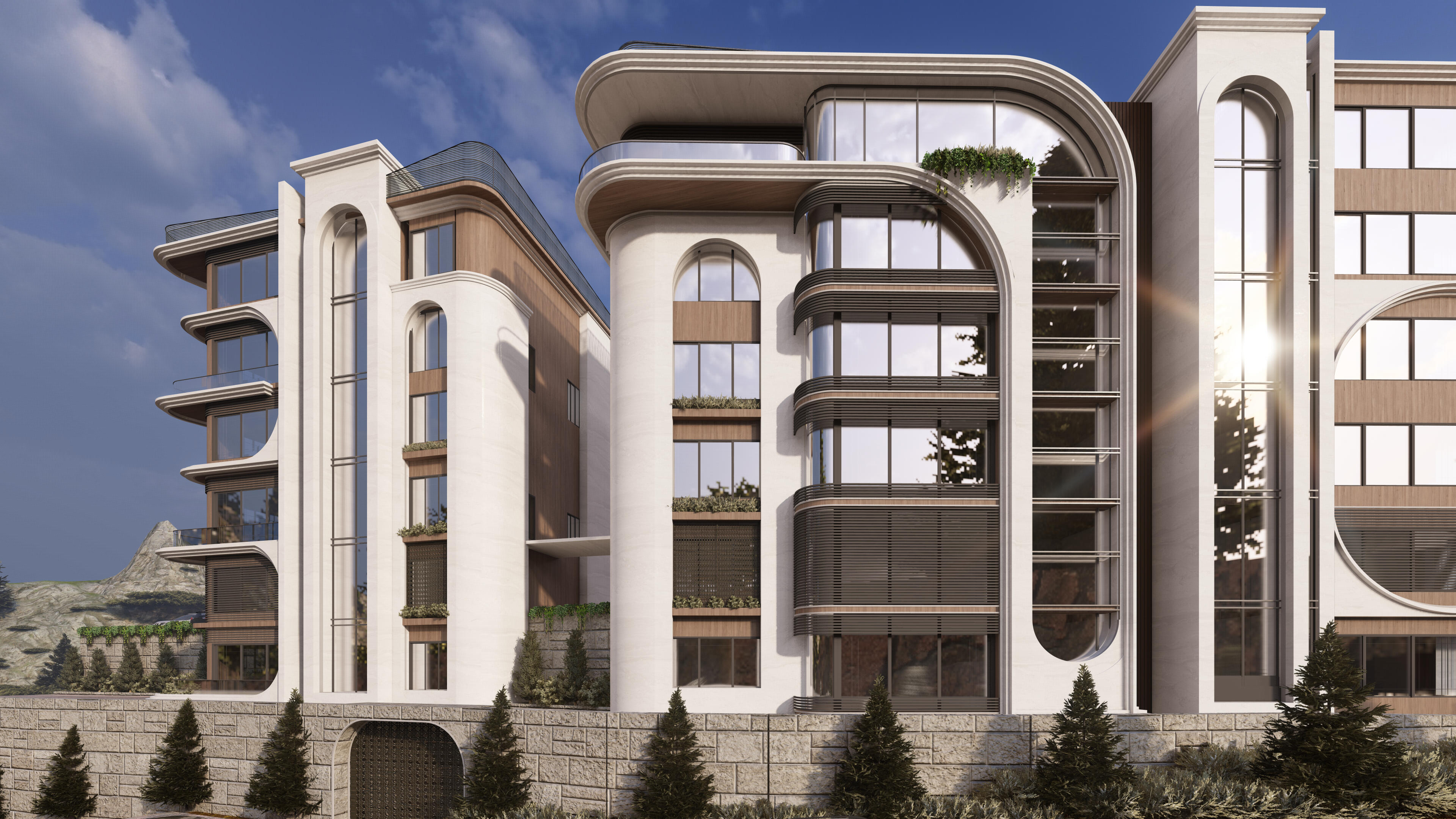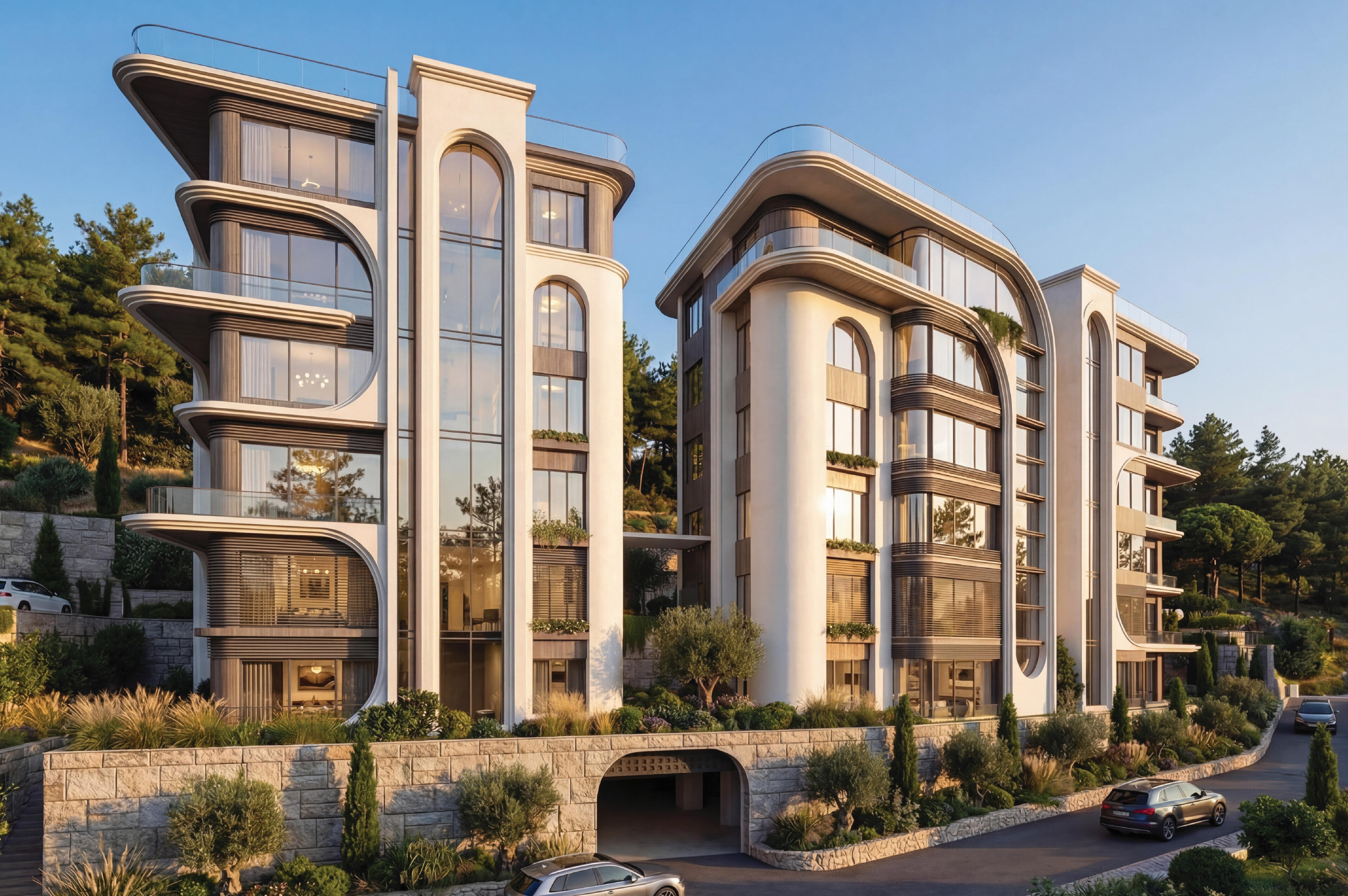 A modern luxury residential building defined by a rhythmic series of clean, minimalist arches, blending smooth natural stone, and expansive glass for a refined and elegant façade. The arches frame balconies and terraces, adding depth, shade, and privacy while softening the overall composition. Subtle integrated lighting enhances the curves at night, transforming the structure into a sculptural landmark that perfectly fuses timeless architectural language with contemporary sophistication.