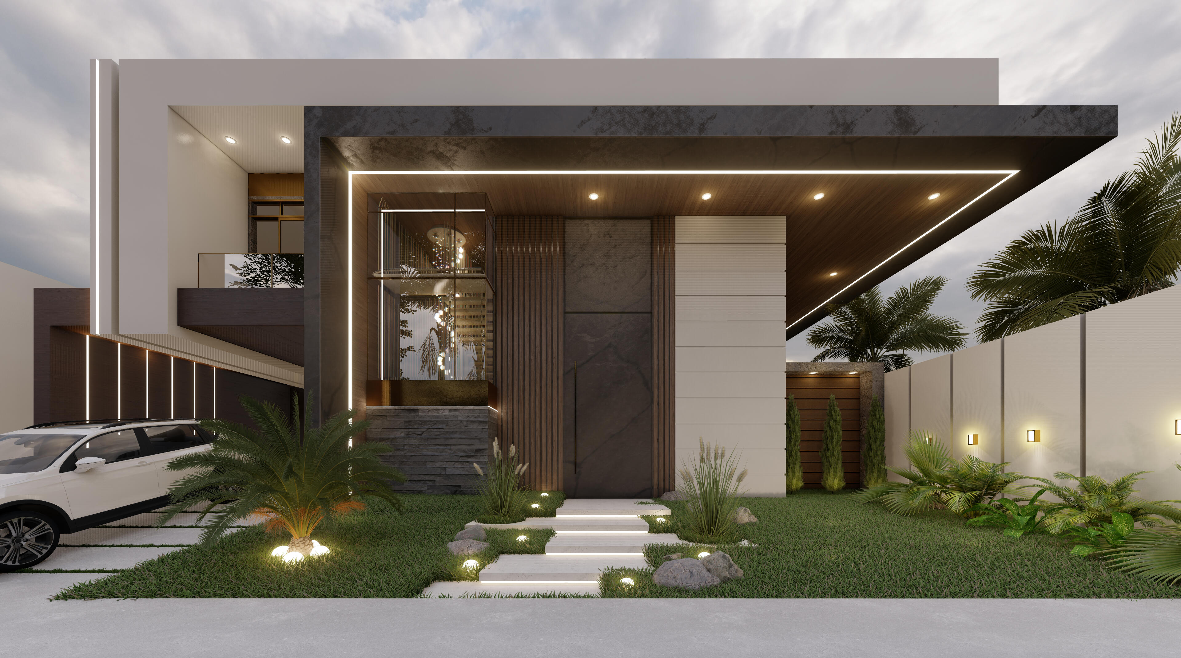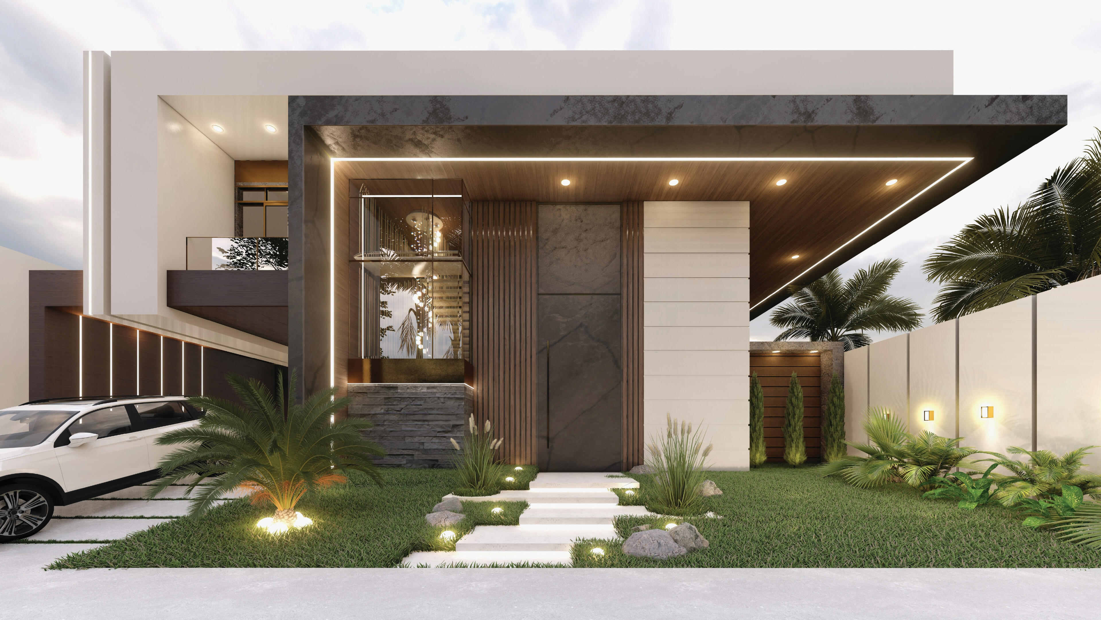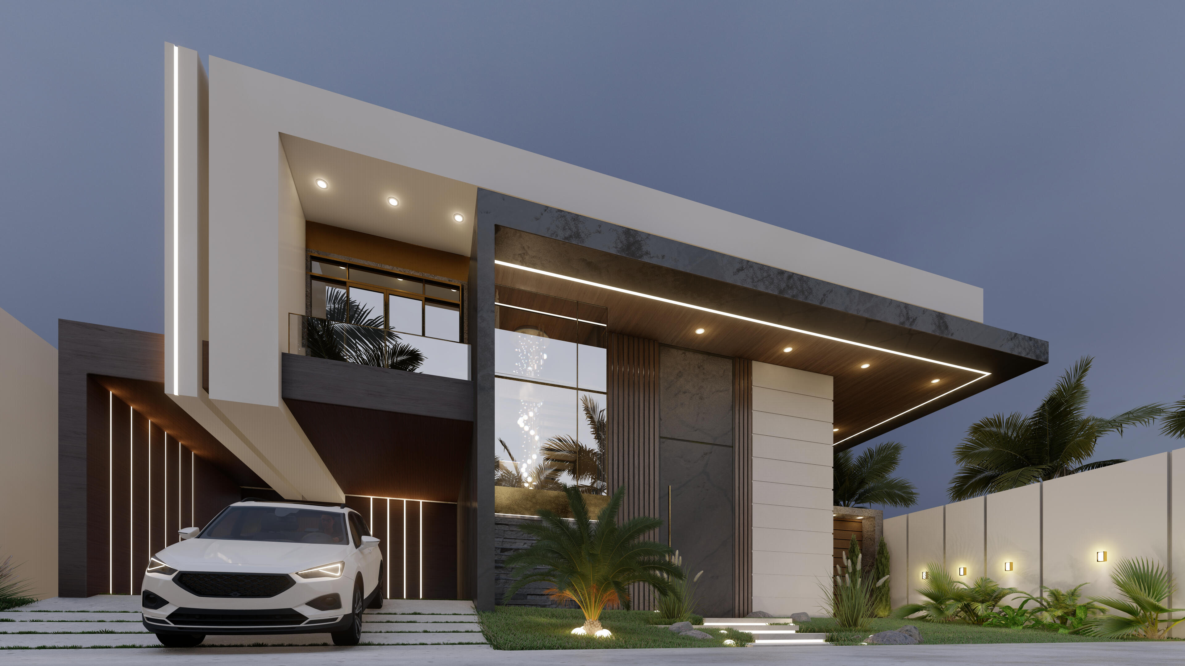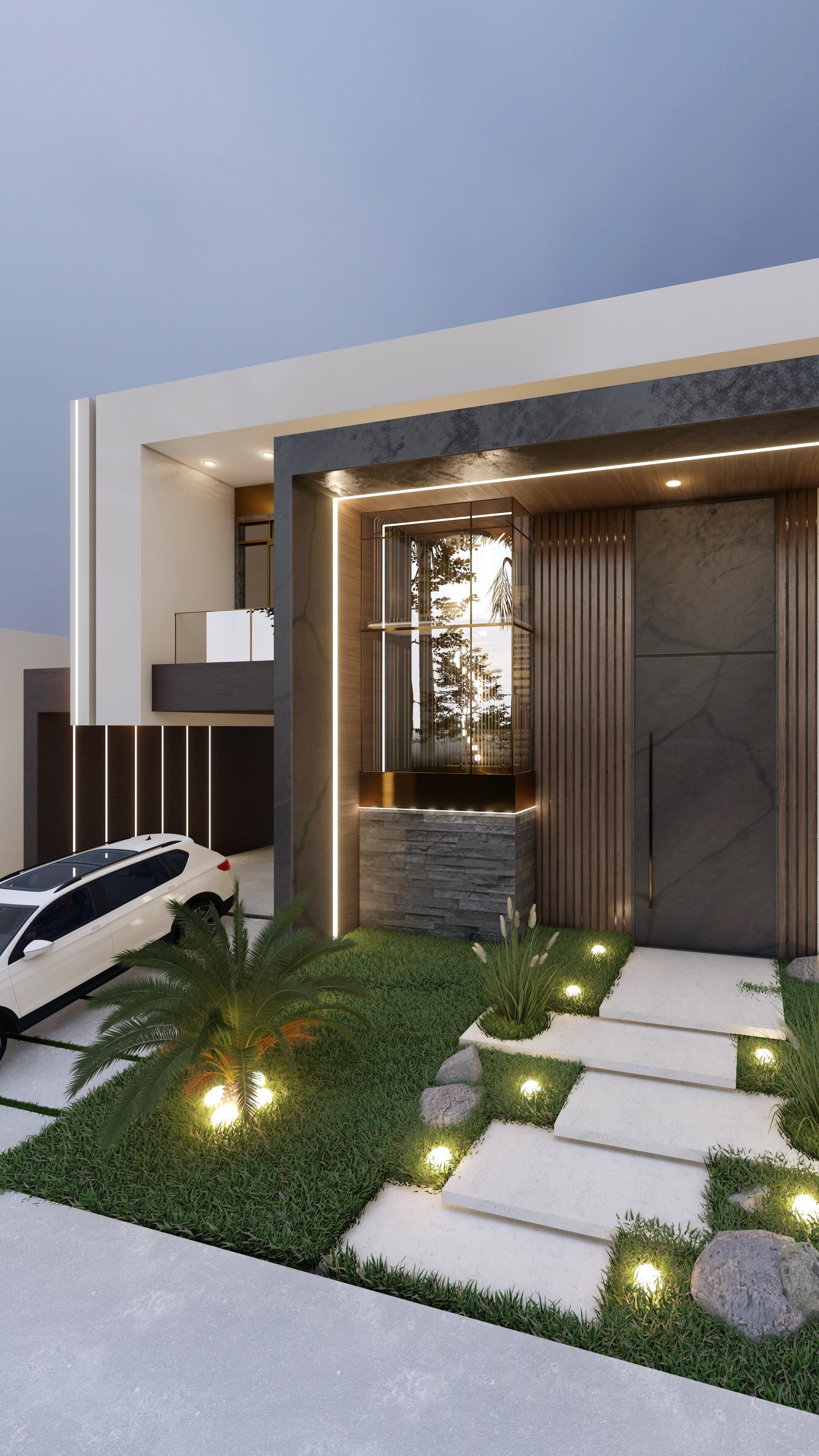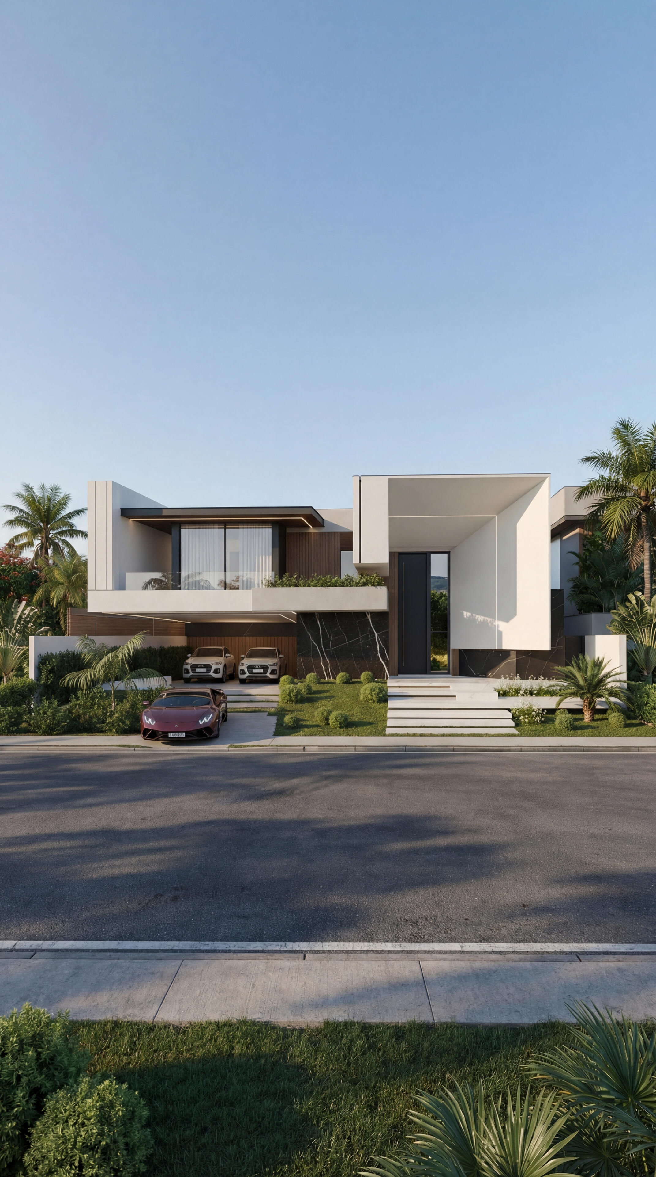 A bold contemporary villa defined by a striking cantilevered roof and a dramatic framed entrance that acts as the focal point of the façade. Rich materials—dark stone, warm wood, and smooth white panels—are layered to create contrast and depth, while vertical slats add texture and rhythm. Expansive glazing reveals a double-height interior, enhancing the sense of luxury and openness. Integrated linear lighting accentuates the geometry, giving the villa a refined, sculptural presence day and night.
