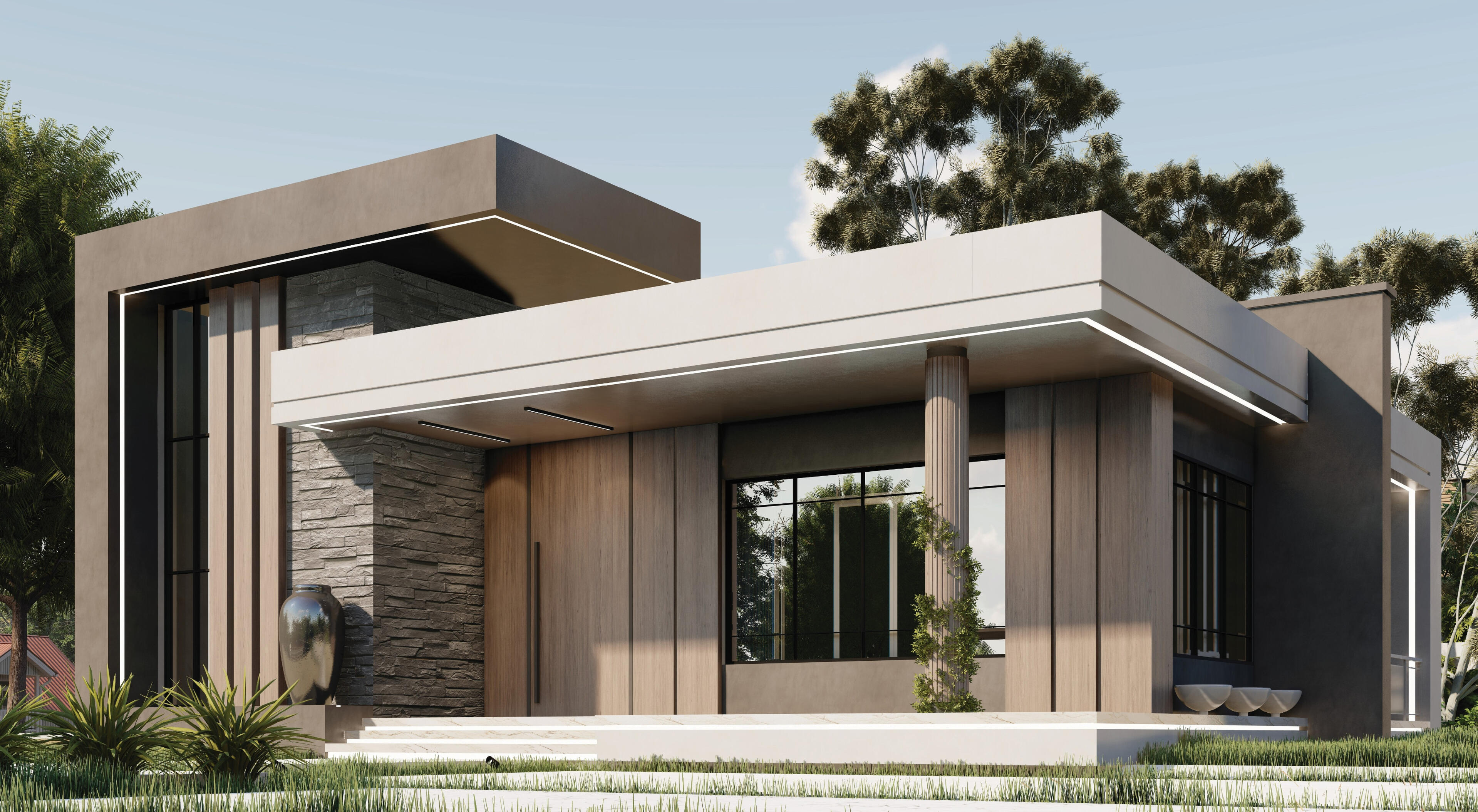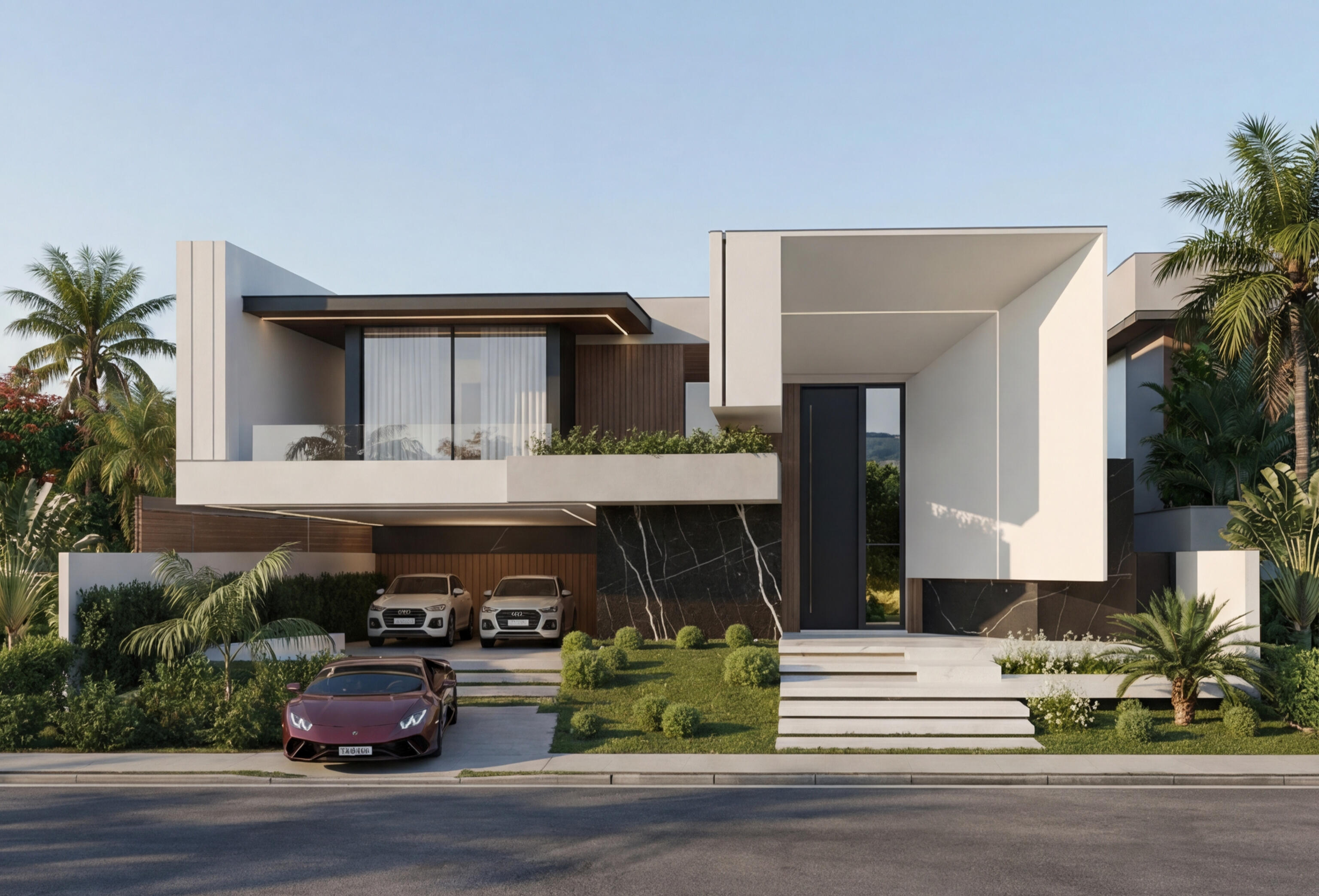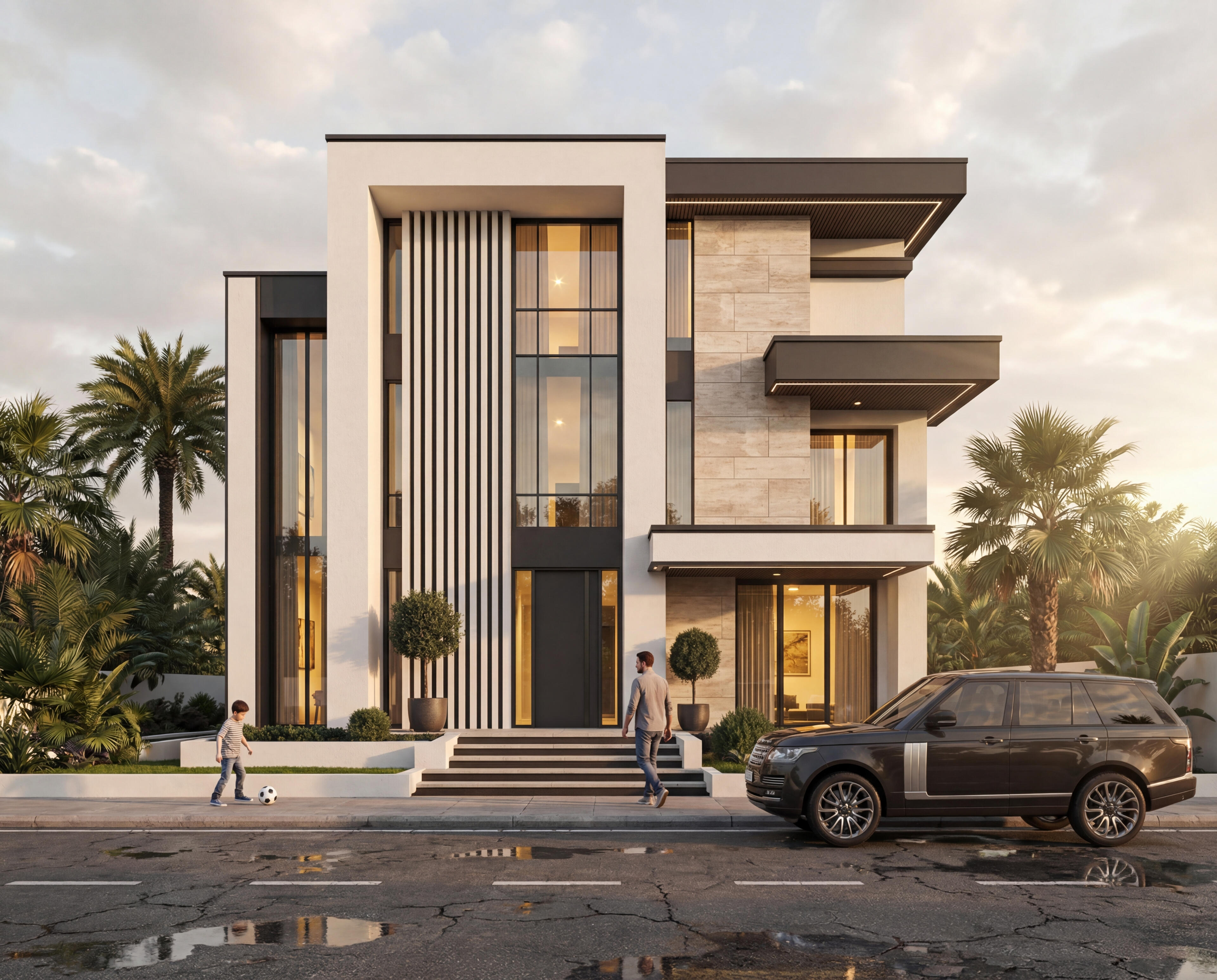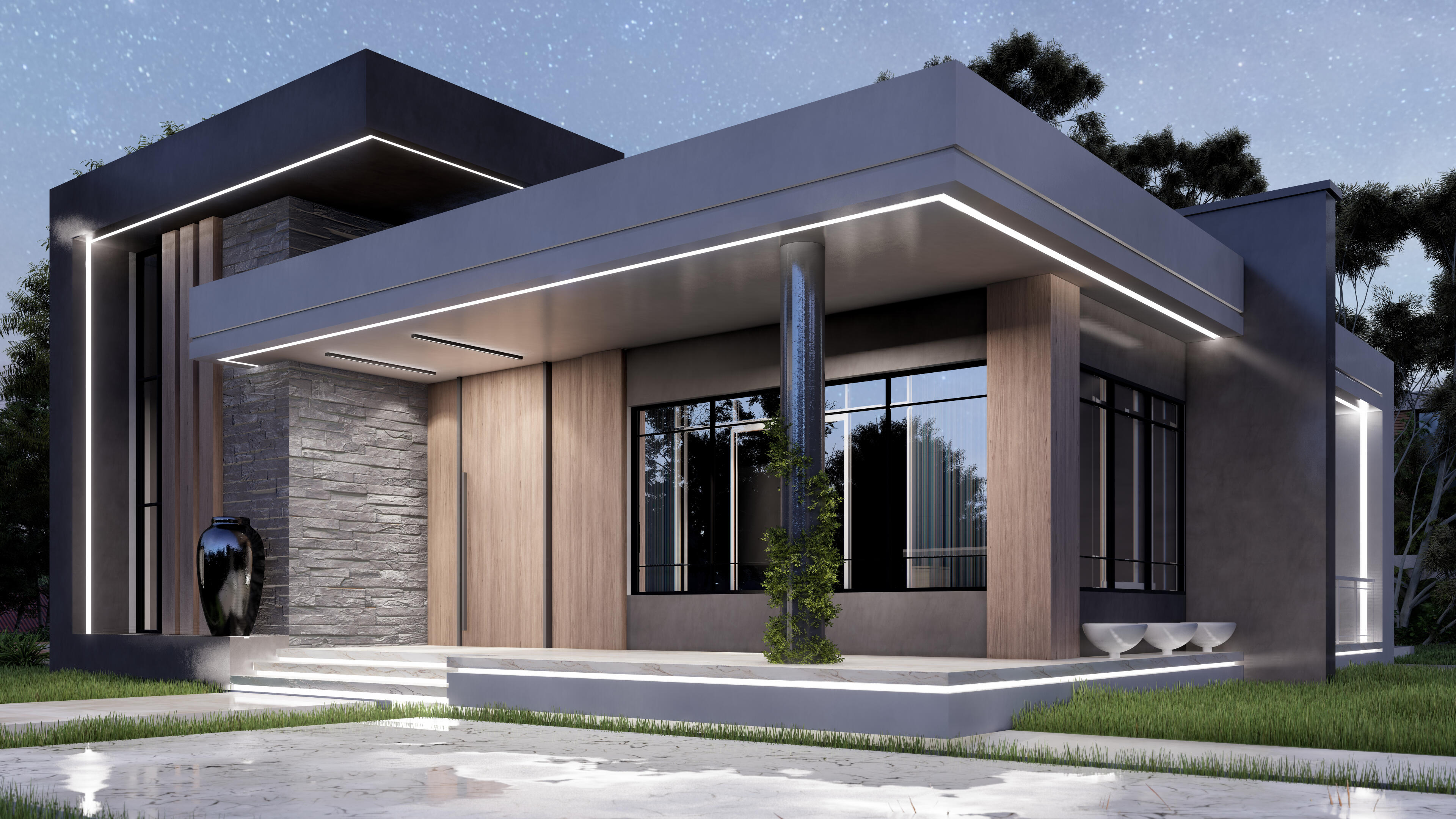 A bold contemporary villa defined by a striking cantilevered roof and a dramatic framed entrance that acts as the focal point of the façade. Rich materials—dark stone, warm wood, and smooth white panels—are layered to create contrast and depth, while vertical slats add texture and rhythm. Expansive glazing reveals a double-height interior, enhancing the sense of luxury and openness. Integrated linear lighting accentuates the geometry, giving the villa a refined, sculptural presence day and night.