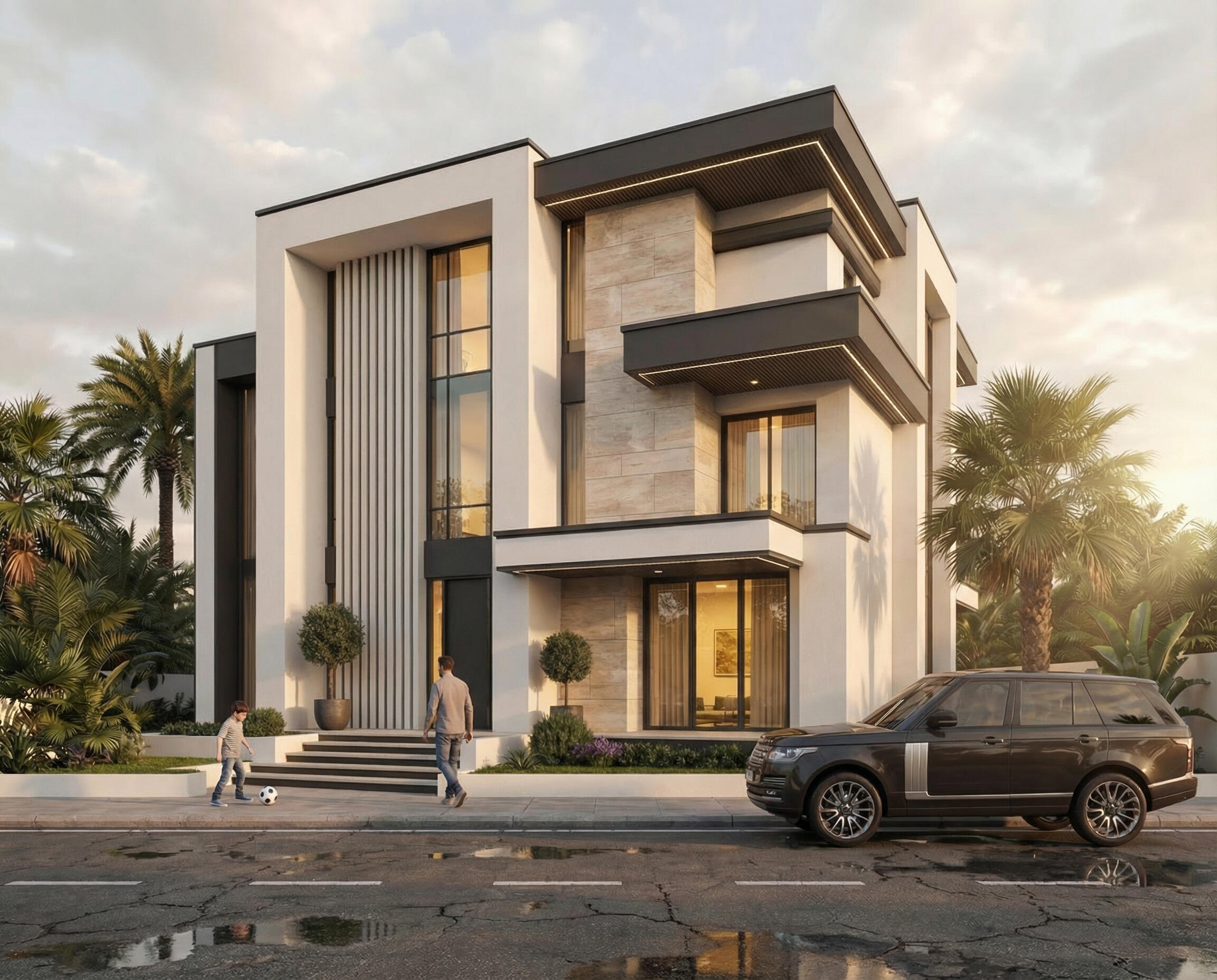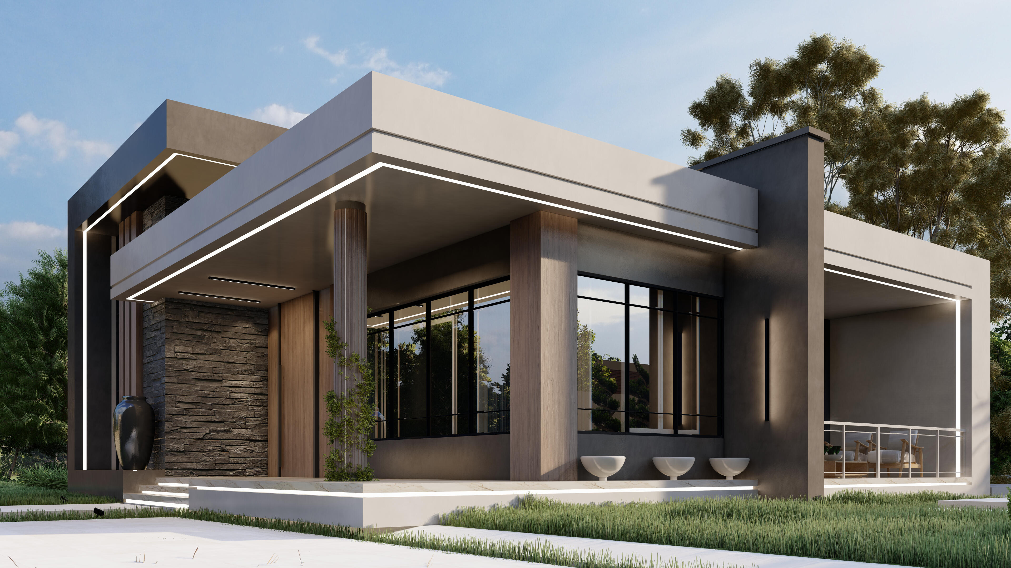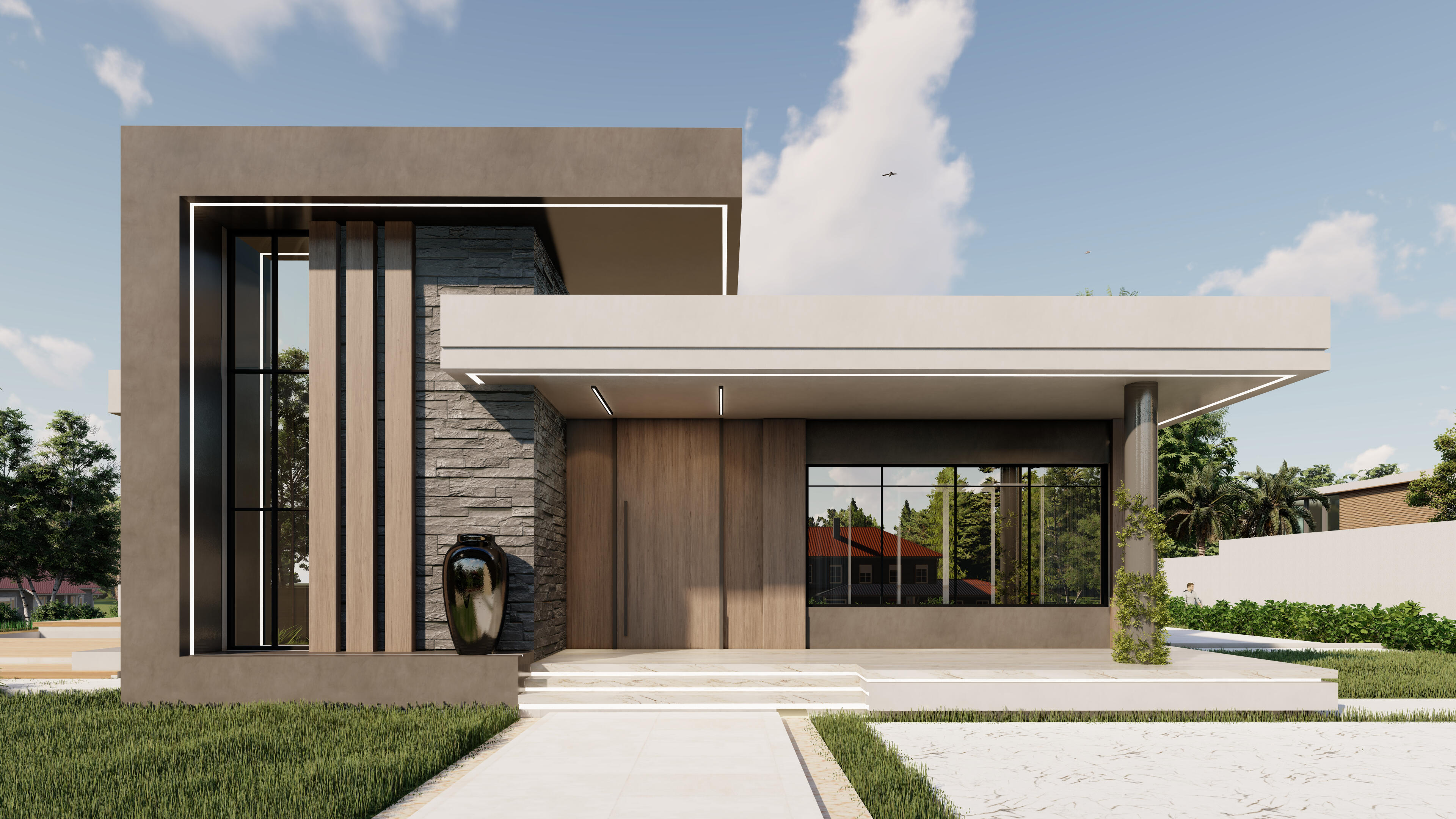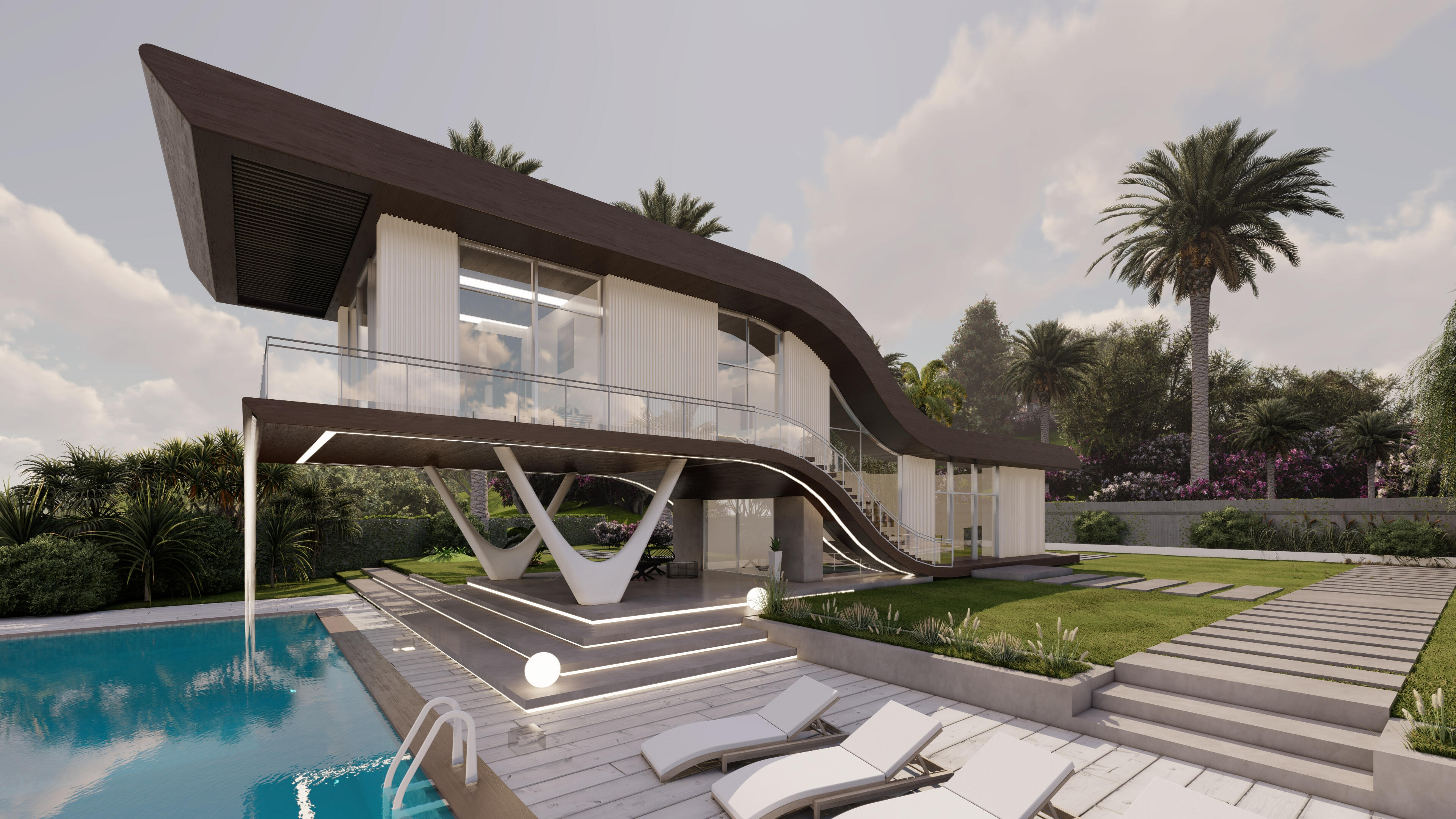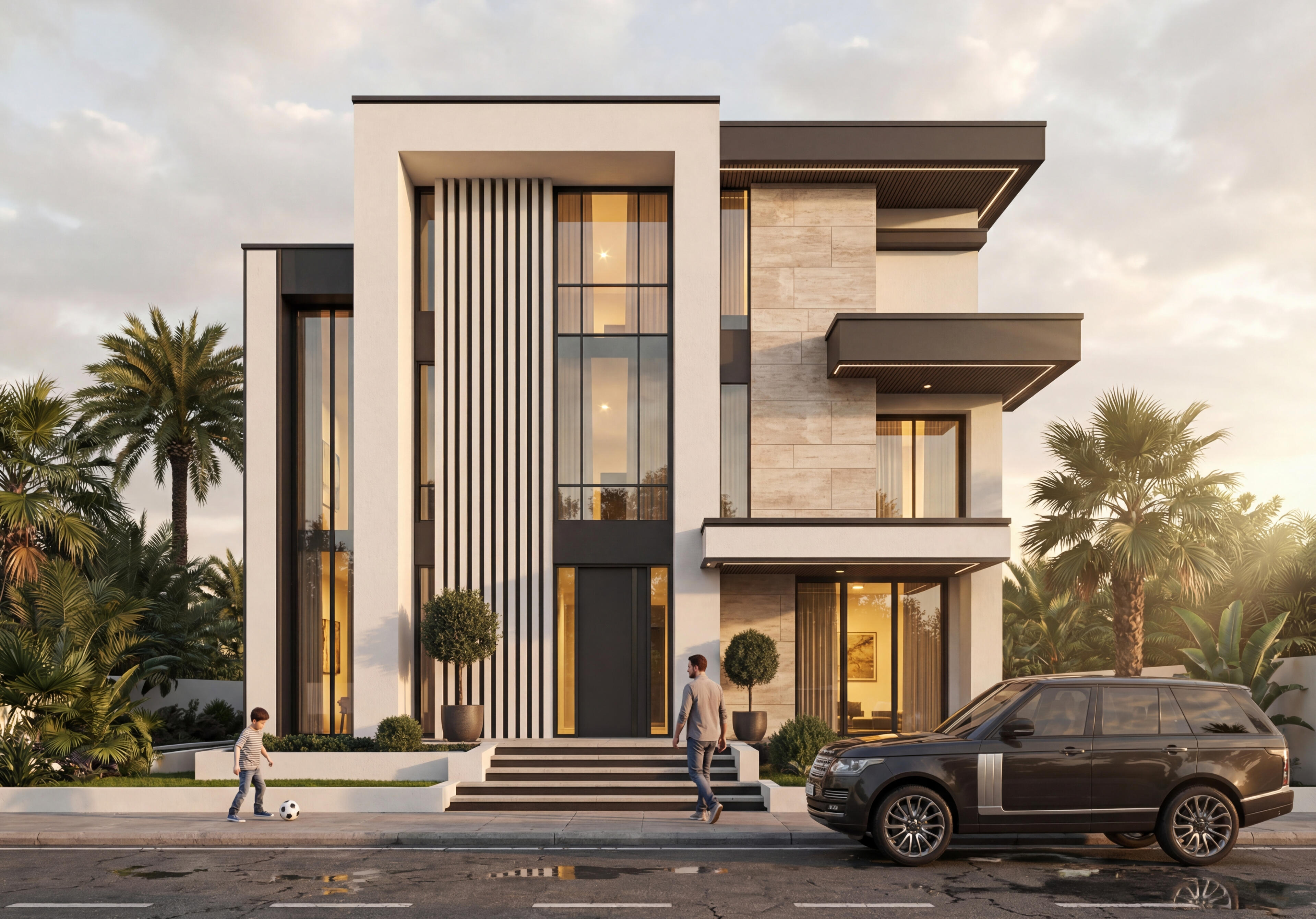 A bold contemporary villa defined by a striking cantilevered roof and a dramatic framed entrance that acts as the focal point of the façade. Rich materials—dark stone, warm wood, and smooth white panels—are layered to create contrast and depth, while vertical slats add texture and rhythm. Expansive glazing reveals a double-height interior, enhancing the sense of luxury and openness. Integrated linear lighting accentuates the geometry, giving the villa a refined, sculptural presence day and night.