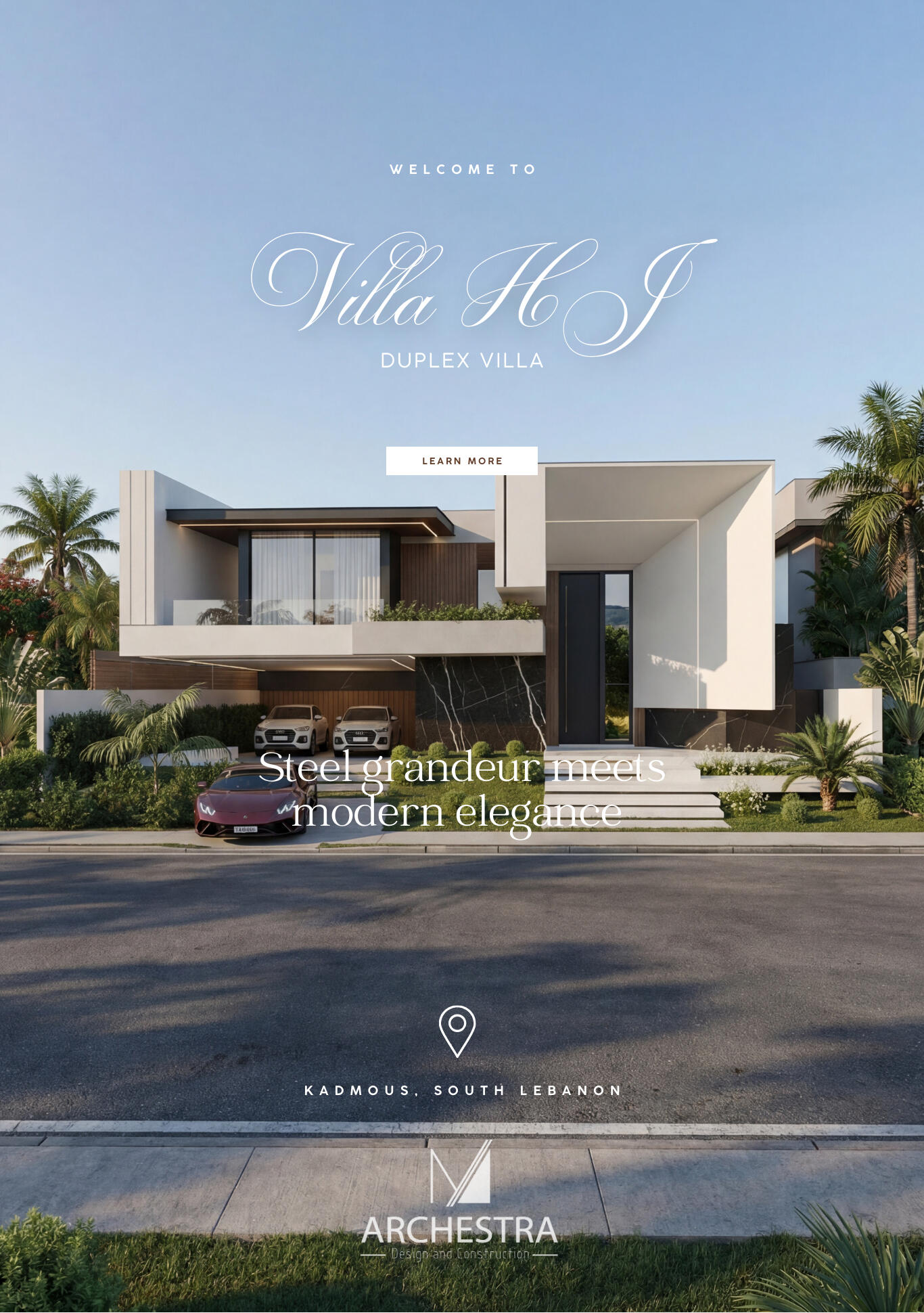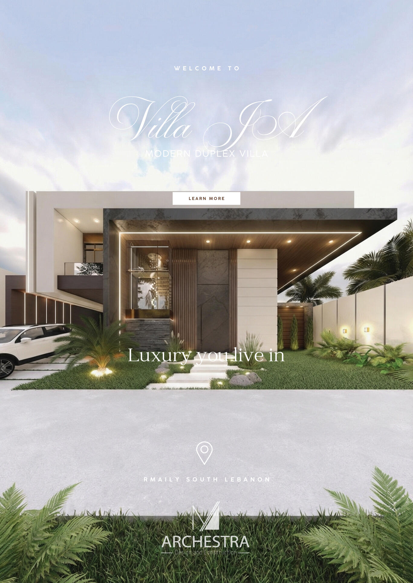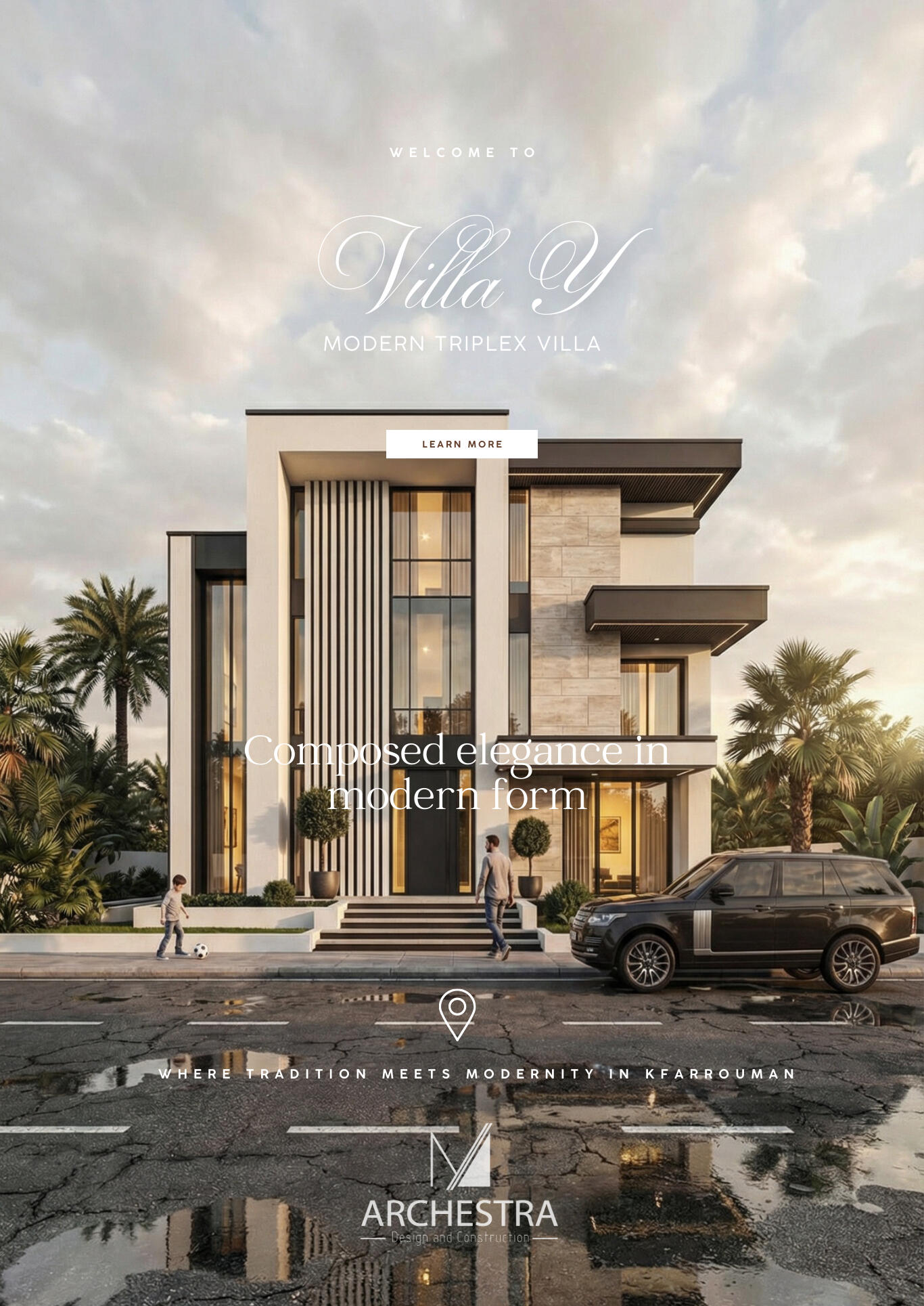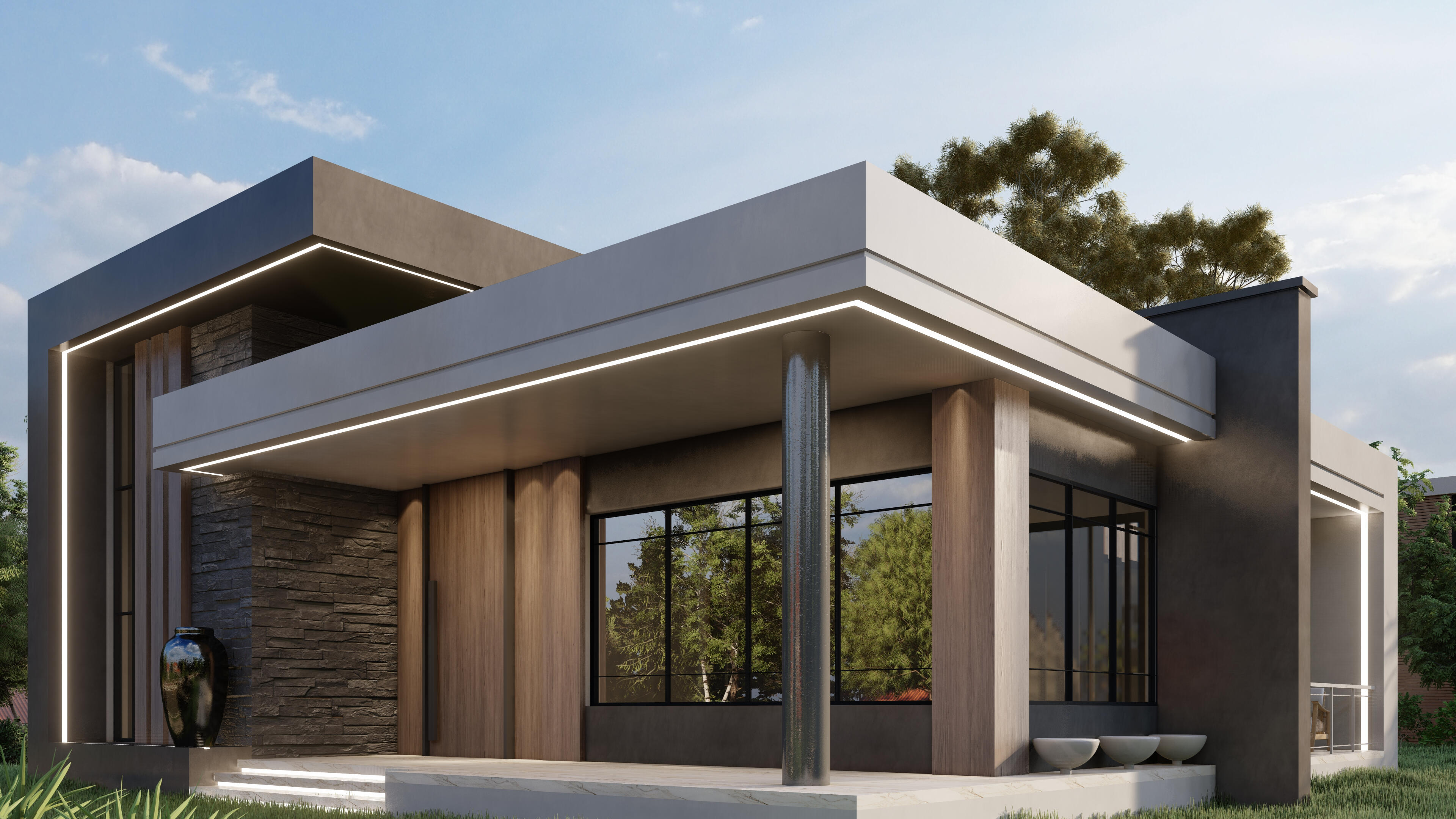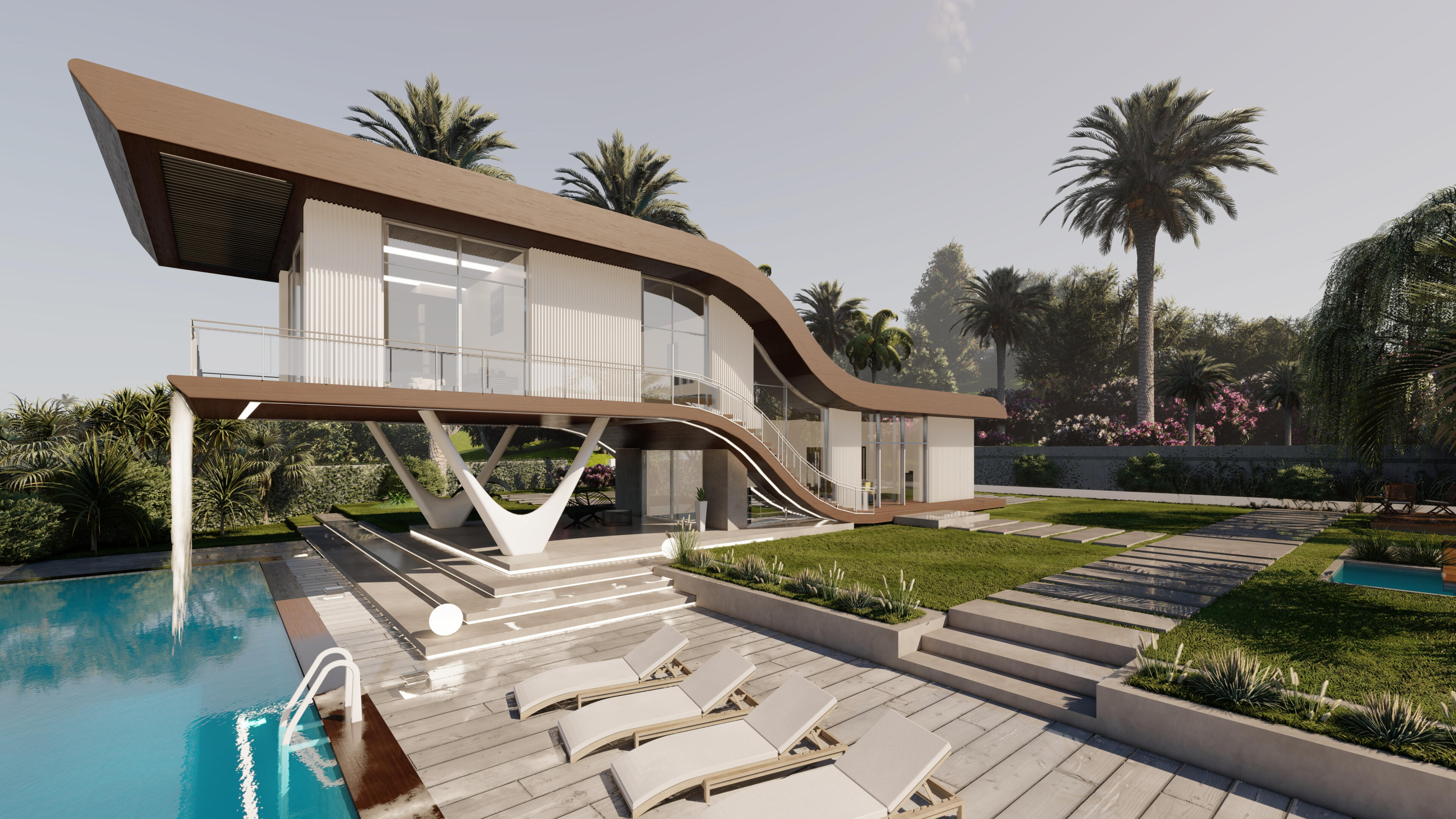 A bold contemporary villa defined by a striking cantilevered roof and a dramatic framed entrance that acts as the focal point of the façade. Rich materials—dark stone, warm wood, and smooth white panels—are layered to create contrast and depth, while vertical slats add texture and rhythm. Expansive glazing reveals a double-height interior, enhancing the sense of luxury and openness. Integrated linear lighting accentuates the geometry, giving the villa a refined, sculptural presence day and night.