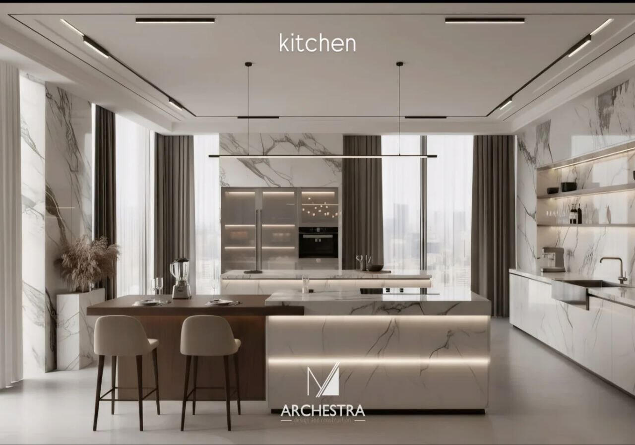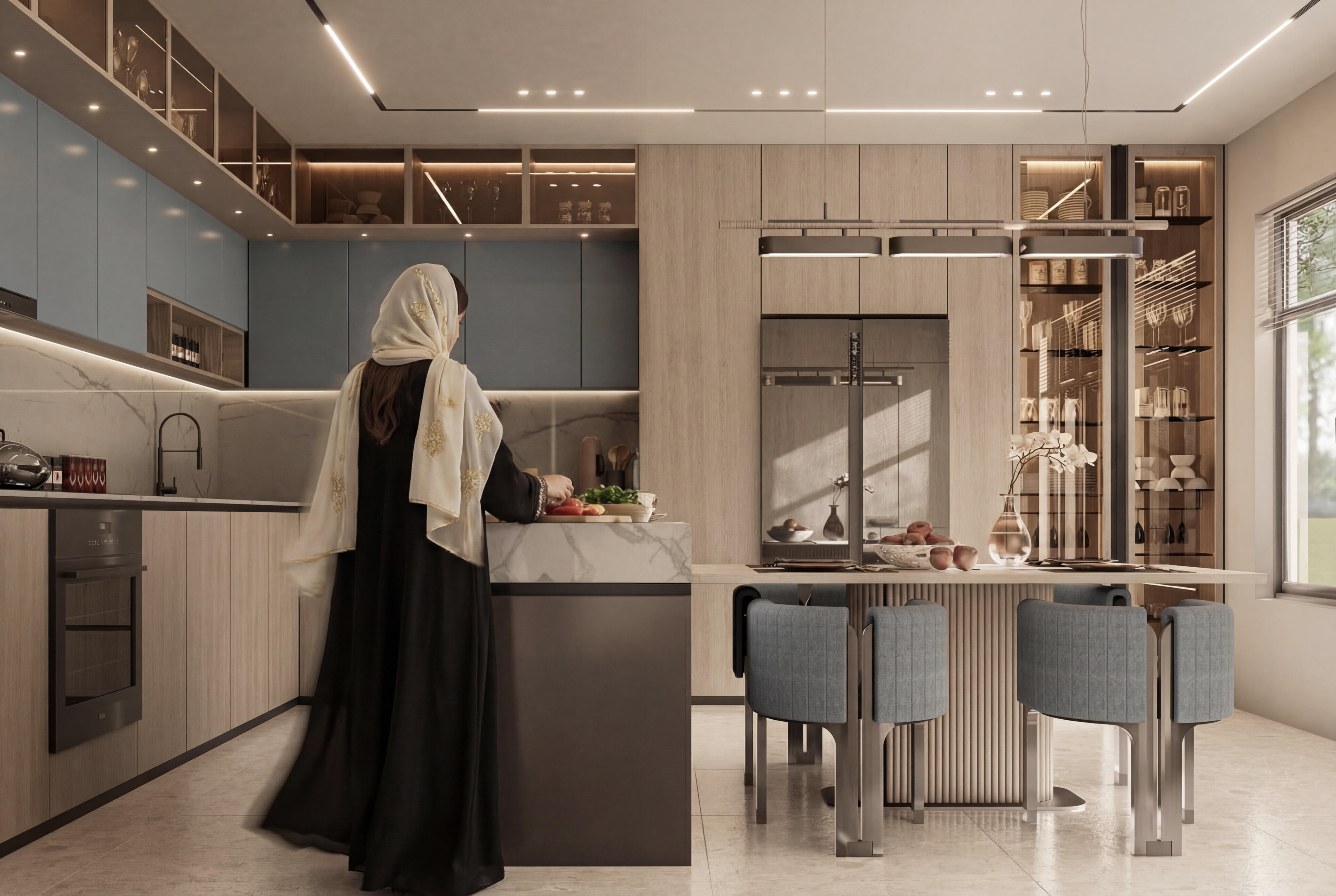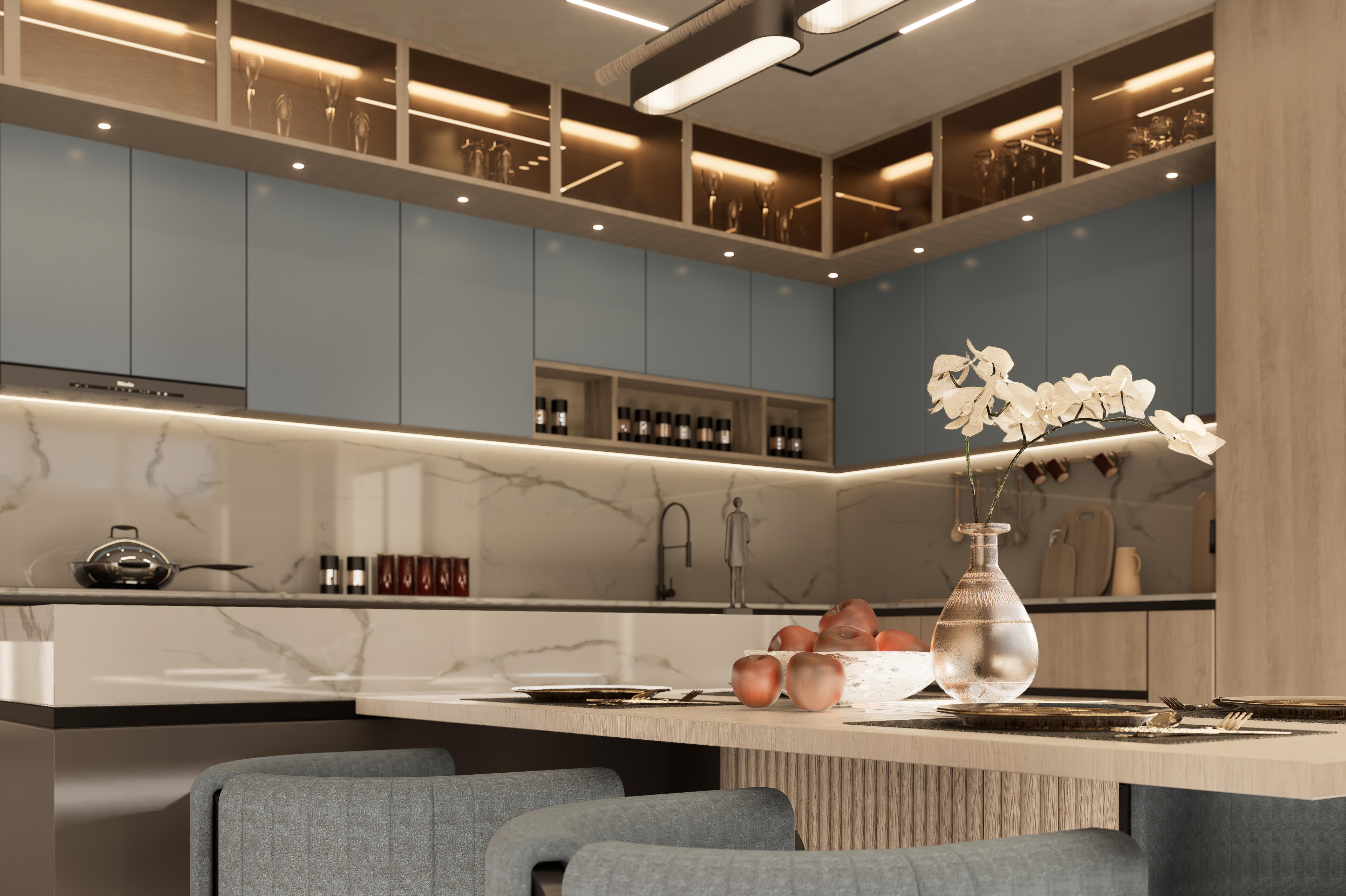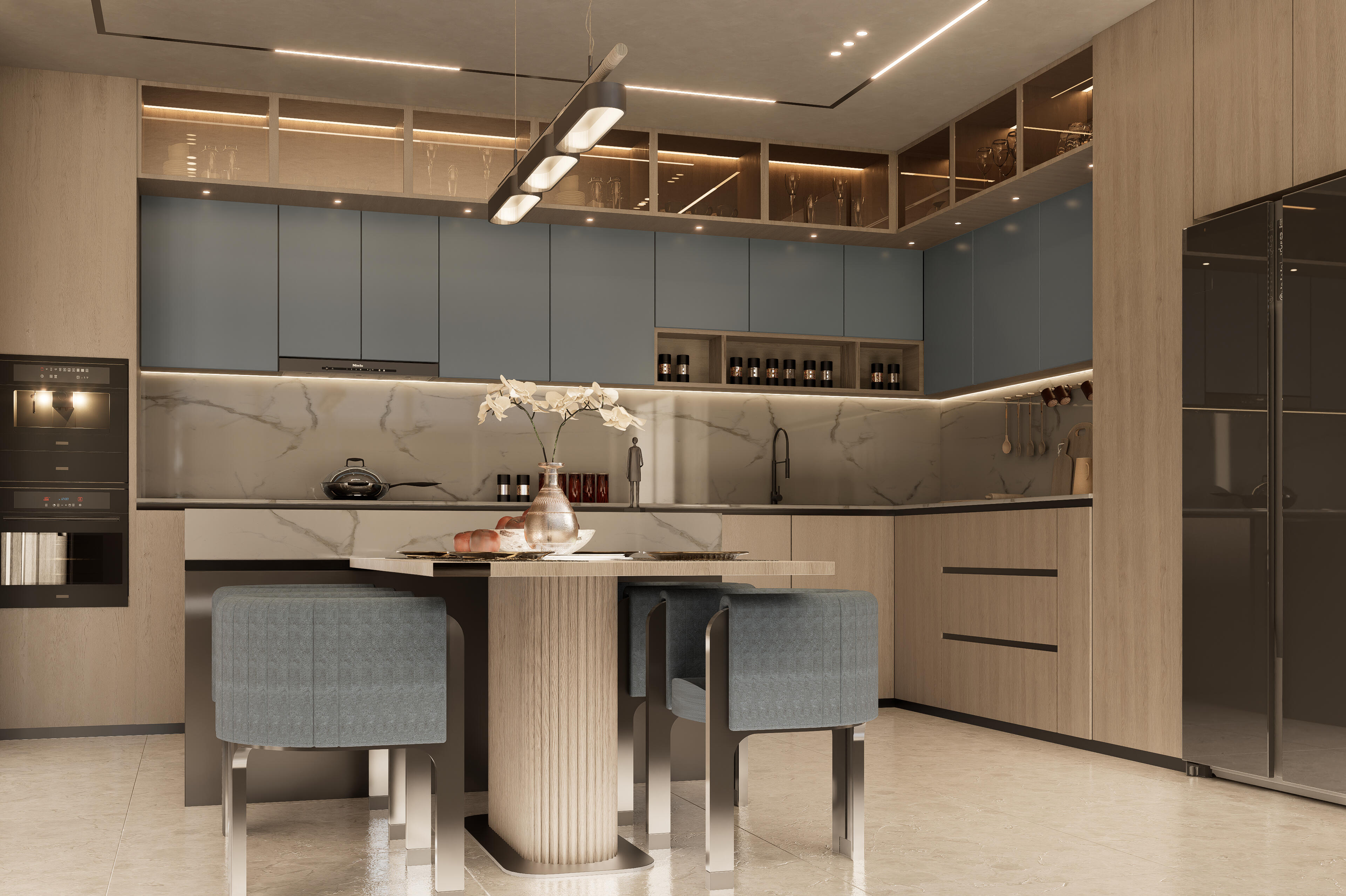 A refined modern kitchen defined by a harmonious blend of warm wood, soft matte finishes, and elegant marble surfaces. Clean lines and handle-less cabinetry create a seamless look, while integrated lighting highlights textures and adds depth. Glass display units and open shelving bring a sense of lightness and sophistication. The central island acts as both a functional workspace and a social focal point, embodying contemporary luxury with a calm, inviting atmosphere.