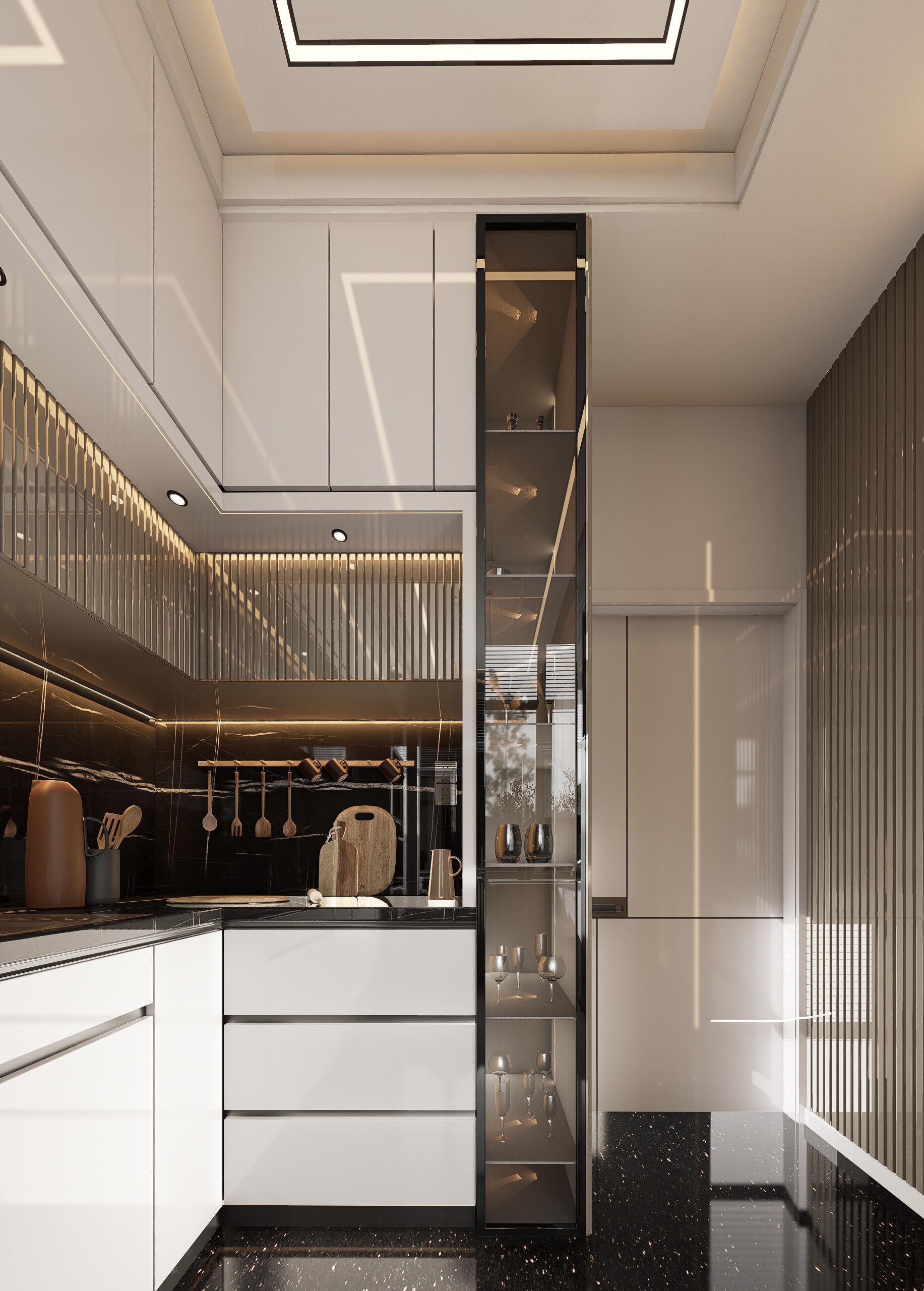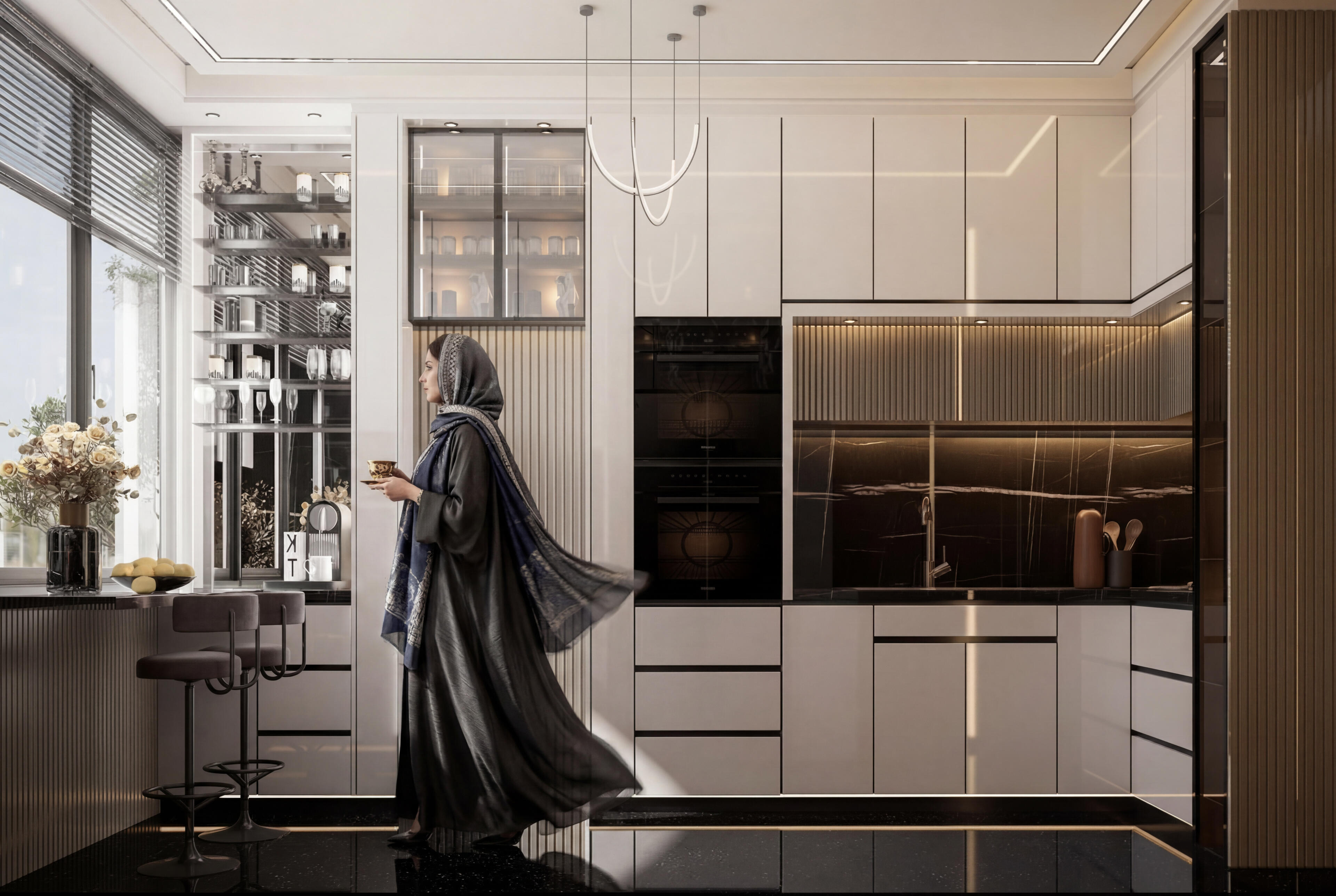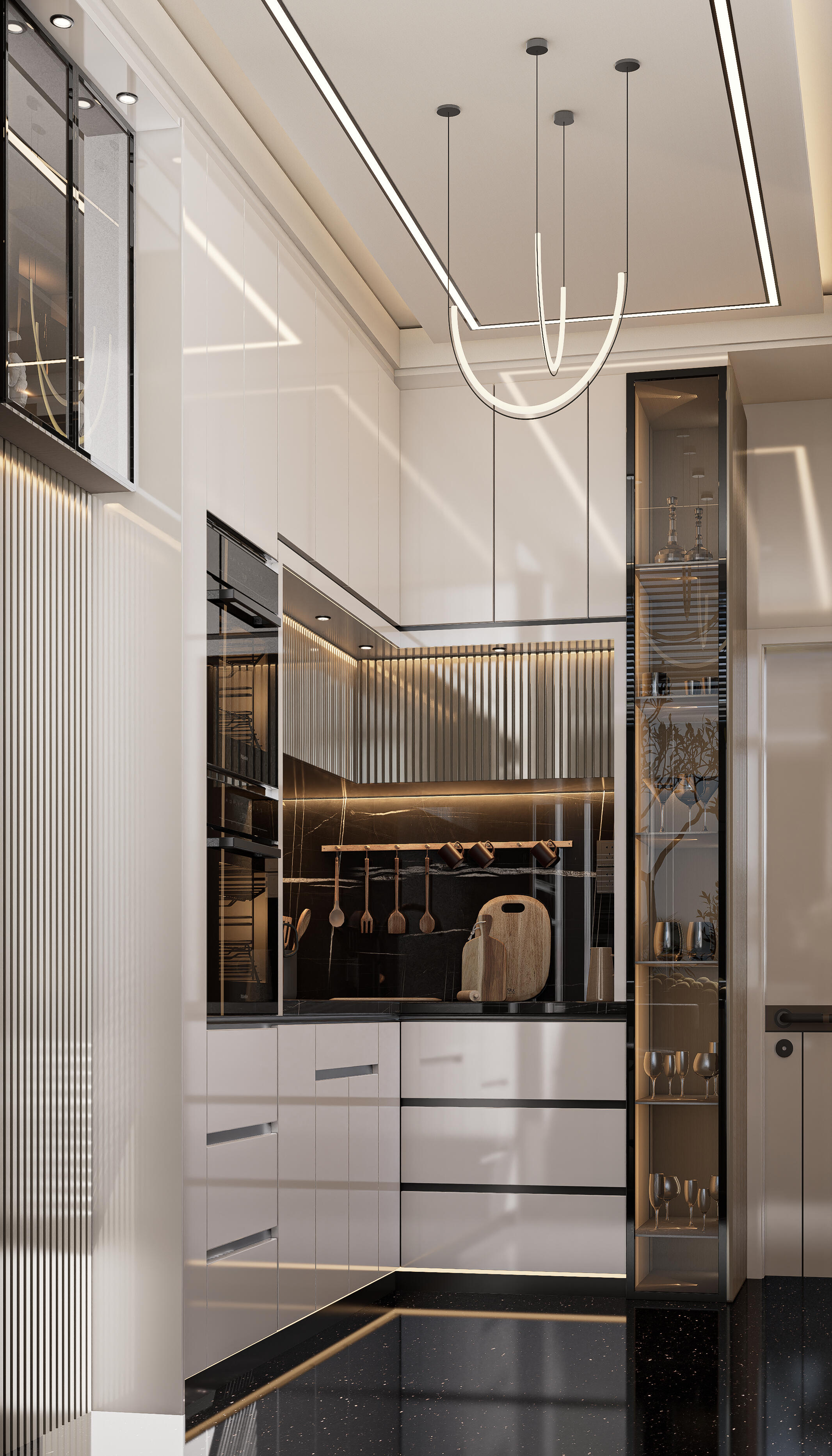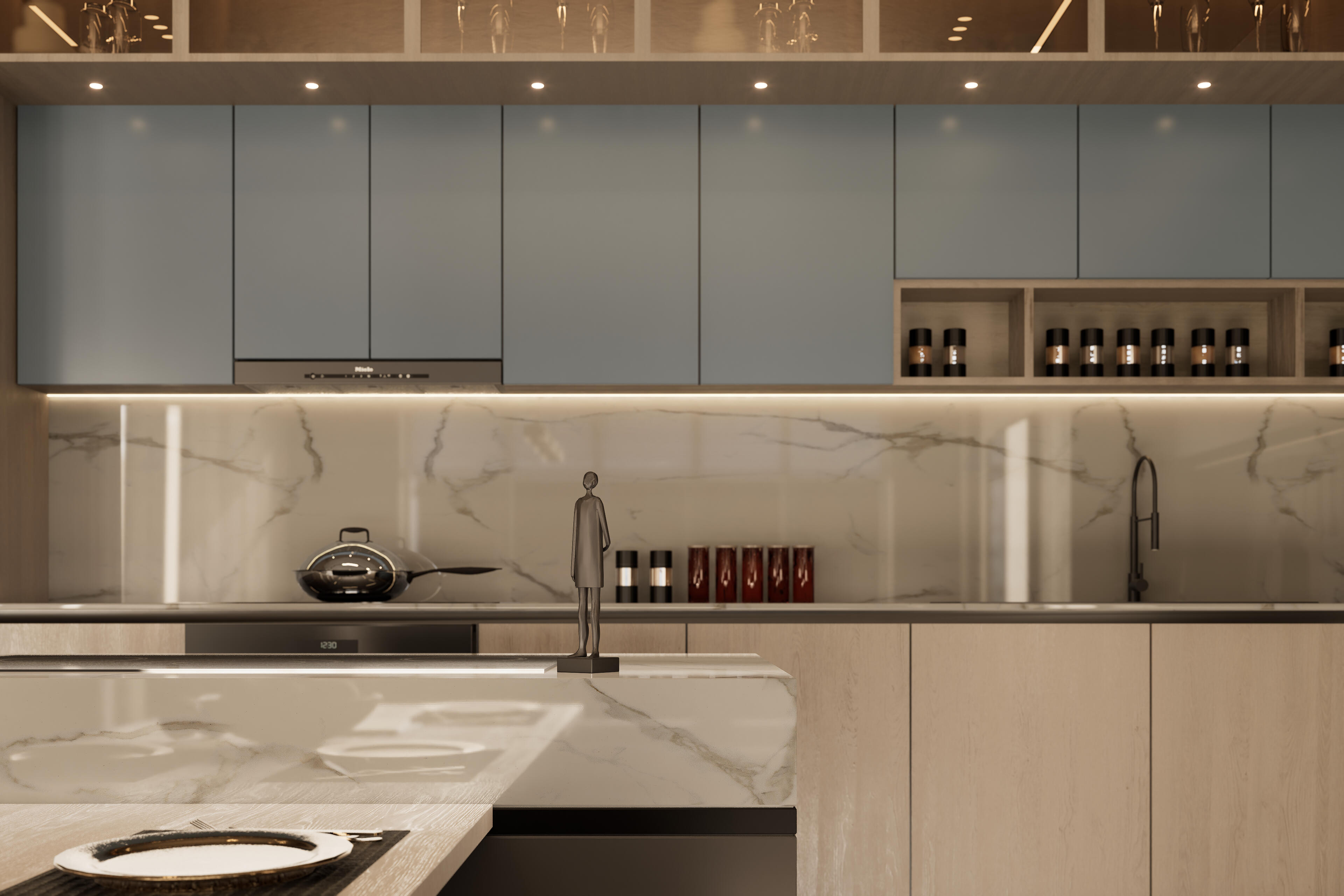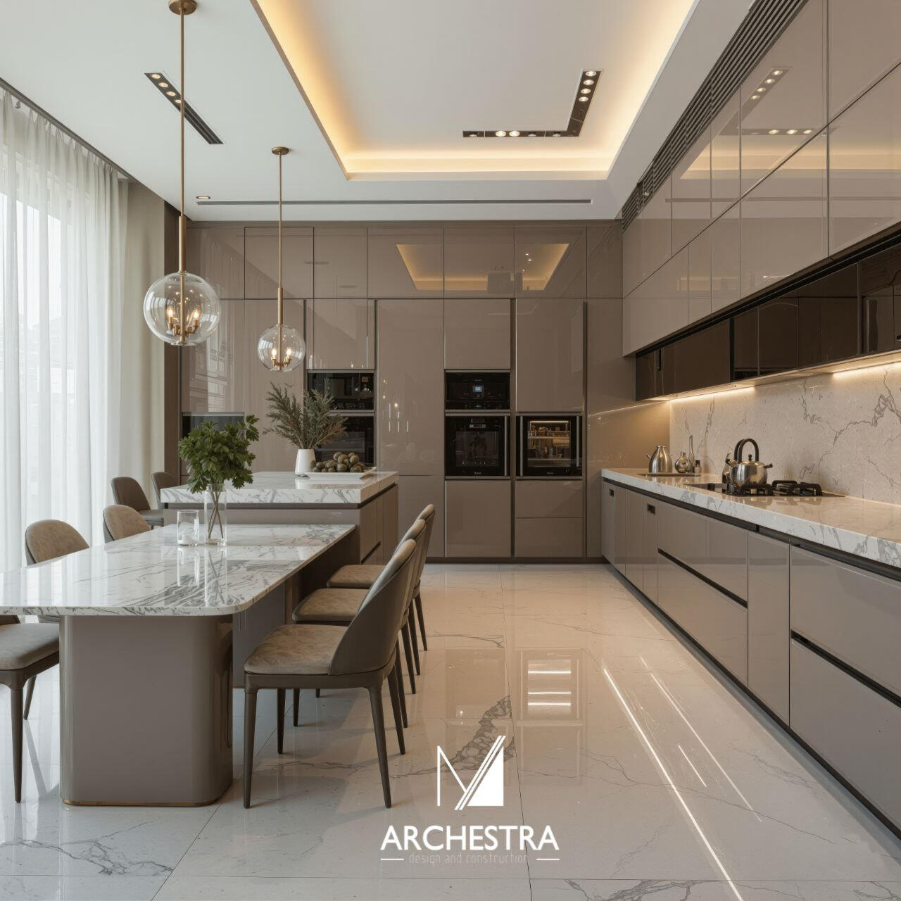 A refined modern kitchen defined by a harmonious blend of warm wood, soft matte finishes, and elegant marble surfaces. Clean lines and handle-less cabinetry create a seamless look, while integrated lighting highlights textures and adds depth. Glass display units and open shelving bring a sense of lightness and sophistication. The central island acts as both a functional workspace and a social focal point, embodying contemporary luxury with a calm, inviting atmosphere.