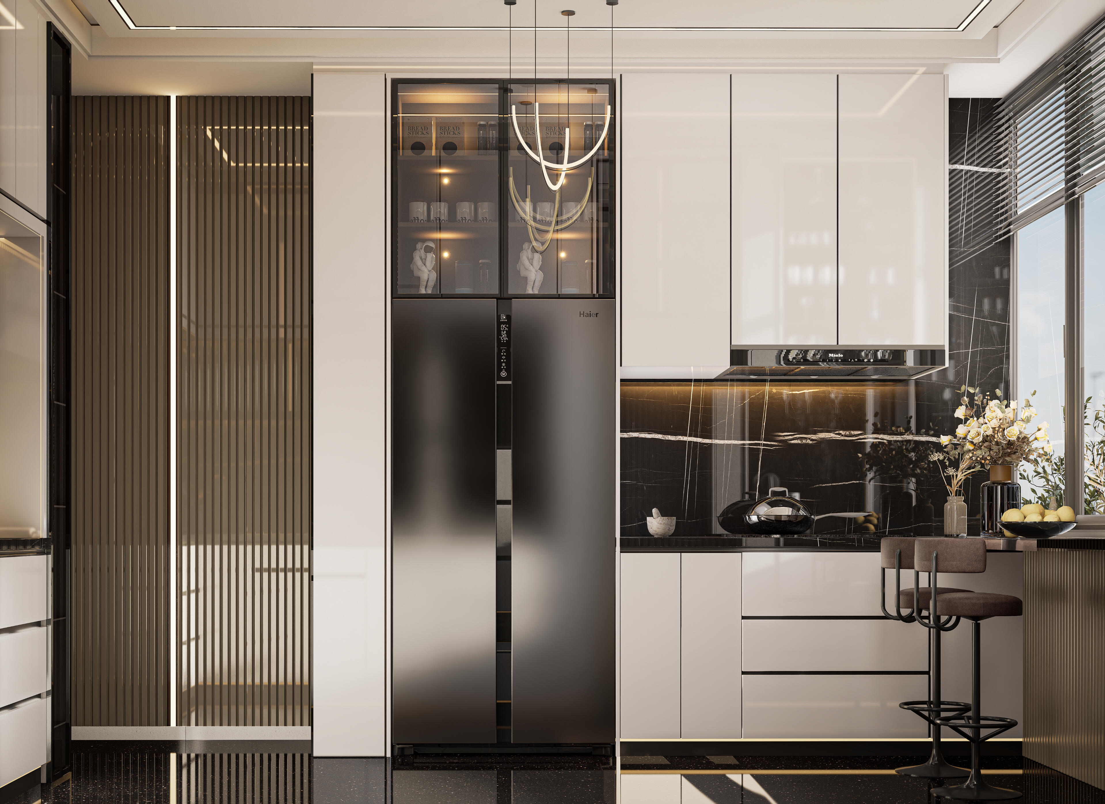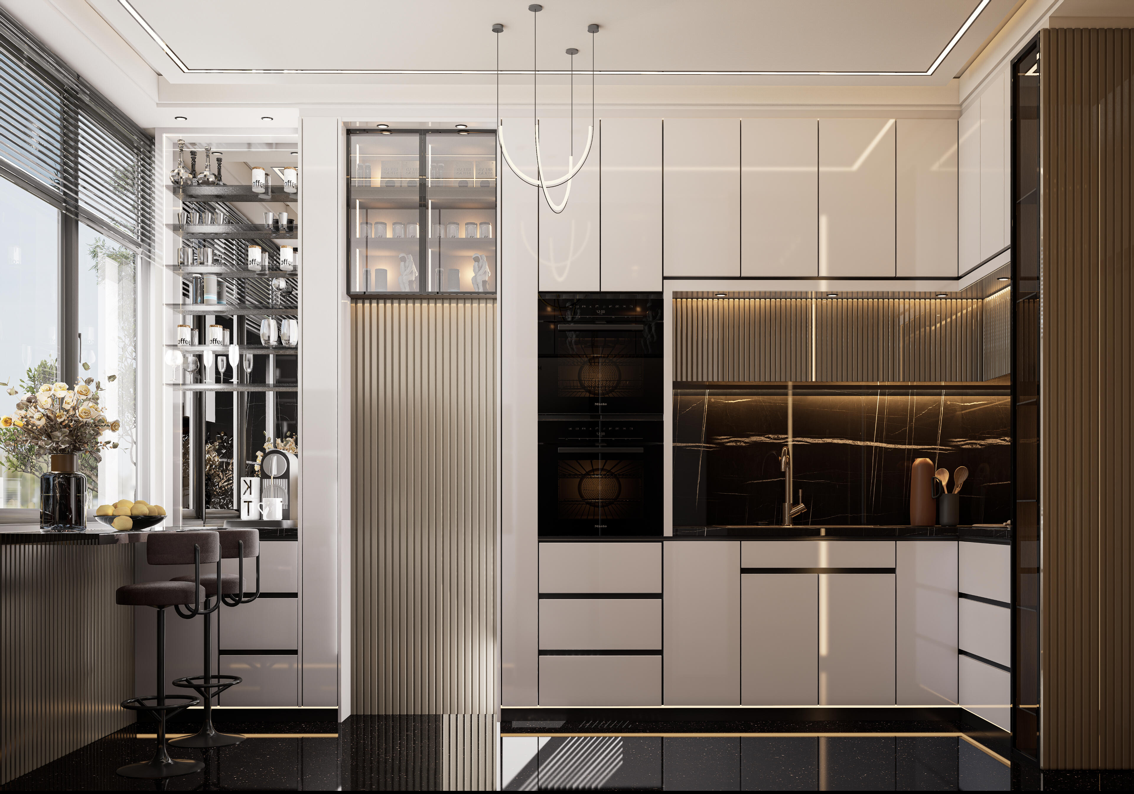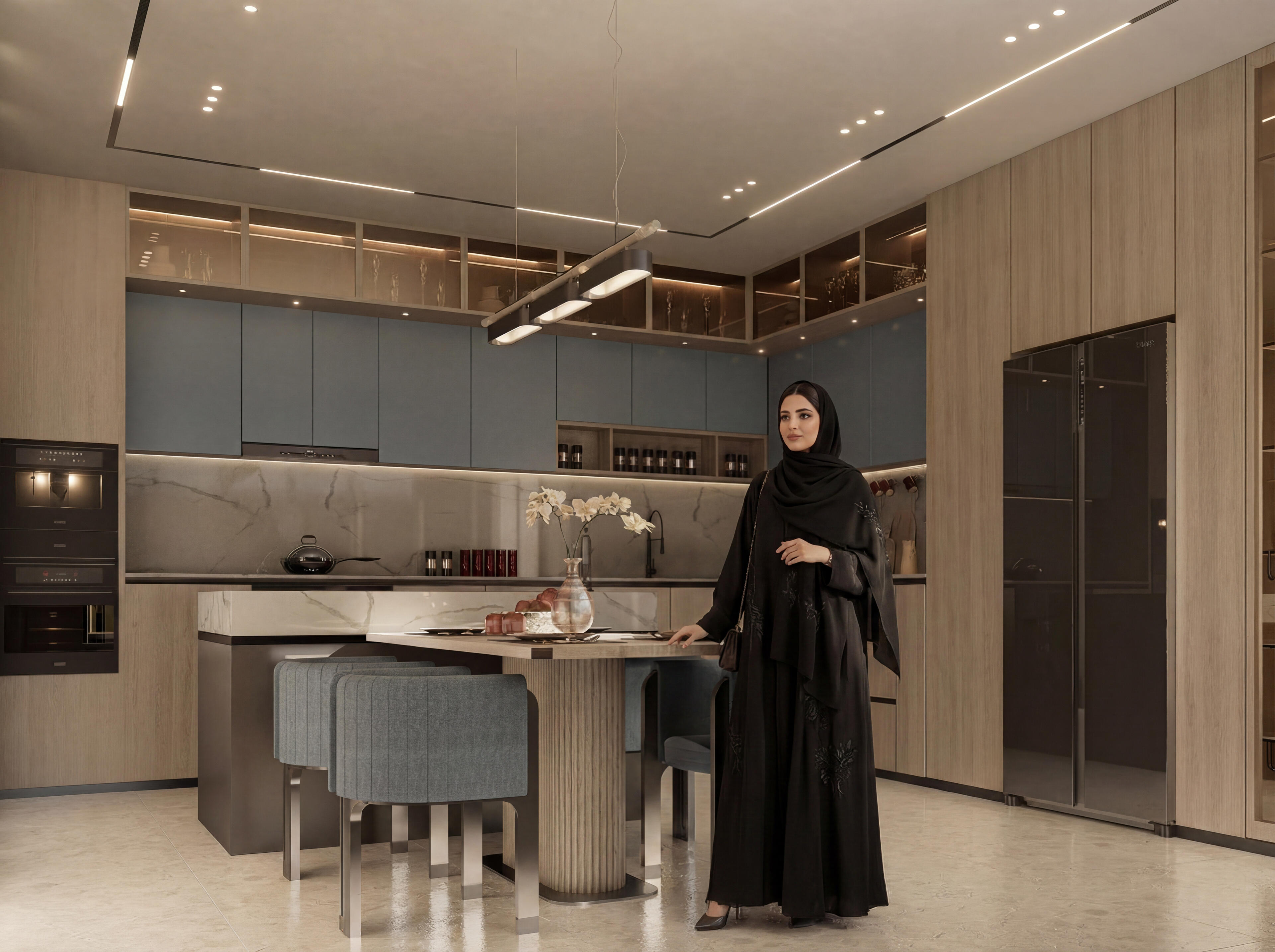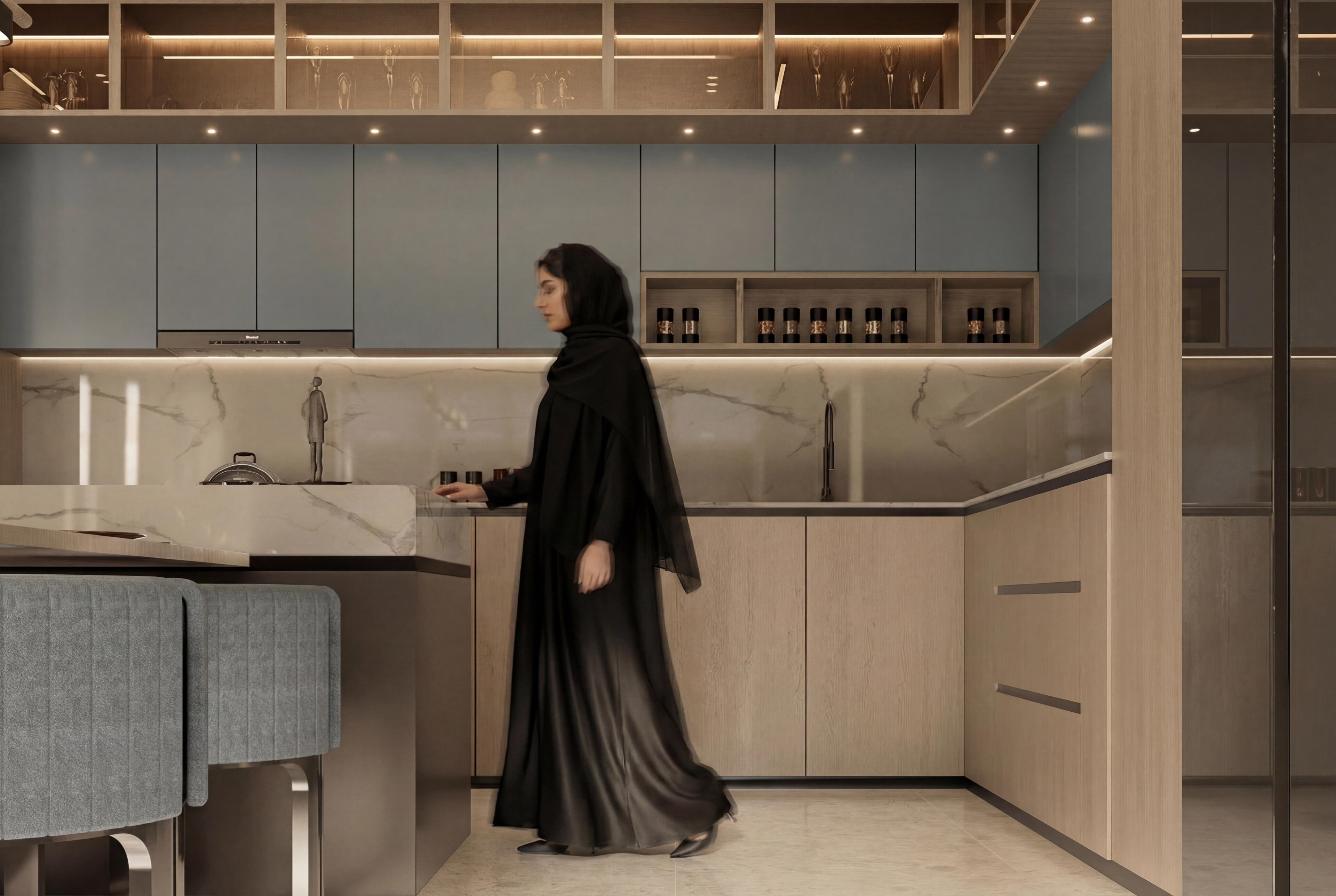 A refined modern kitchen defined by a harmonious blend of warm wood, soft matte finishes, and elegant marble surfaces. Clean lines and handle-less cabinetry create a seamless look, while integrated lighting highlights textures and adds depth. Glass display units and open shelving bring a sense of lightness and sophistication. The central island acts as both a functional workspace and a social focal point, embodying contemporary luxury with a calm, inviting atmosphere.