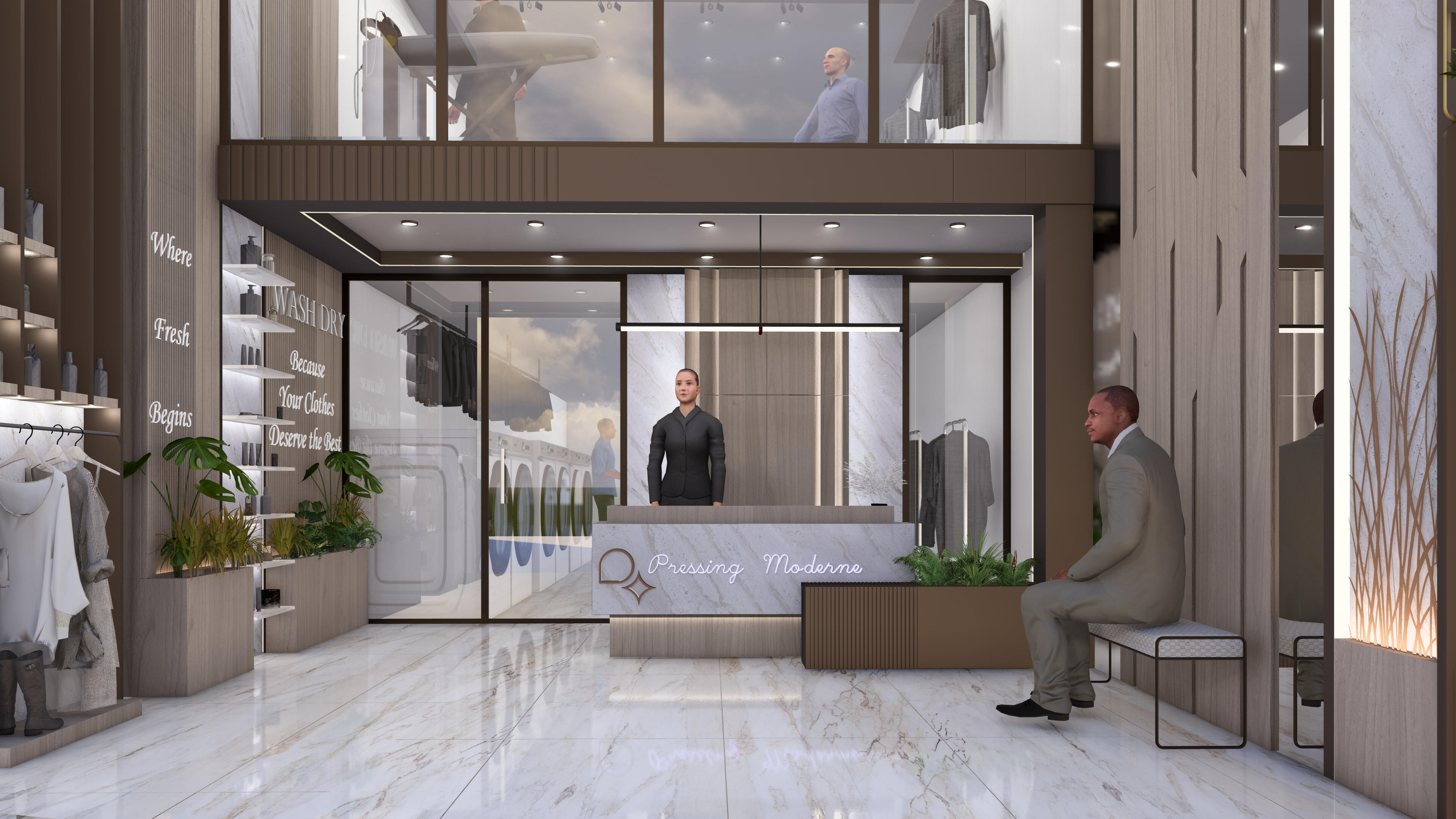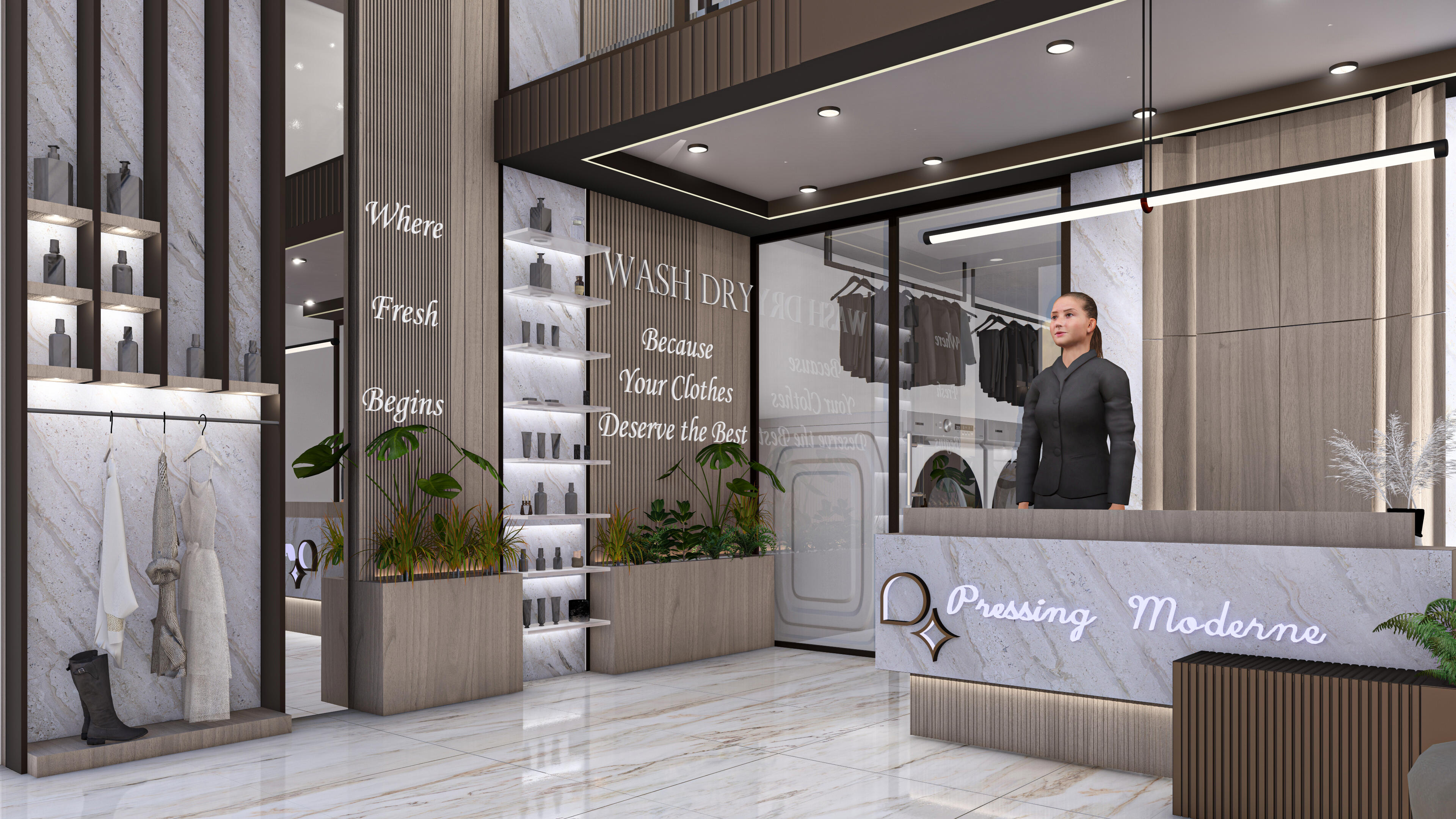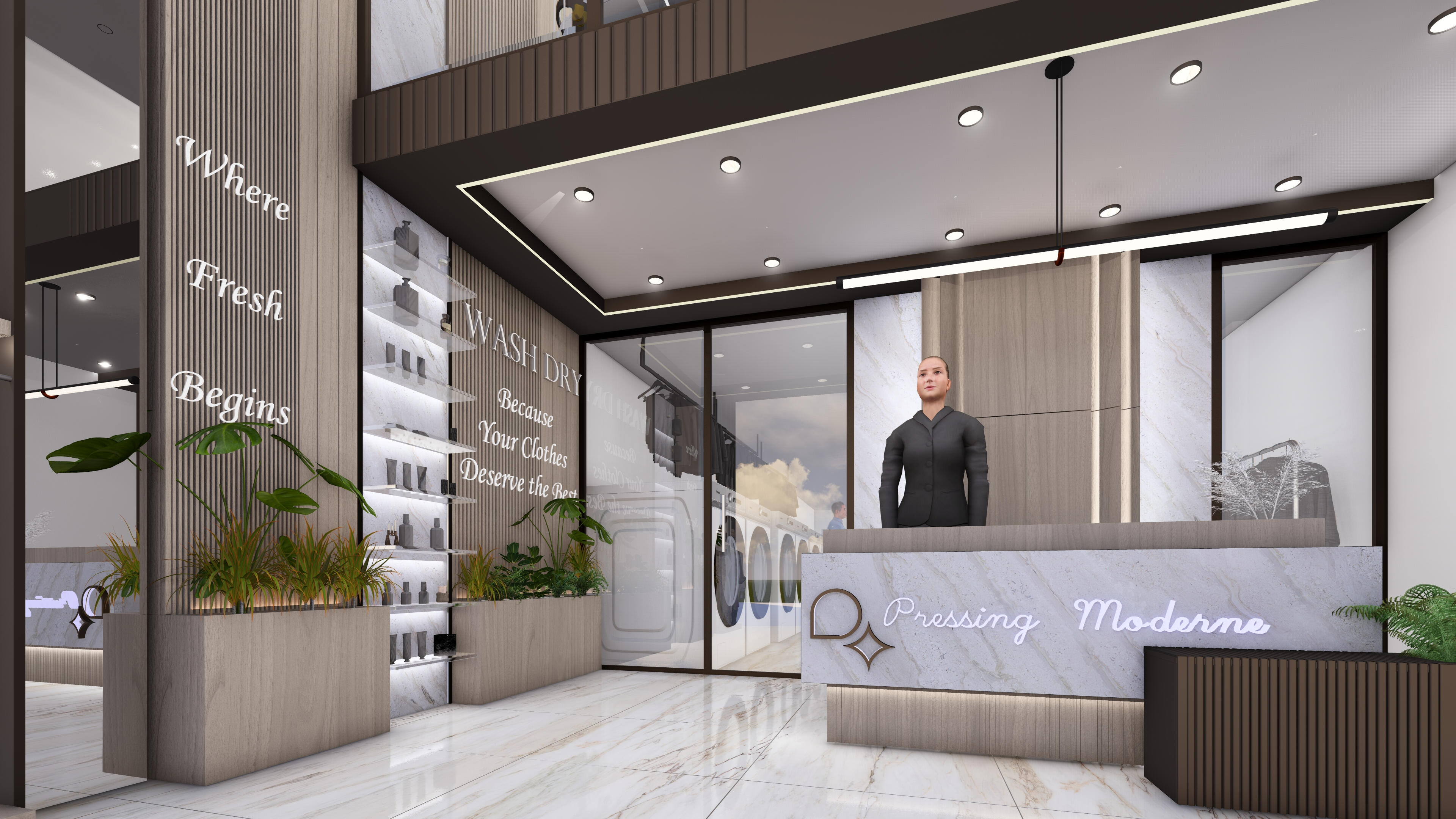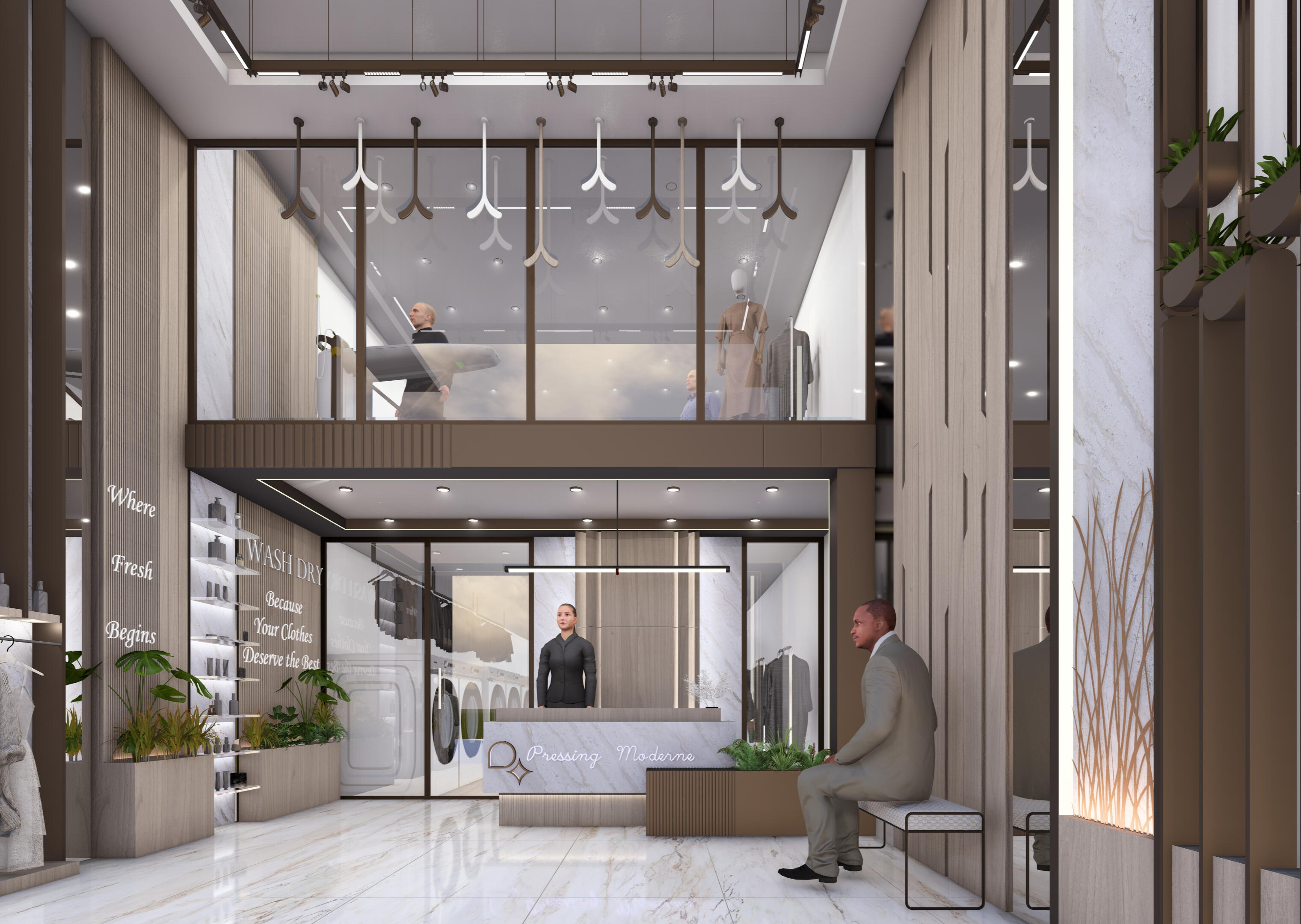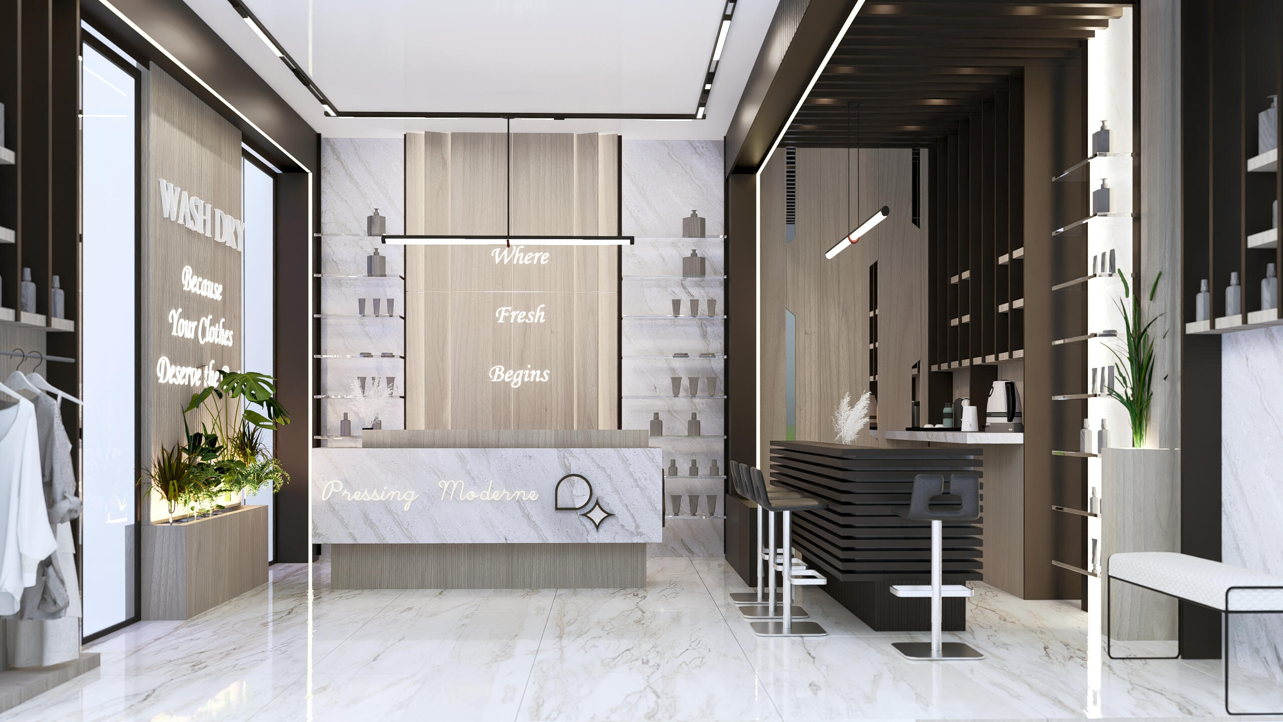 Transforming functionality into style. Our latest interior design project brings a modern, welcoming vibe to this laundry shop and reception area. Clean lines, chic details, and a space that makes laundry feel less like a chore.