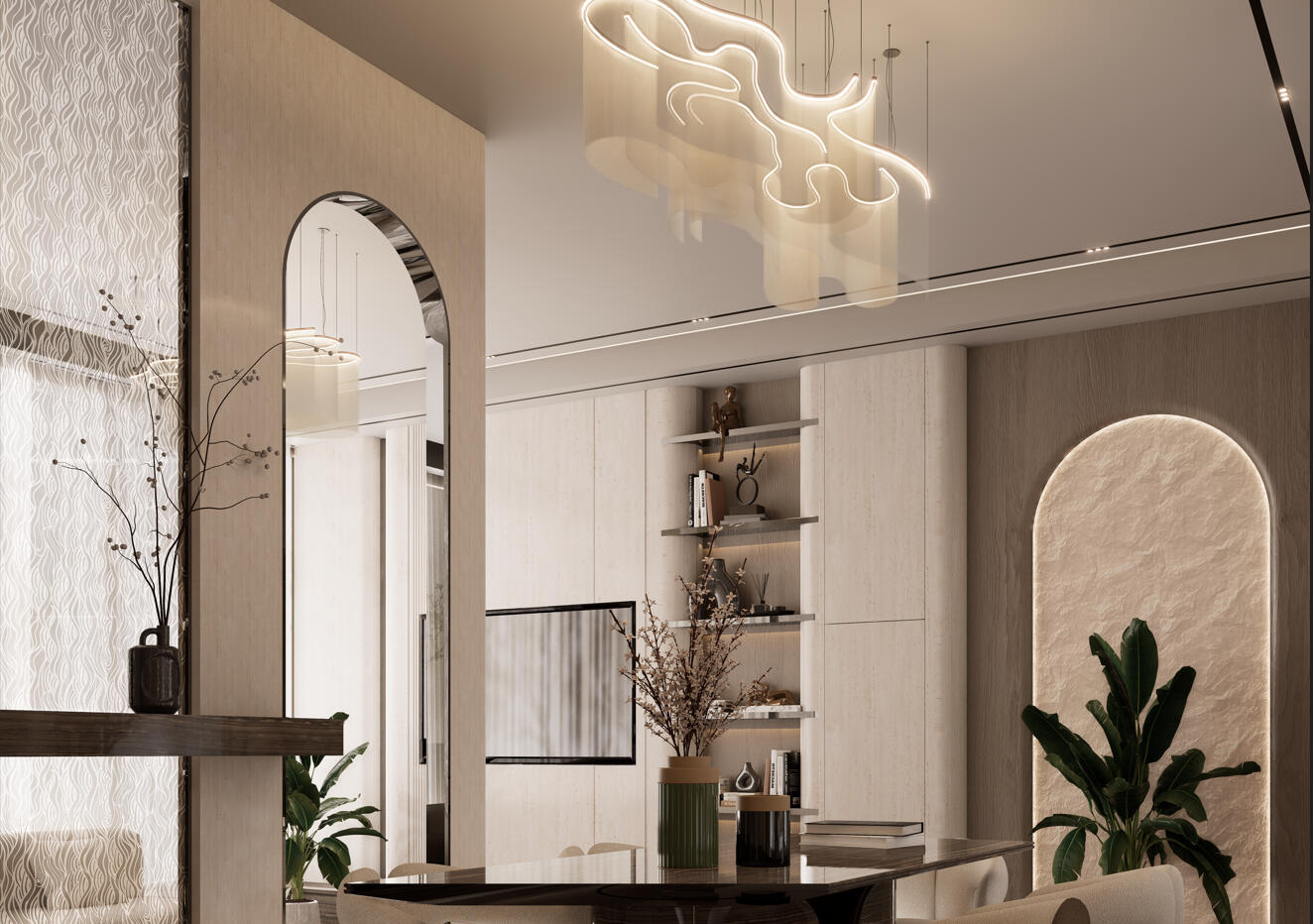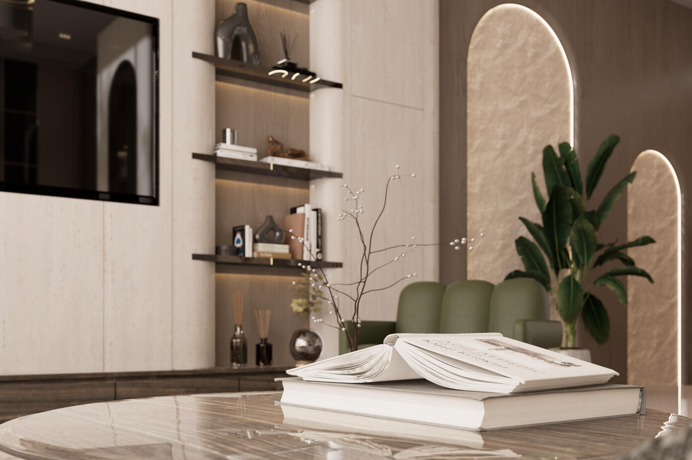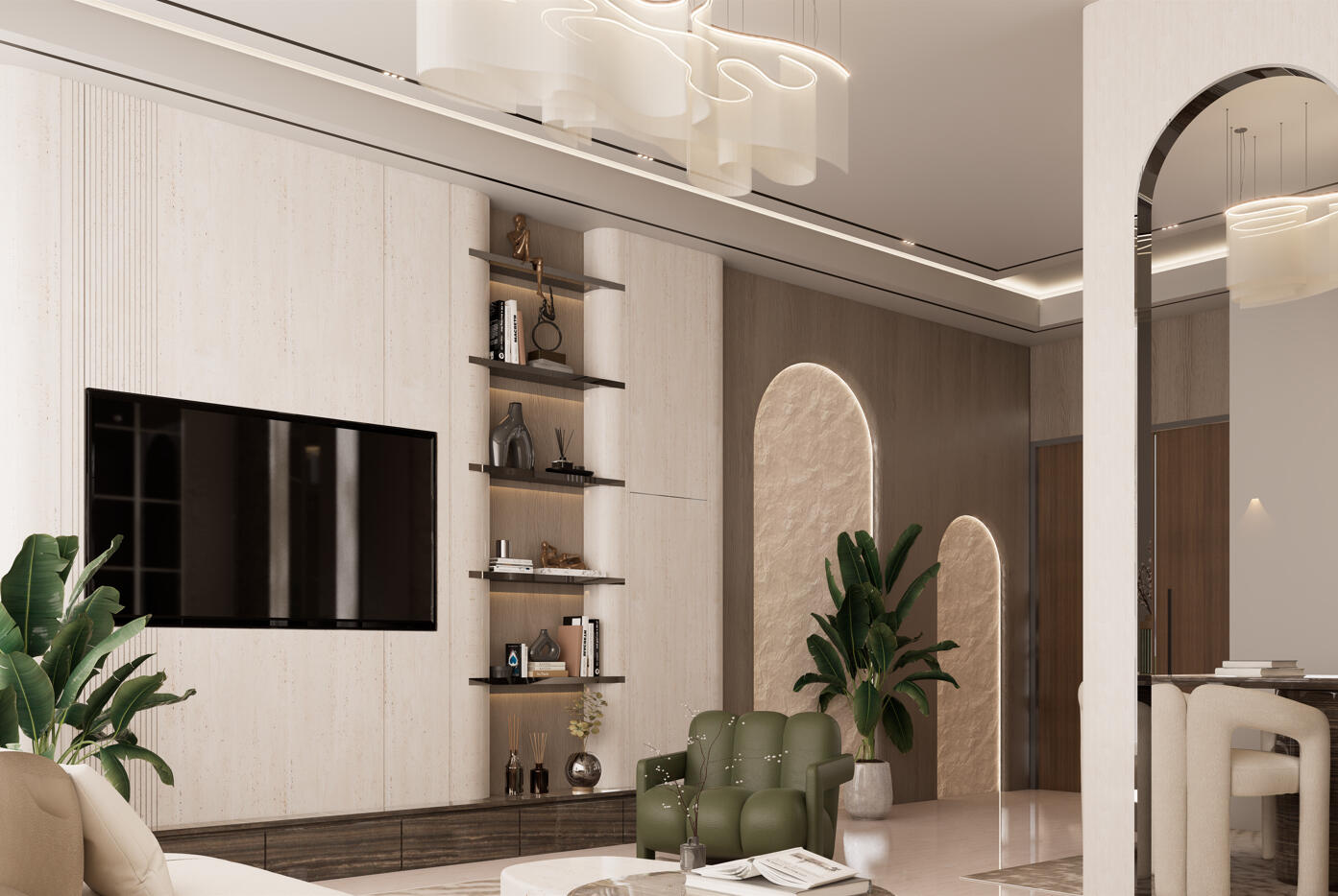 A serene living space shaped by soft textures, sculpted arches, and warm neutral tones. The layered lighting, bespoke shelving, and natural greenery create a harmony that feels both modern and timeless.