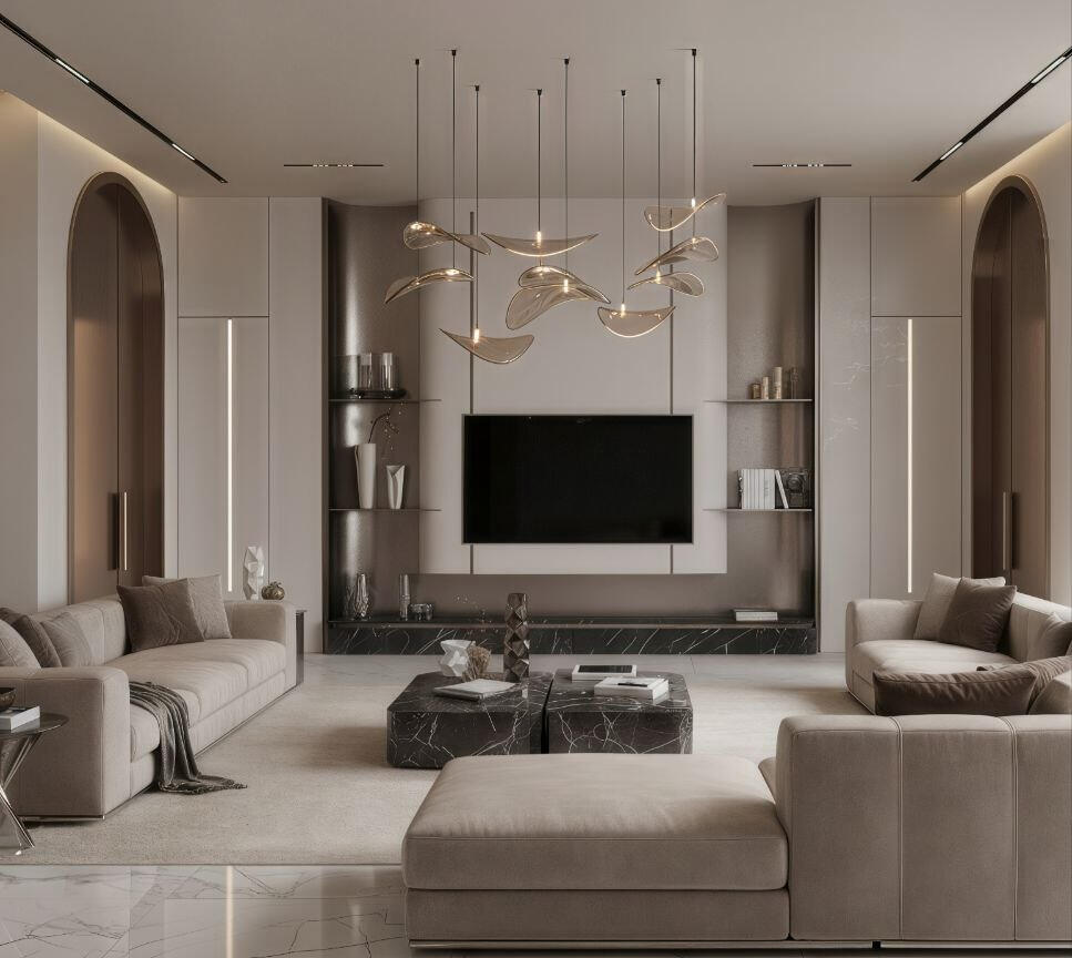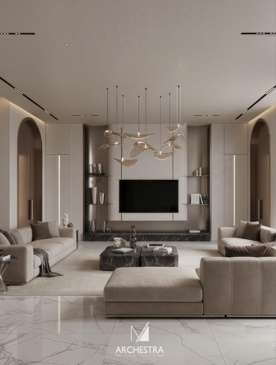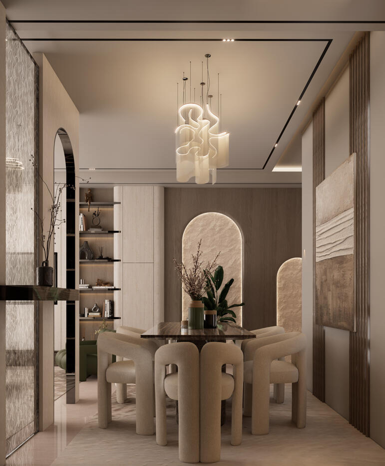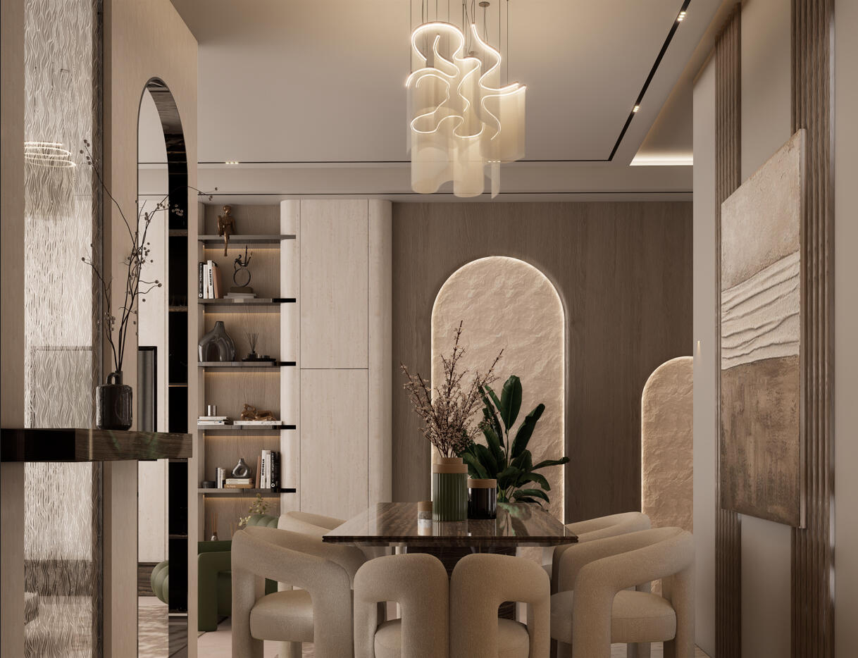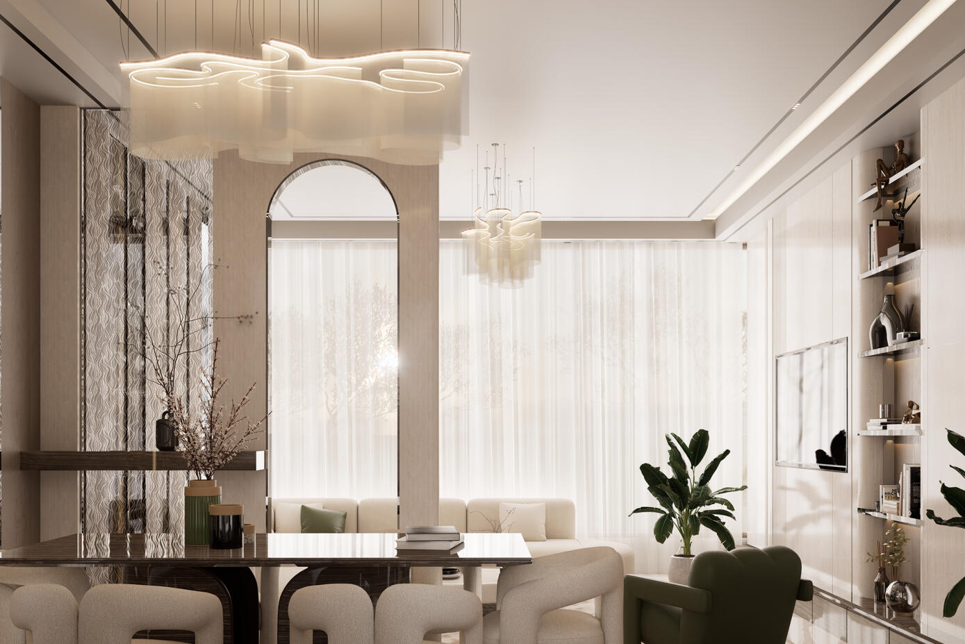 A serene living space shaped by soft textures, sculpted arches, and warm neutral tones. The layered lighting, bespoke shelving, and natural greenery create a harmony that feels both modern and timeless.