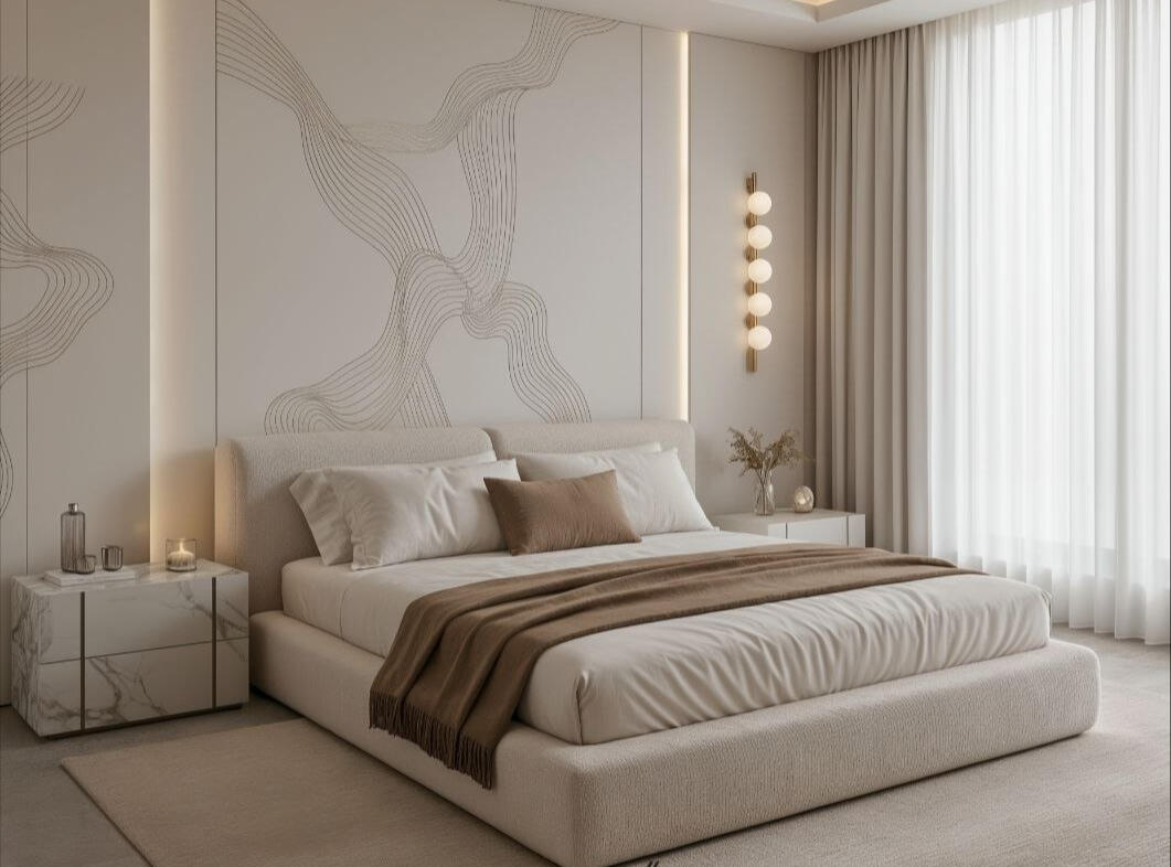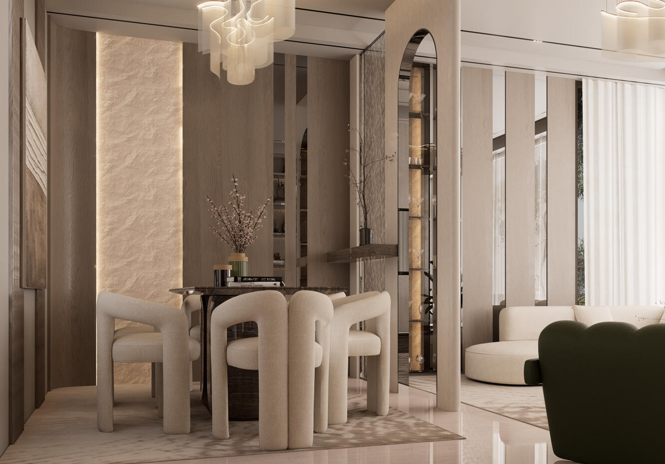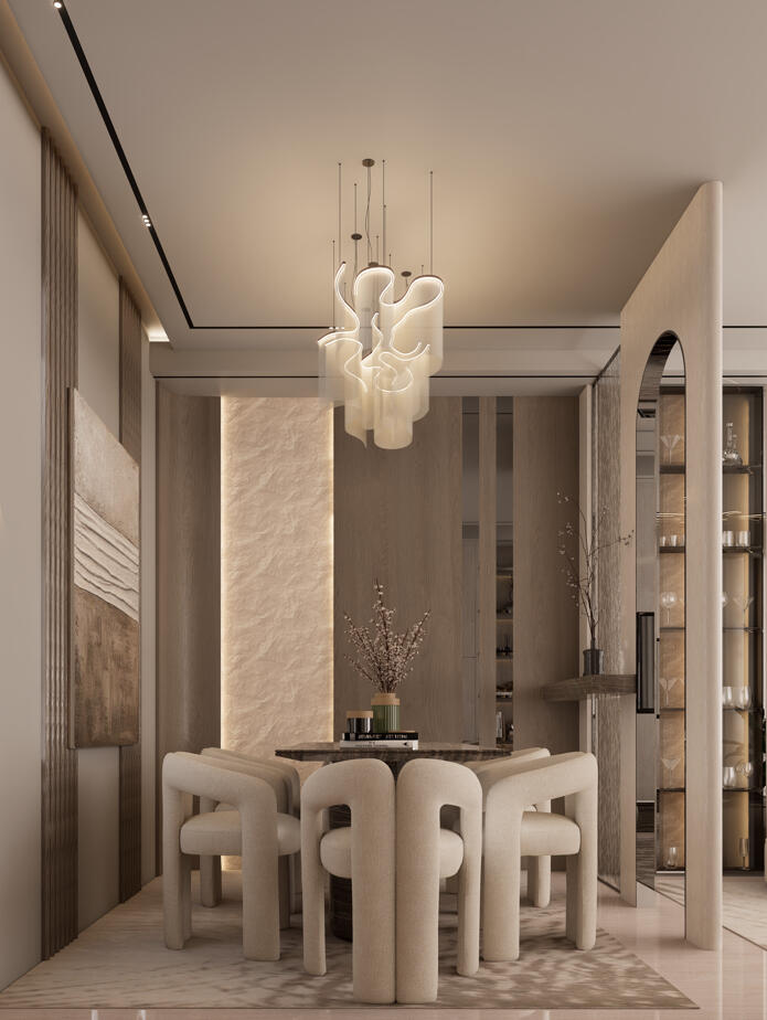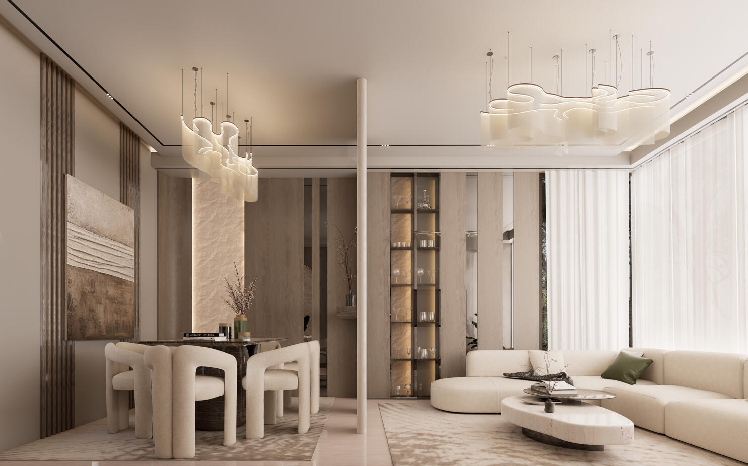 A serene living space shaped by soft textures, sculpted arches, and warm neutral tones. The layered lighting, bespoke shelving, and natural greenery create a harmony that feels both modern and timeless.