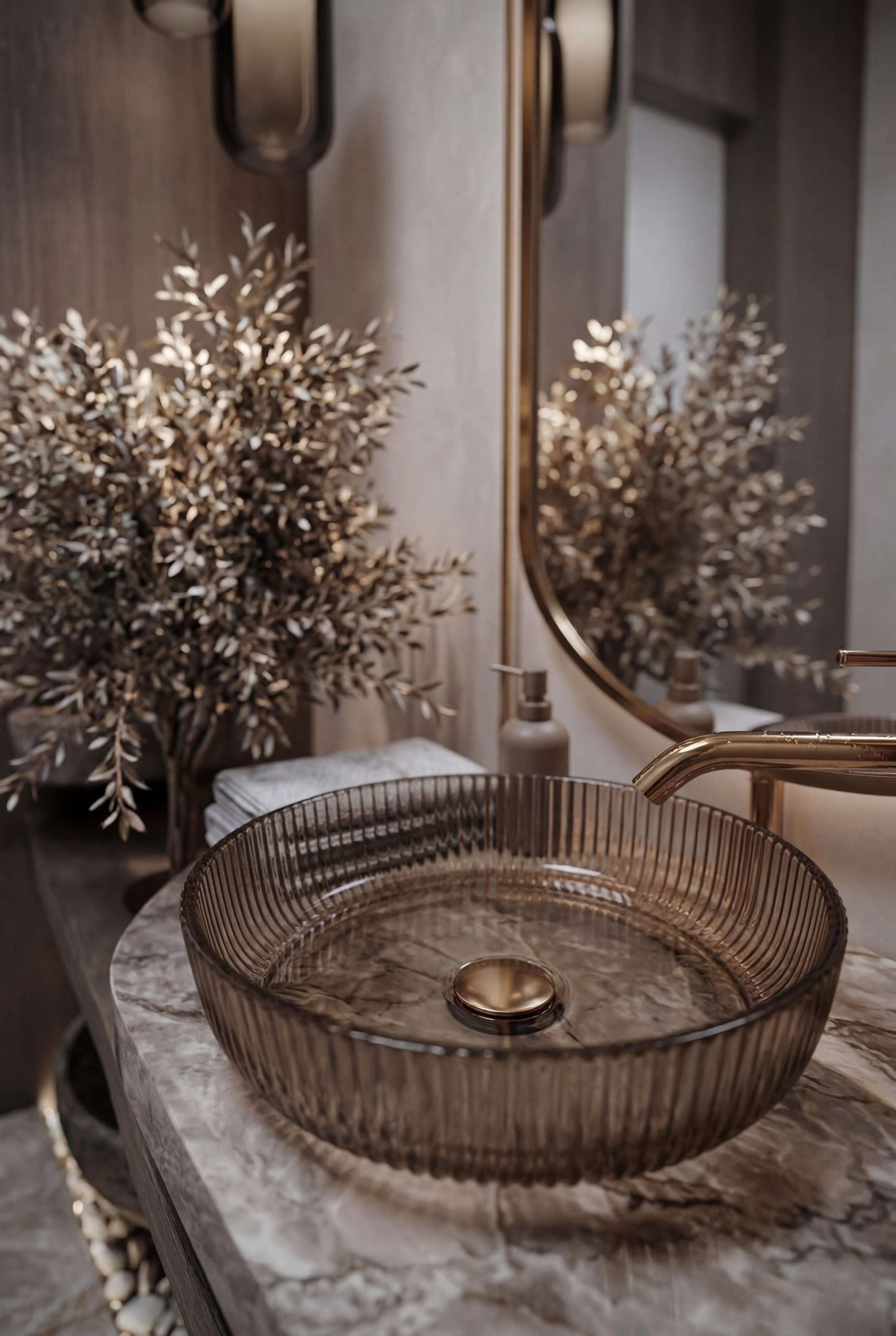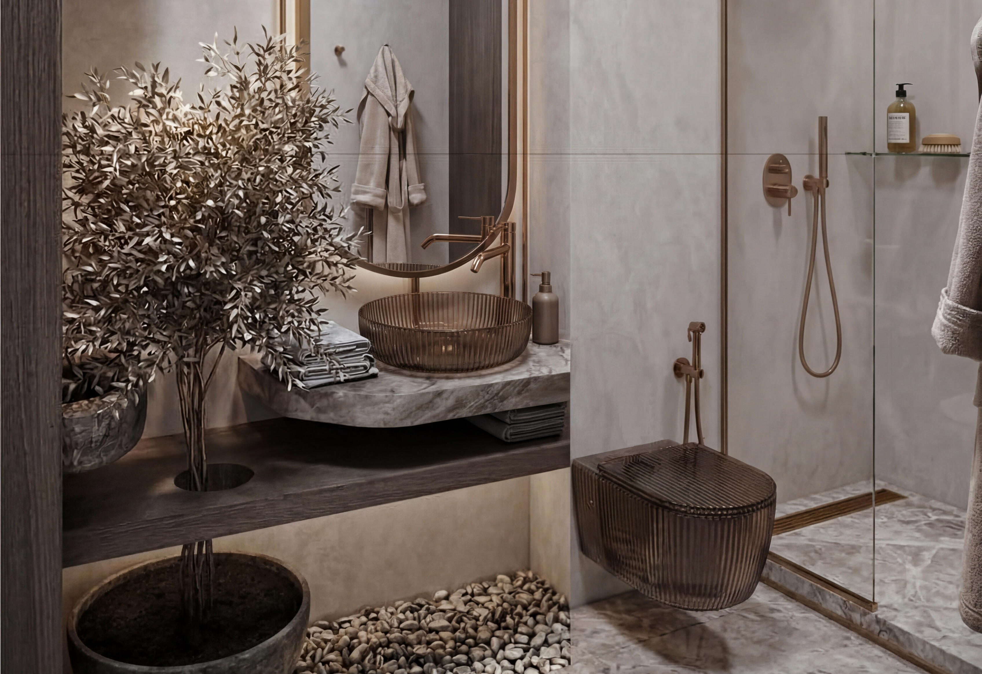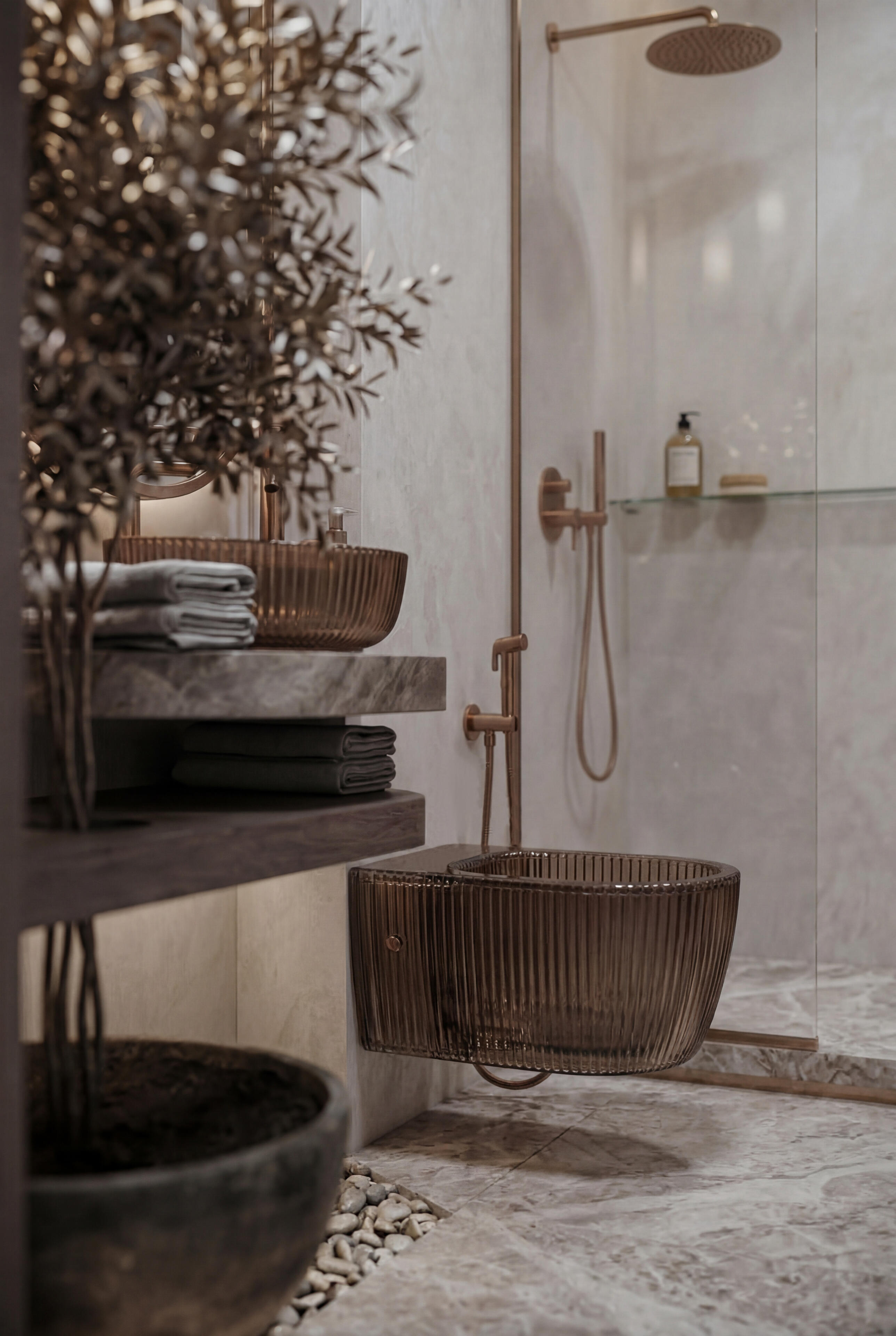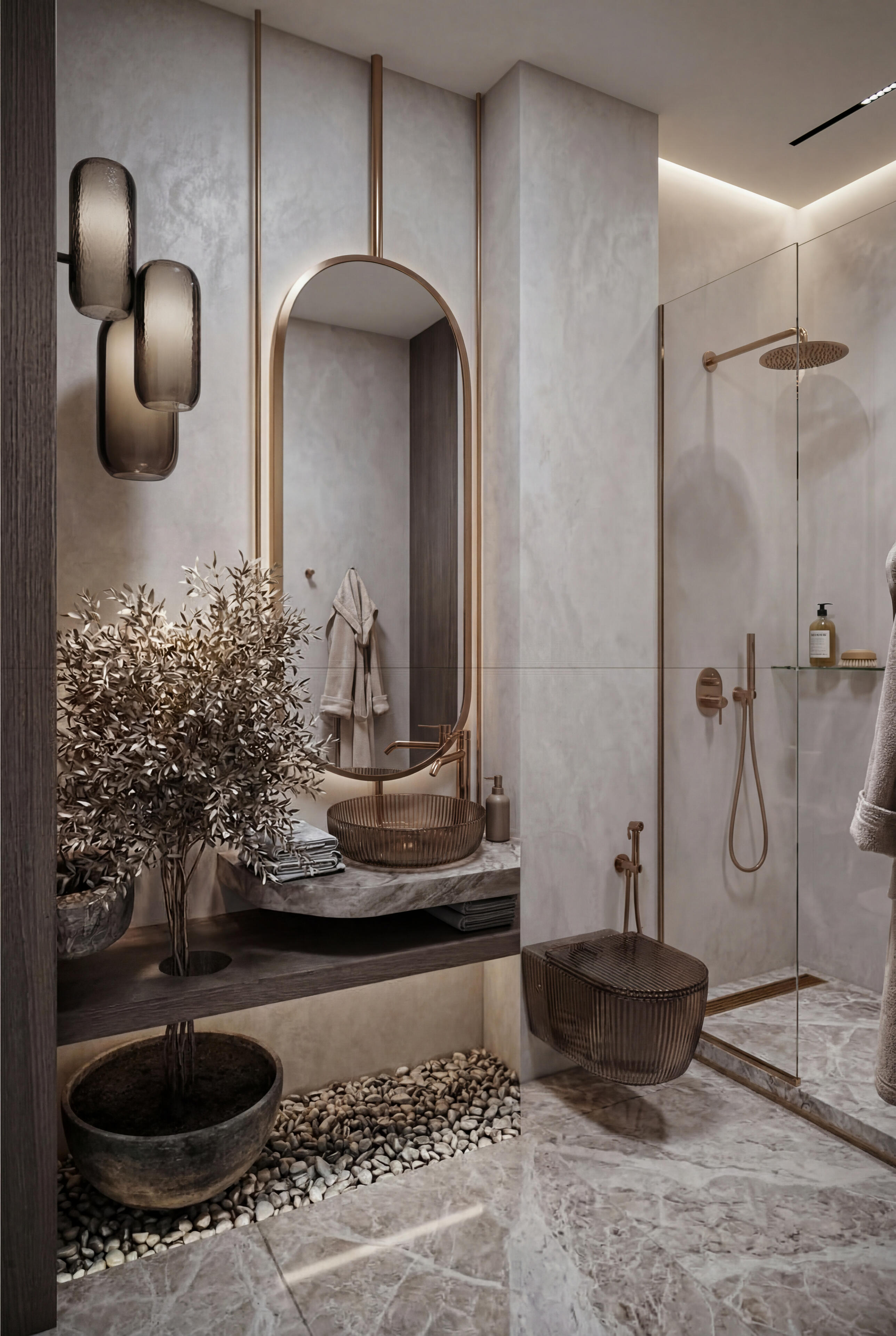 A sleek modern toilet defined by transparent glass fixtures paired with luxurious marble finishes, creating a refined and airy ambiance. Clean lines and minimal detailing enhance the sense of space, while the marble surfaces add depth and timeless elegance. Glass elements—whether in partitions or vanities—reflect light and elevate the overall sophistication. Subtle integrated lighting completes the design, delivering a calm, spa-like atmosphere rooted in contemporary luxury.