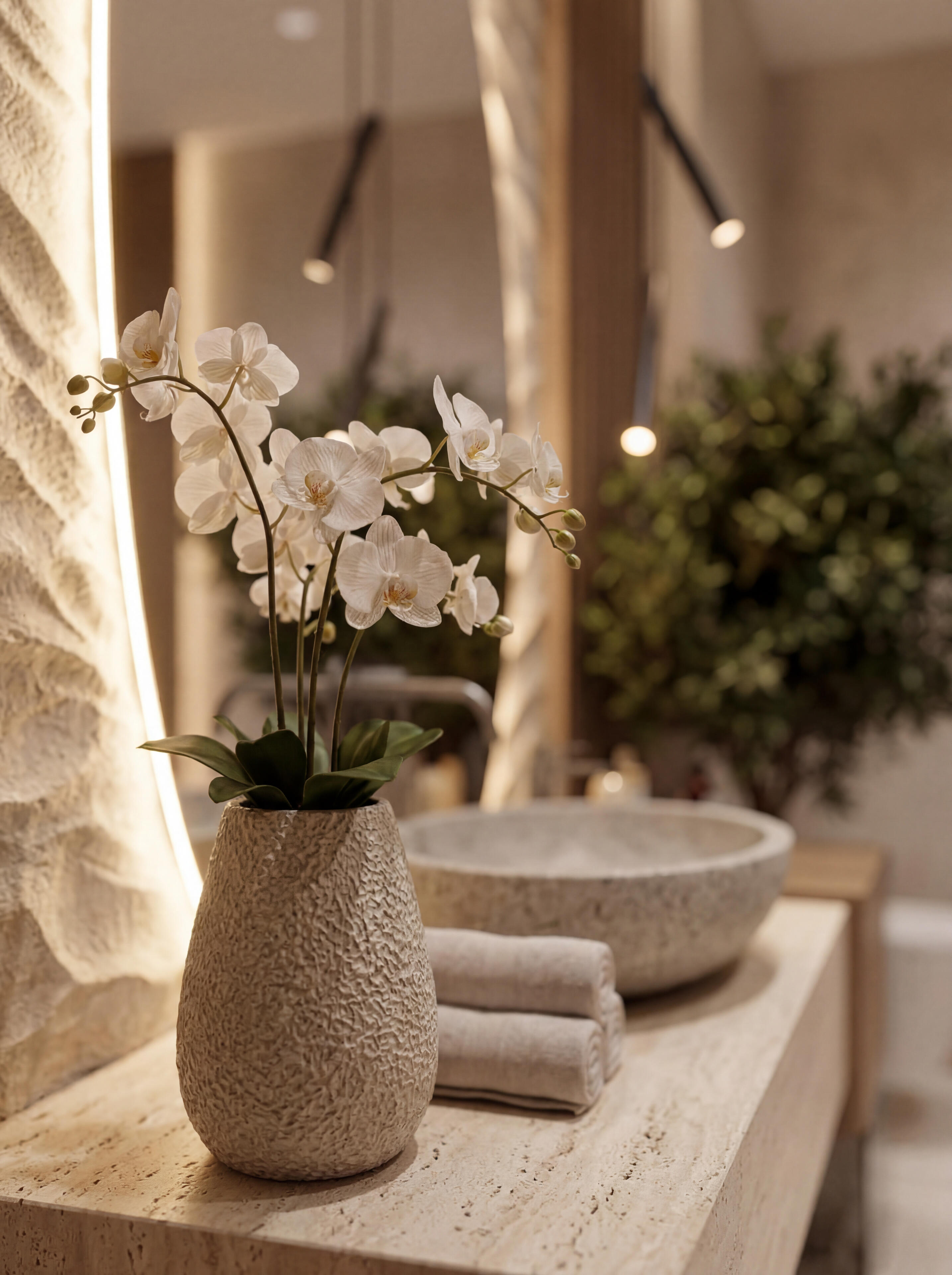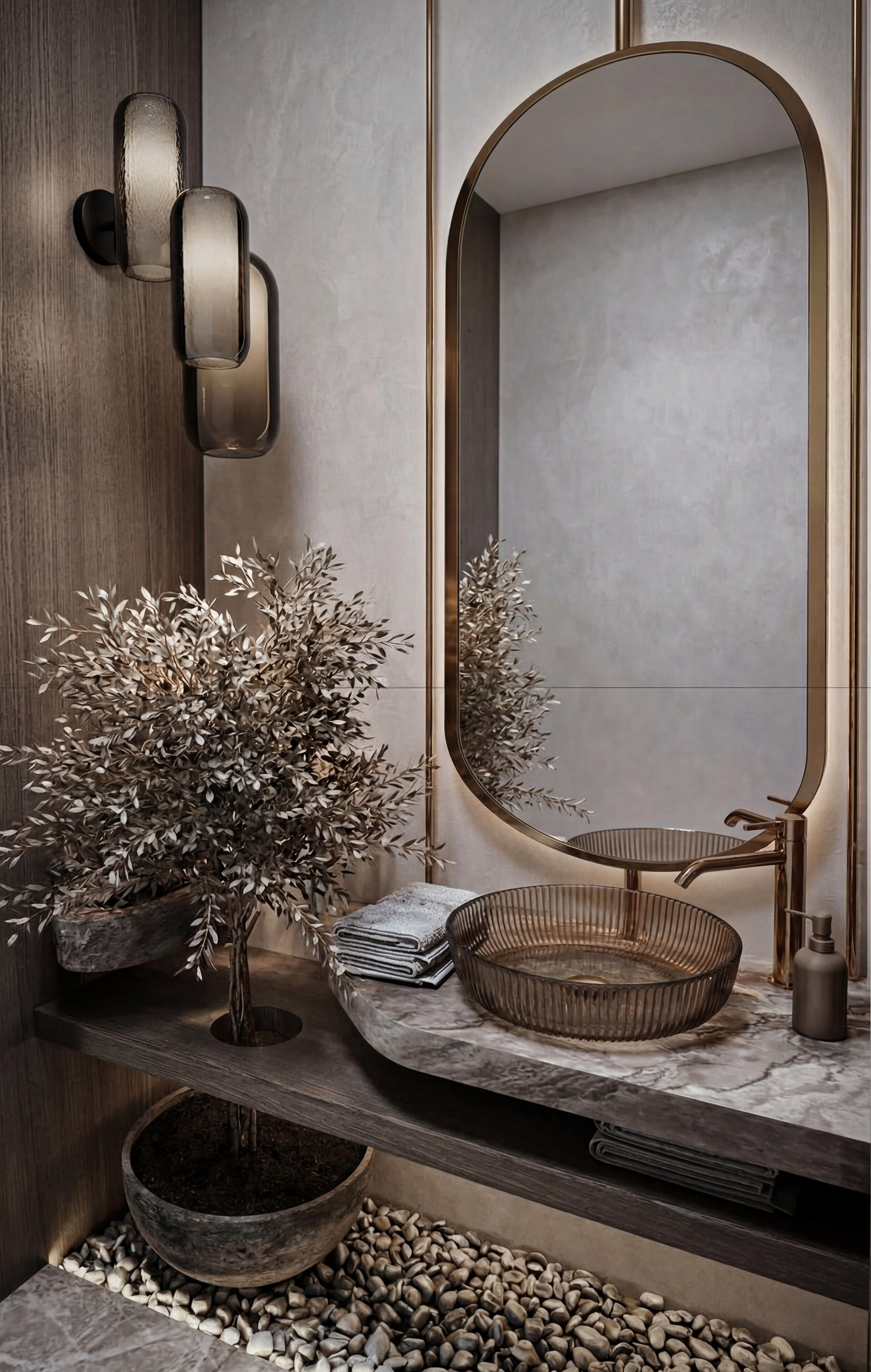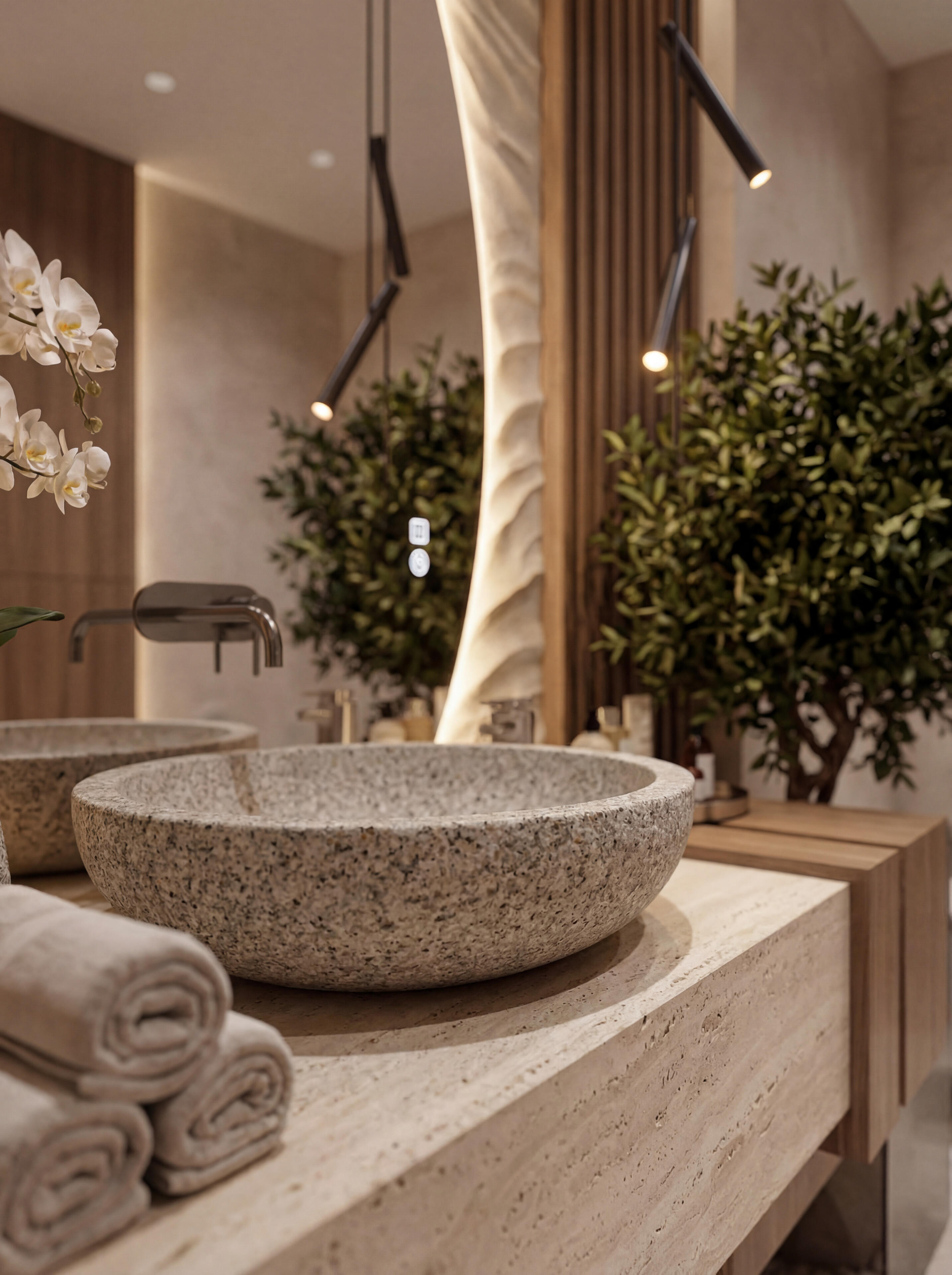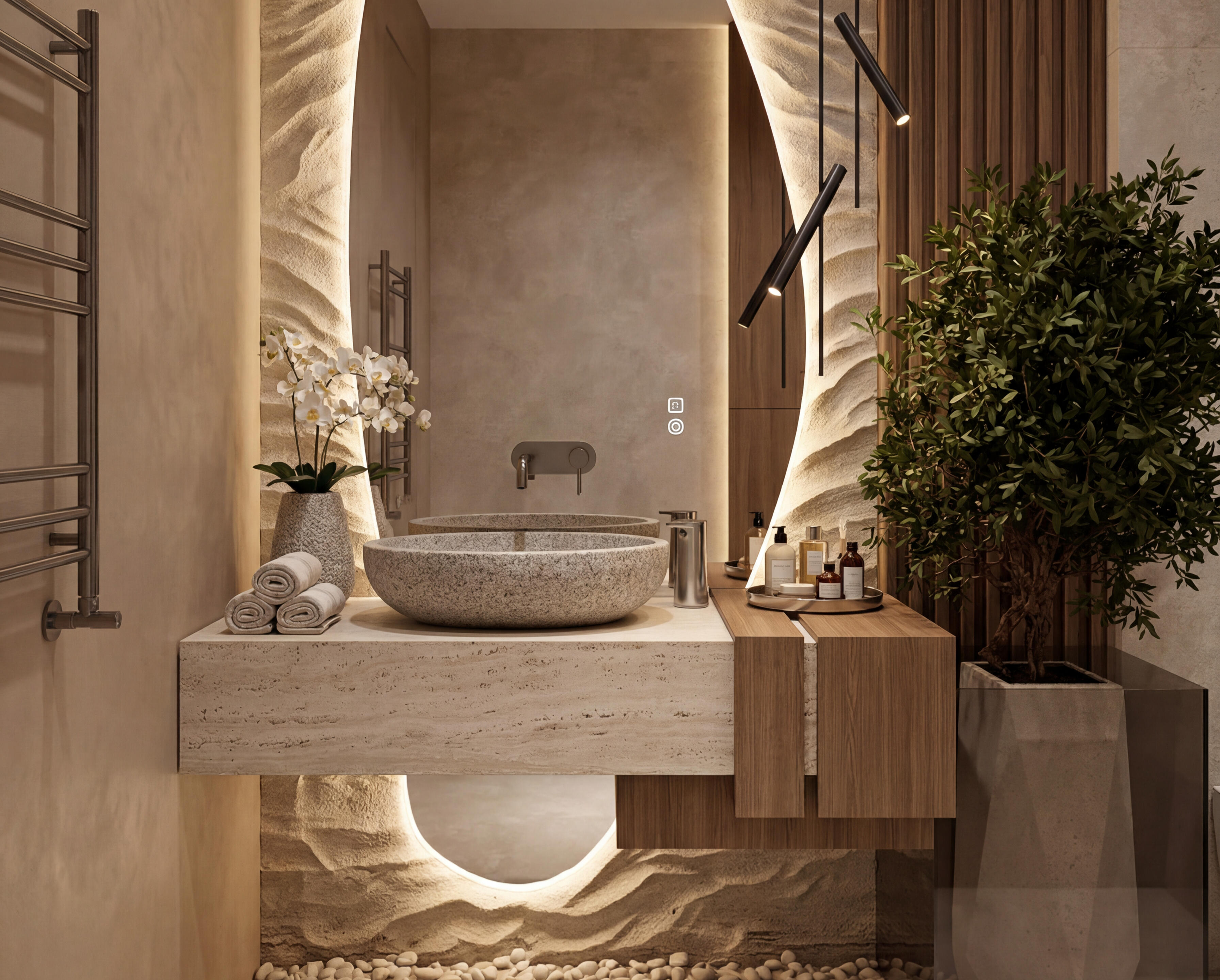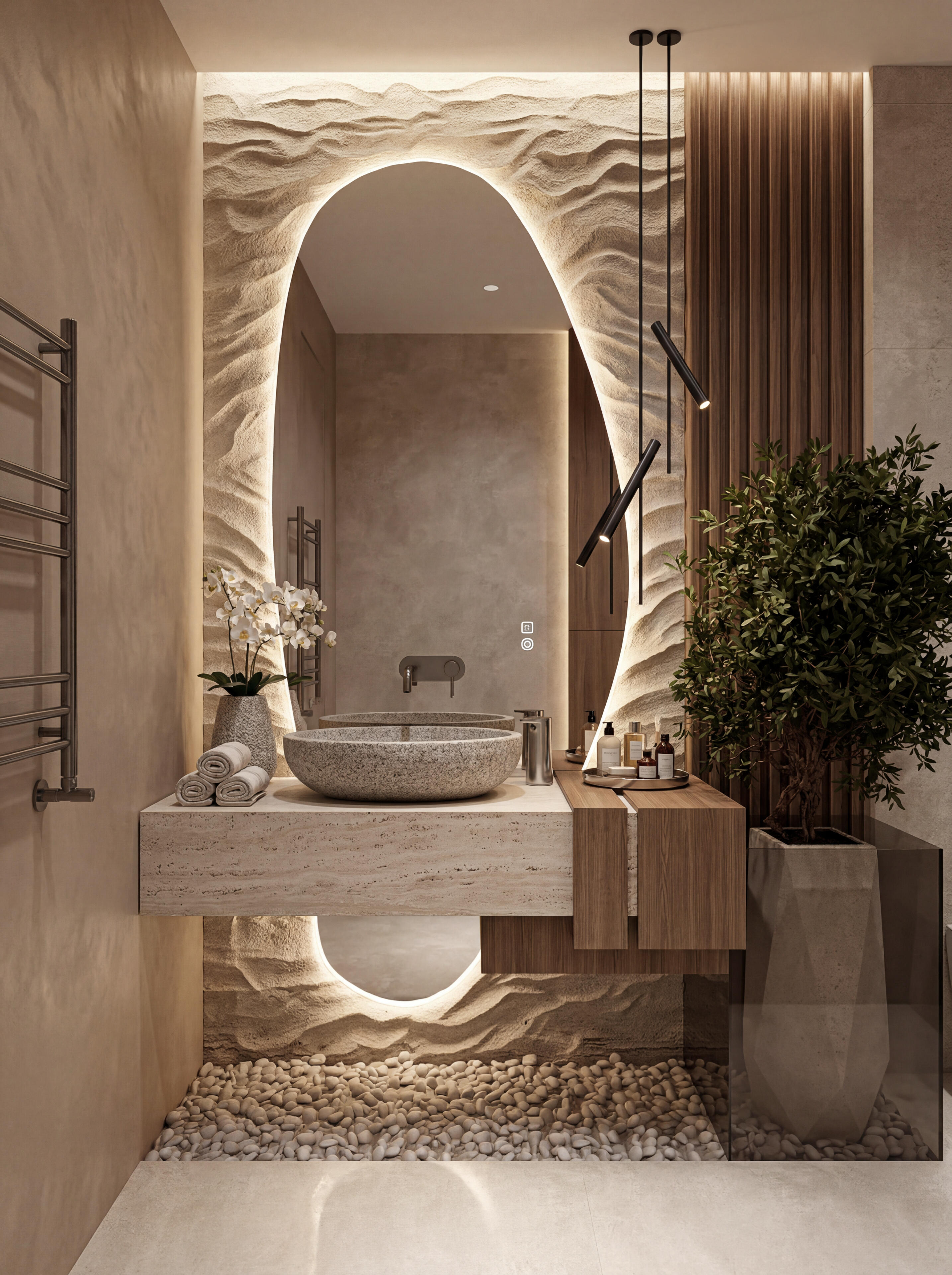 A serene modern toilet defined by an organic free-form mirror that softens the space and adds a sculptural focal point. Warm travertine finishes wrap the walls and surfaces, bringing natural texture and timeless elegance. Clean, minimal fixtures contrast gently with the fluid shapes, creating a balanced composition. Soft integrated lighting enhances the stone’s depth, resulting in a calm, spa-like atmosphere rooted in natural luxury.