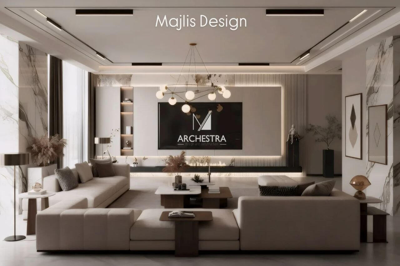 A modern majlis designed with clean and simple lines, where minimalism meets quiet elegance. Soft neutral tones, refined textures, and low-profile seating create a calm and inviting atmosphere. Subtle details in lighting and materials add depth without overwhelming the space. The result is a balanced, sophisticated setting that reflects comfort, tradition, and contemporary simplicity.